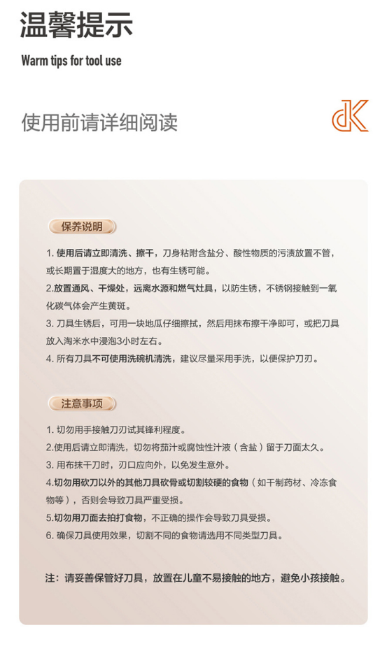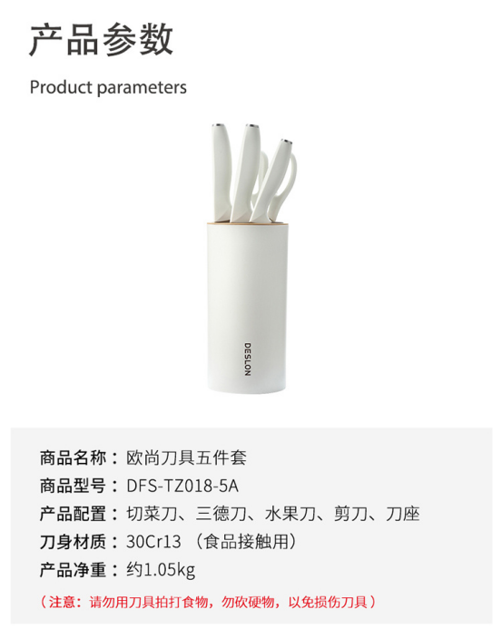 【产品配置】:切菜刀、三德刀、水果刀、厨房剪、圆桶刀座
