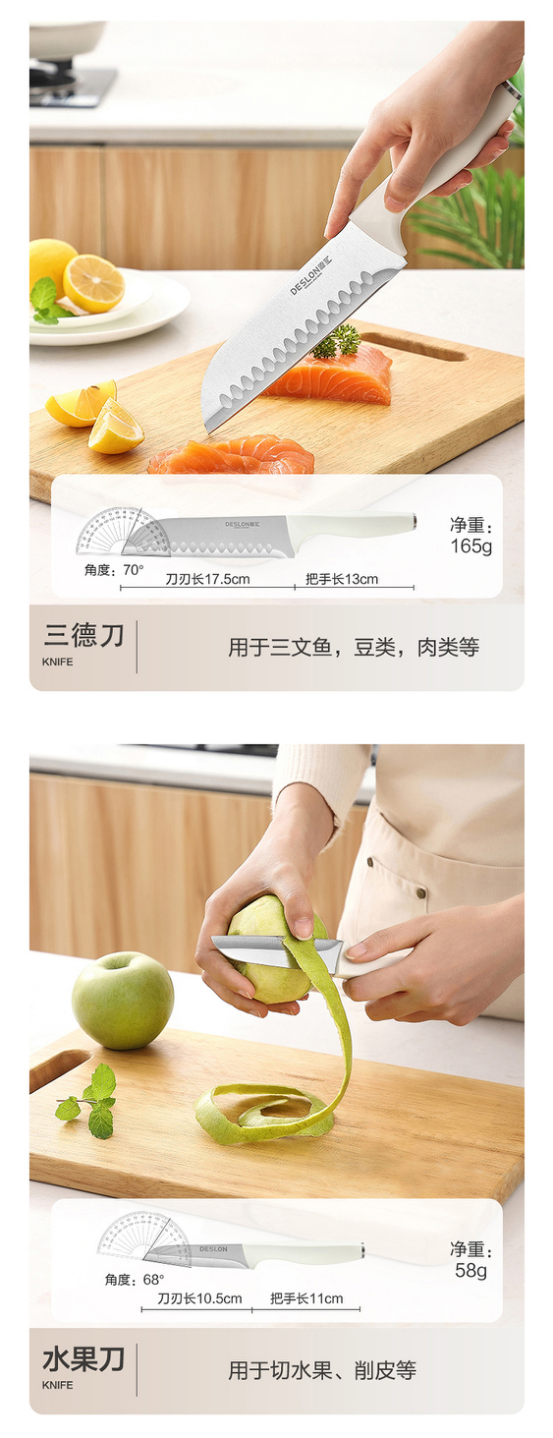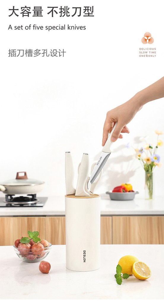 1️⃣精选刀具5件套,一应俱全,满足剁肉、切水果、削皮、切肉、以及剪骨等多种需求 2️⃣刀身甄选30Cr13不锈钢材质,不豁口不卷刃,坚韧耐磨,持久锋利,防锈抗腐; 3️⃣刀具采用专业人体工学弧度,一刀一型,久切不累,灵活切拉; 5️⃣流畅切割不流汁水,下刀丝滑,减少对食材的挤压和破坏 5️⃣经由多谁淬火热处理与回火工艺,刀刃锋利; 6️⃣搭配时尚刀座,收置刀具,节约空间,干净整齐。