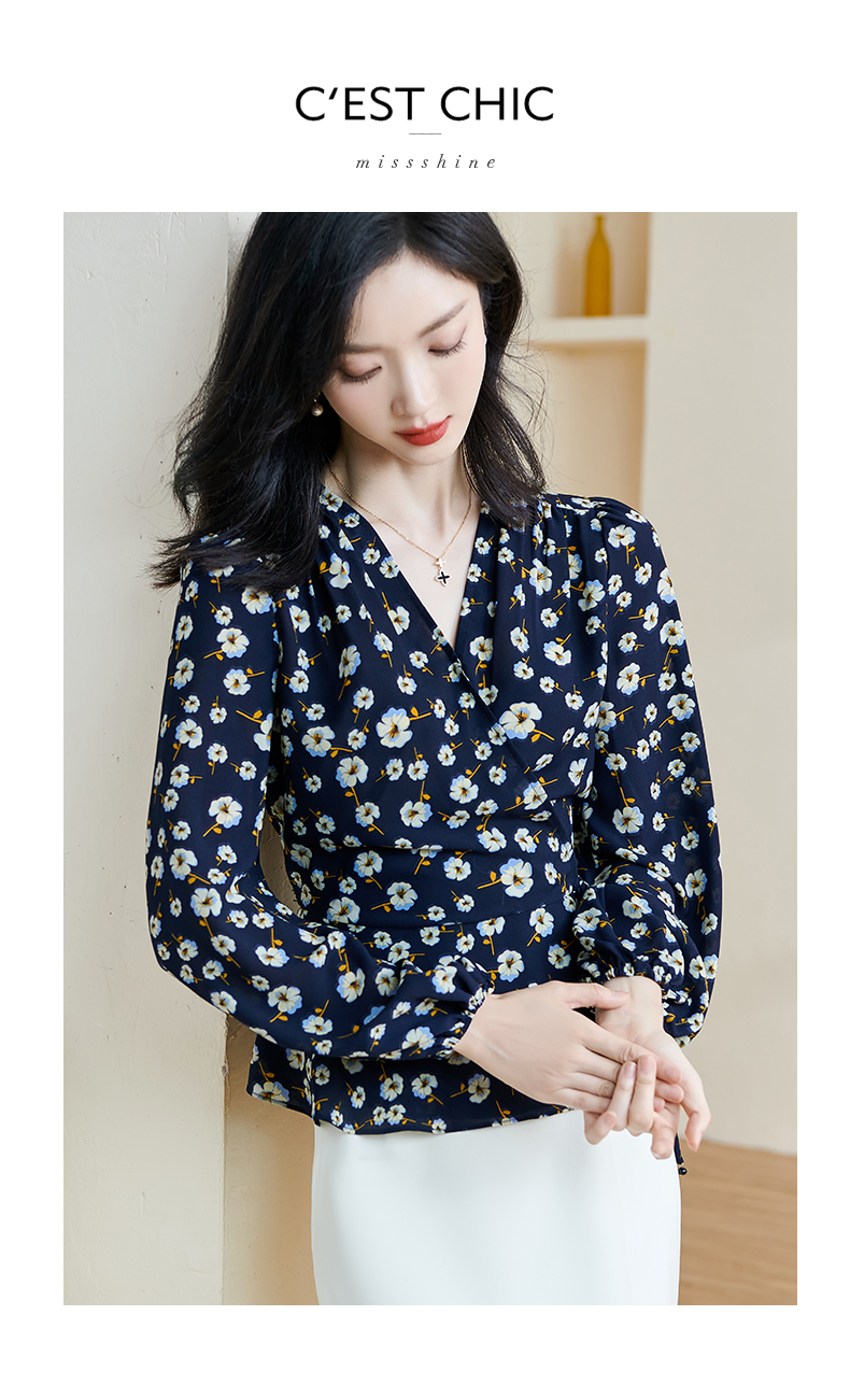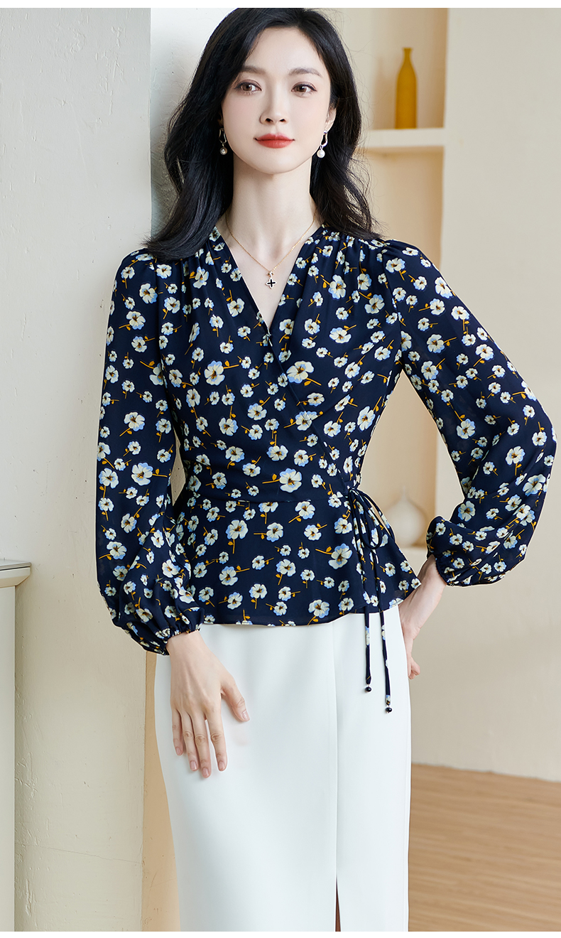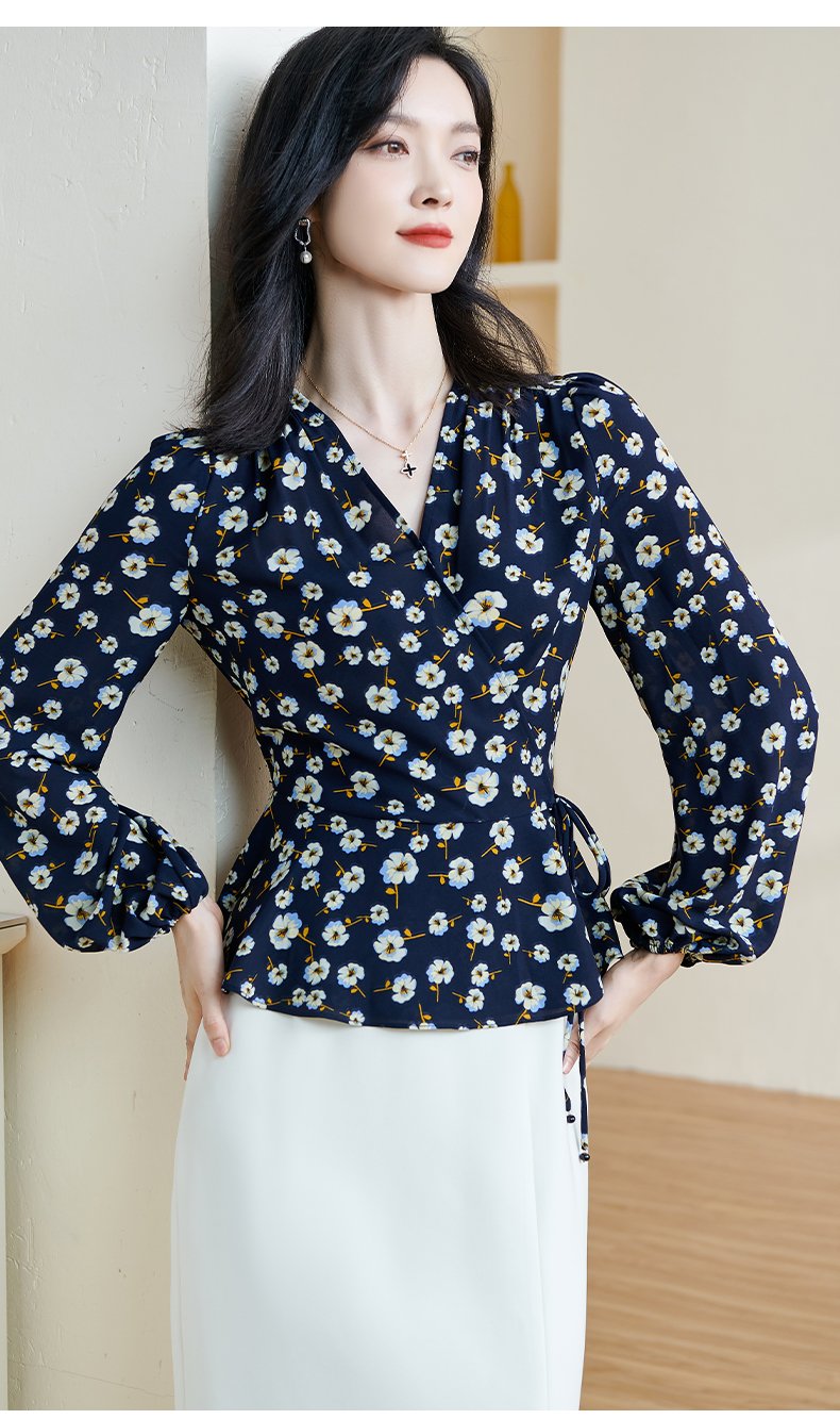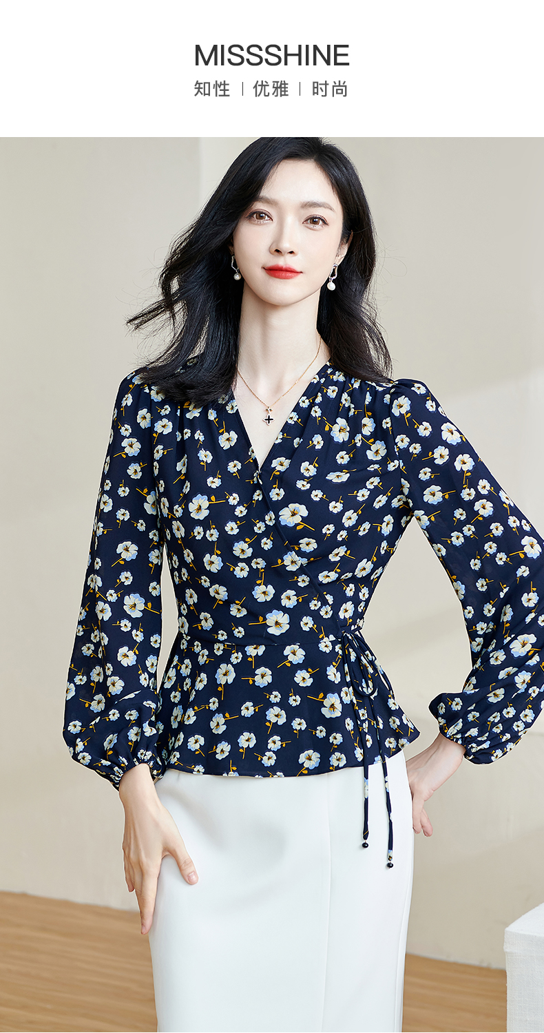 米思阳2025秋季知性优雅碎花衬衫长袖系带修身V领上衣女2491