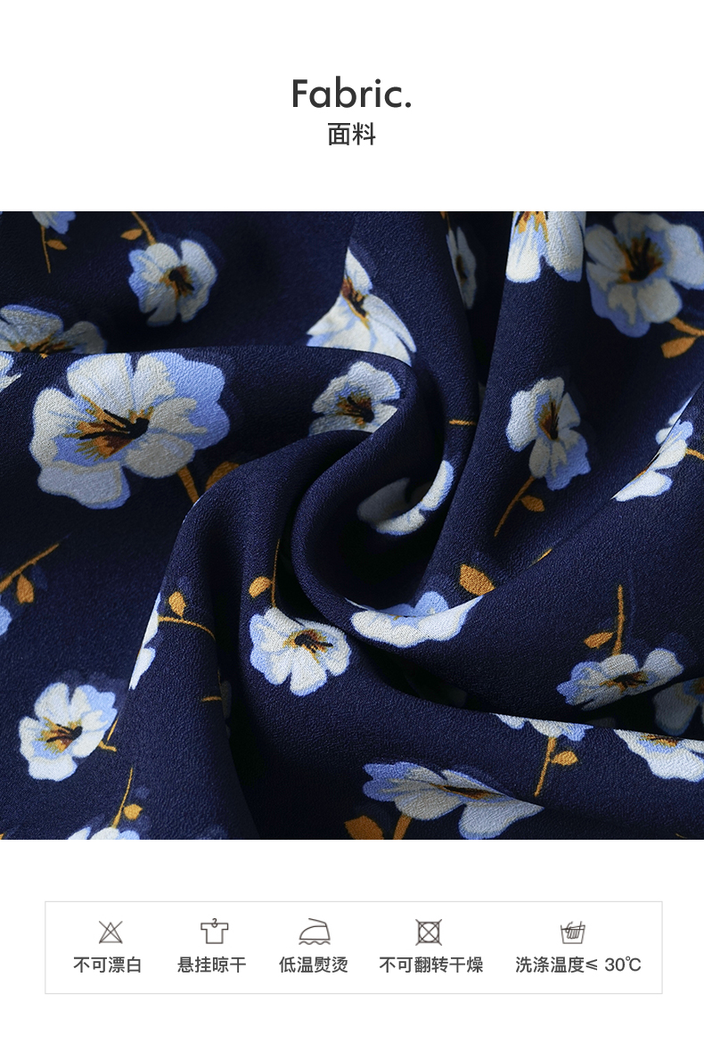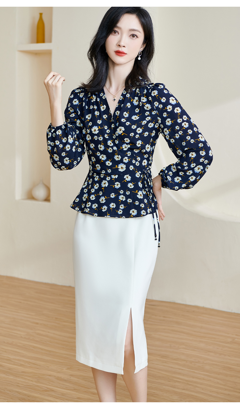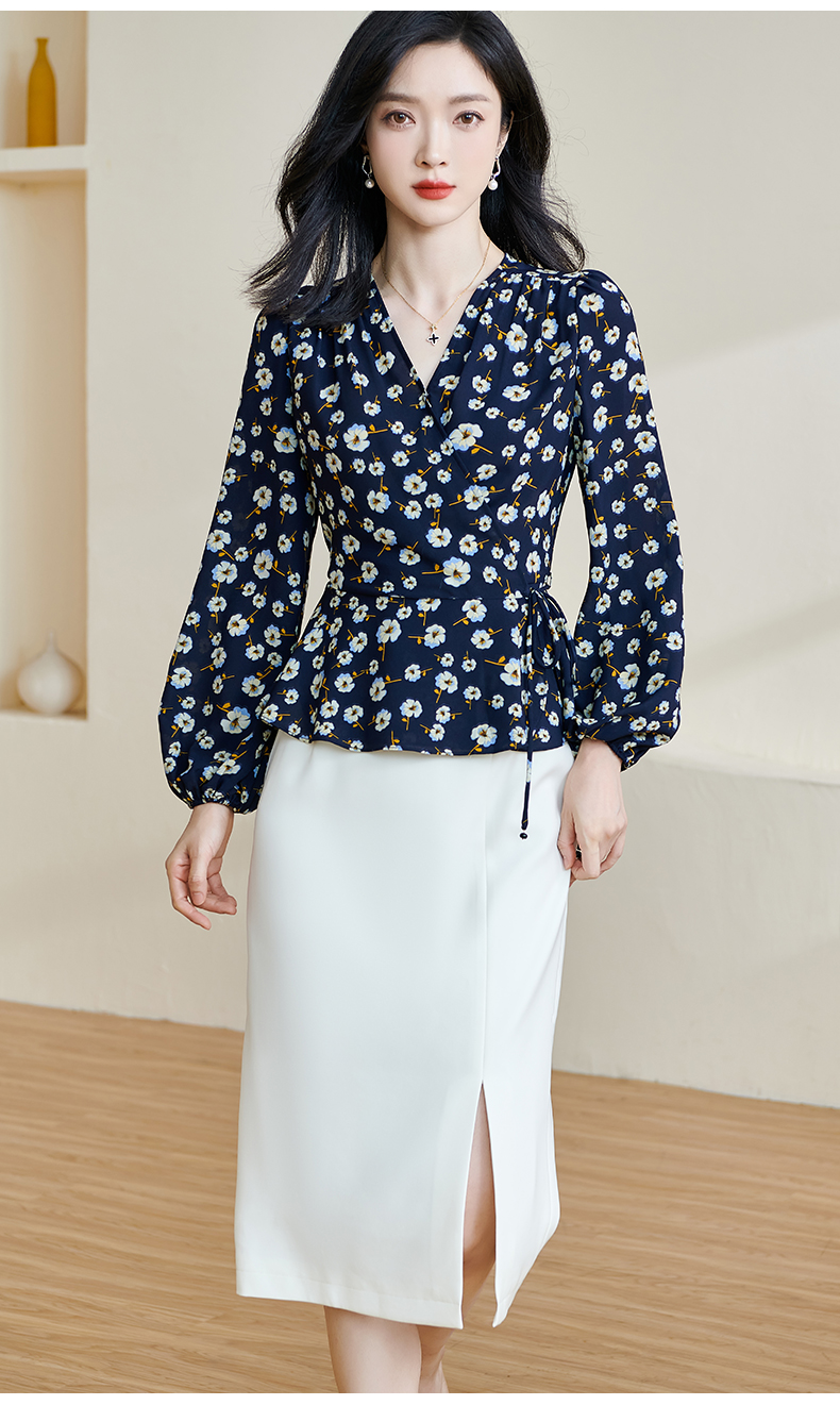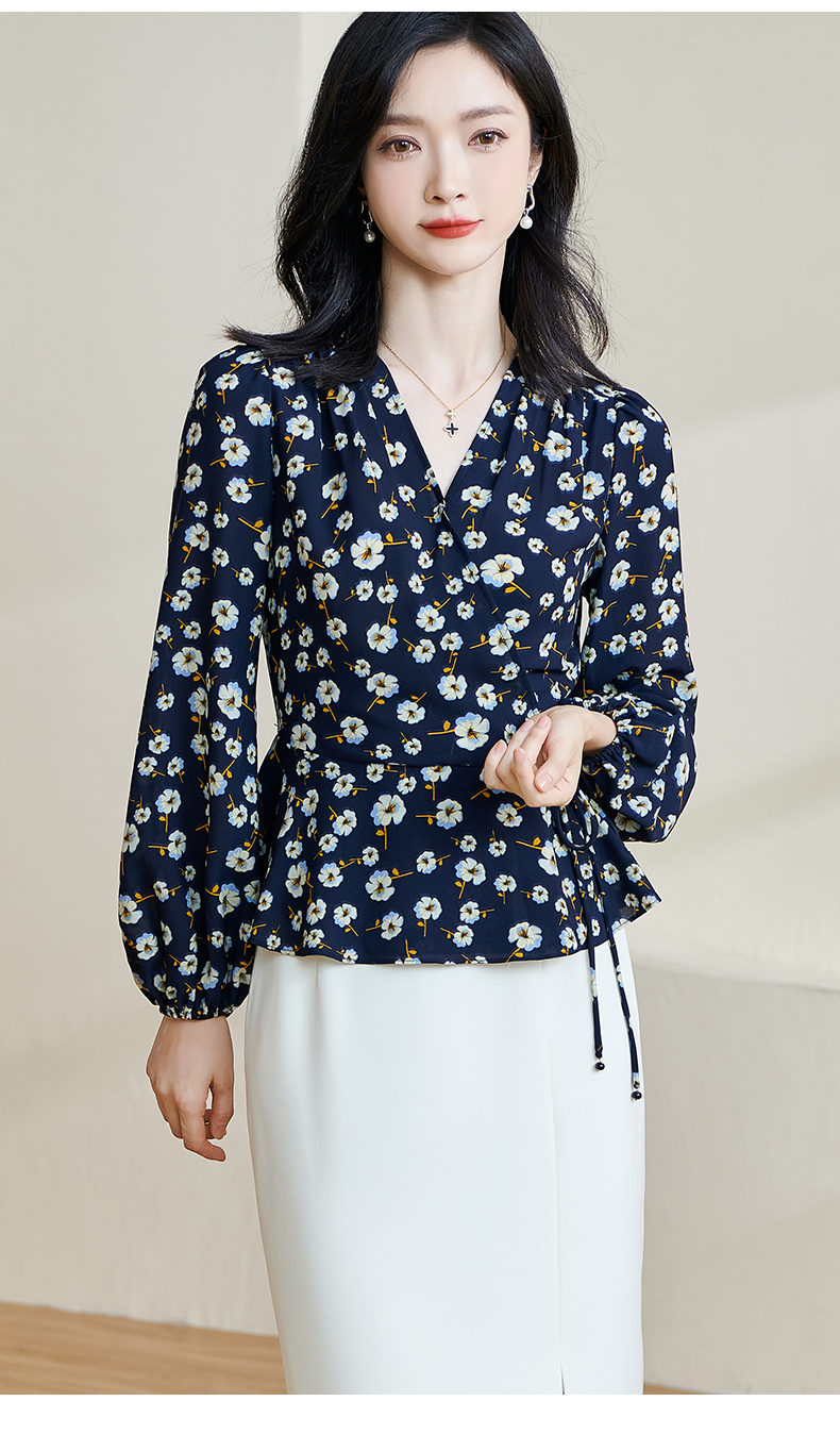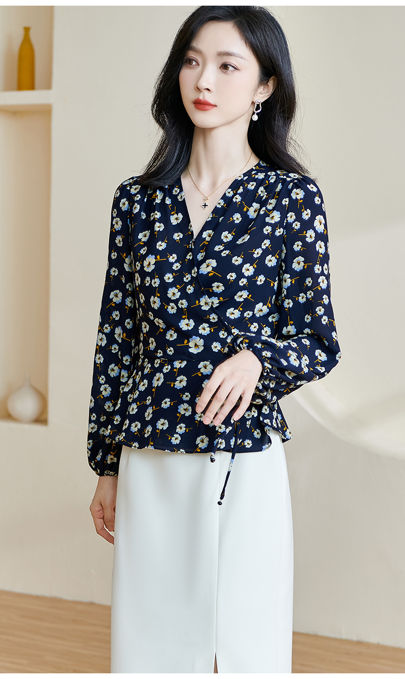 米思阳2025秋季知性优雅碎花衬衫长袖系带修身V领上衣女2491