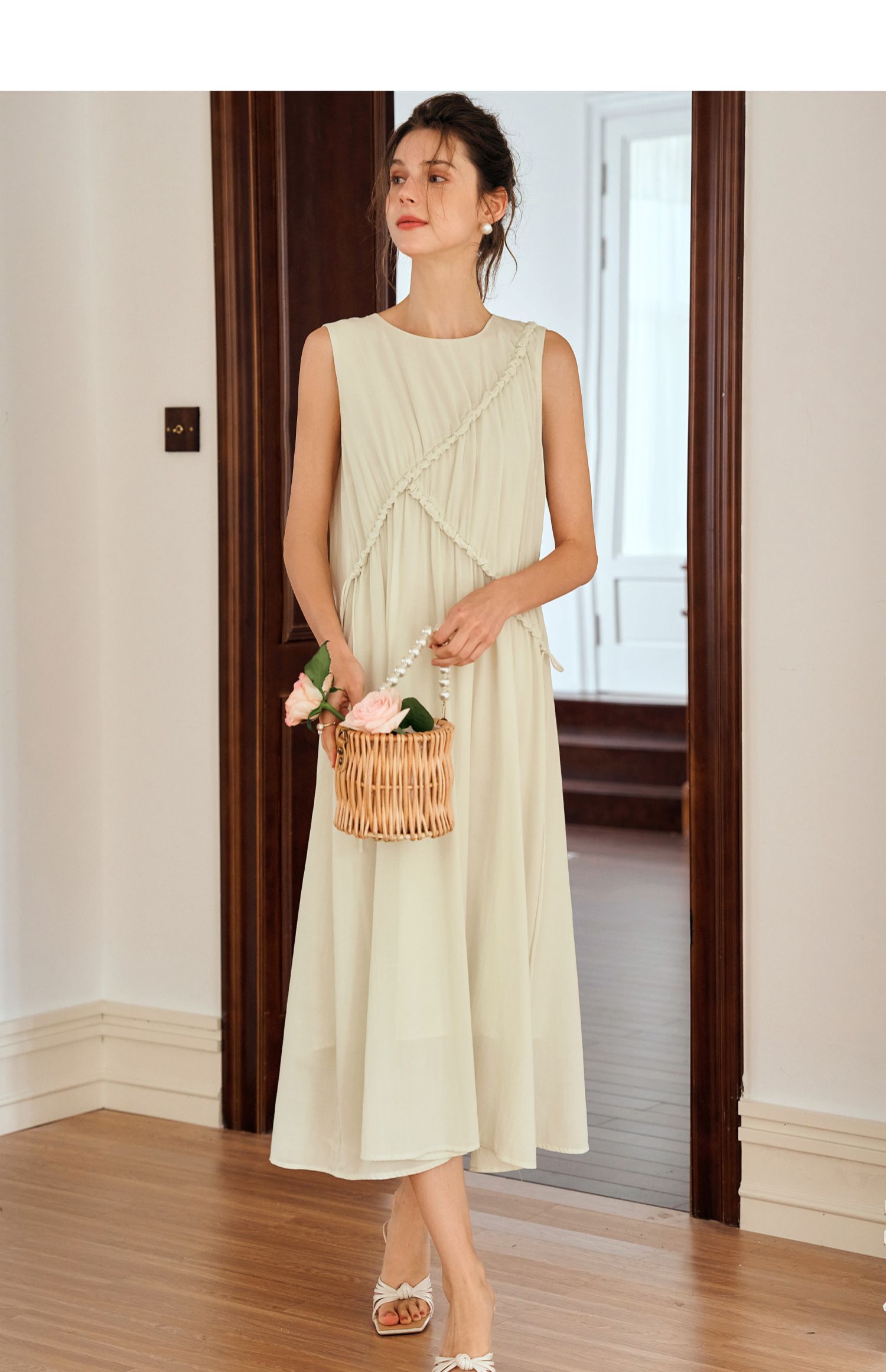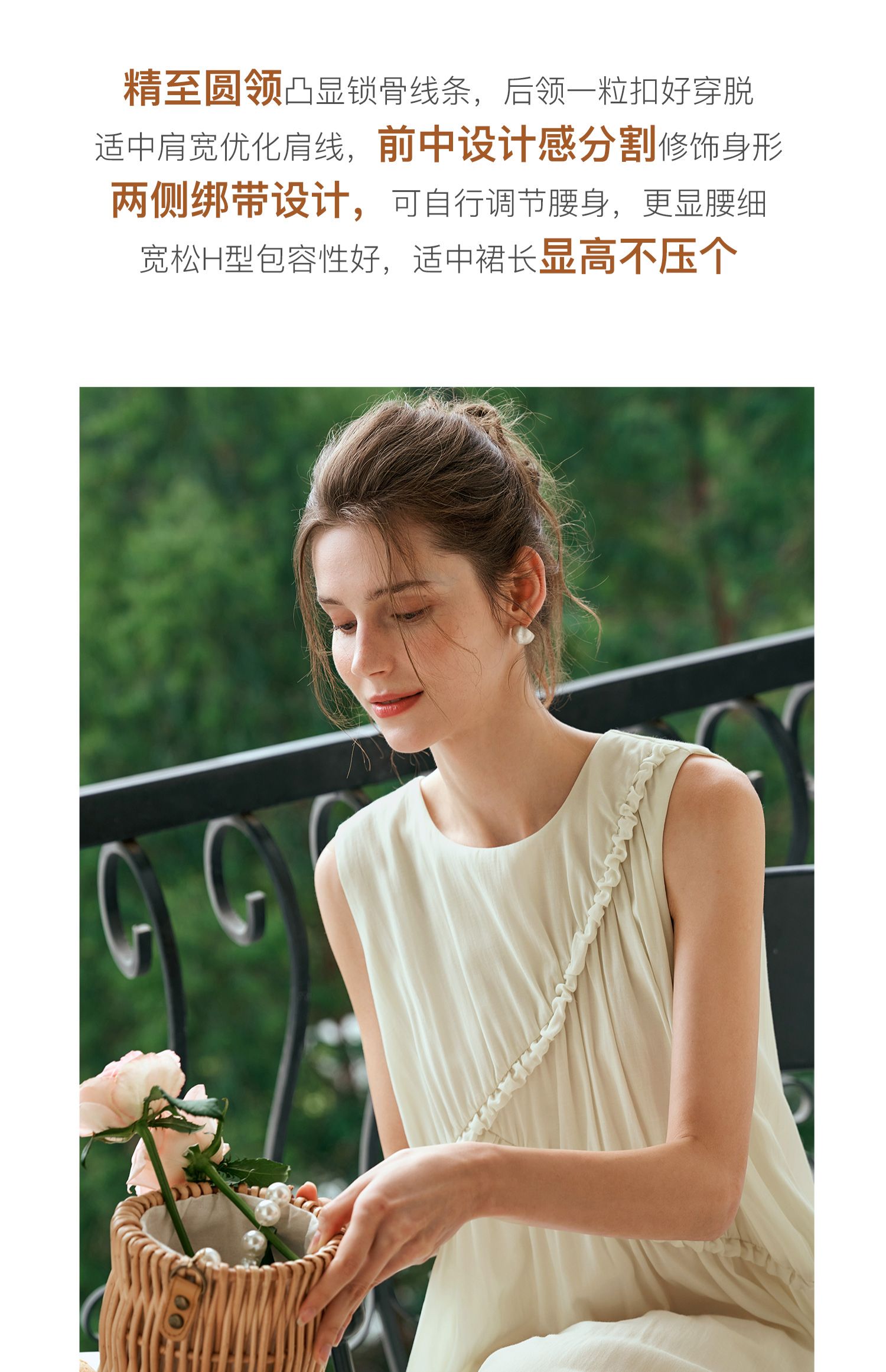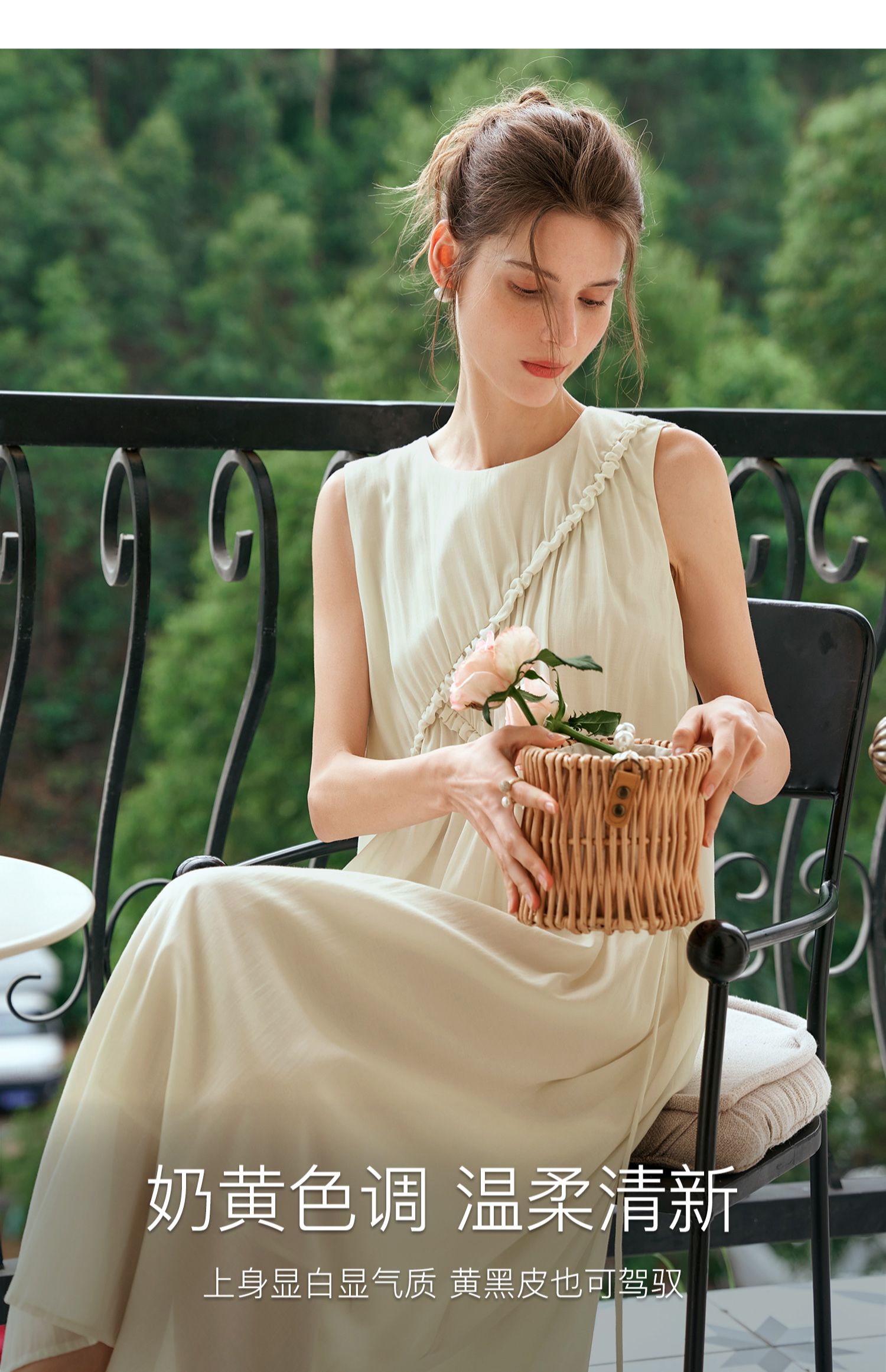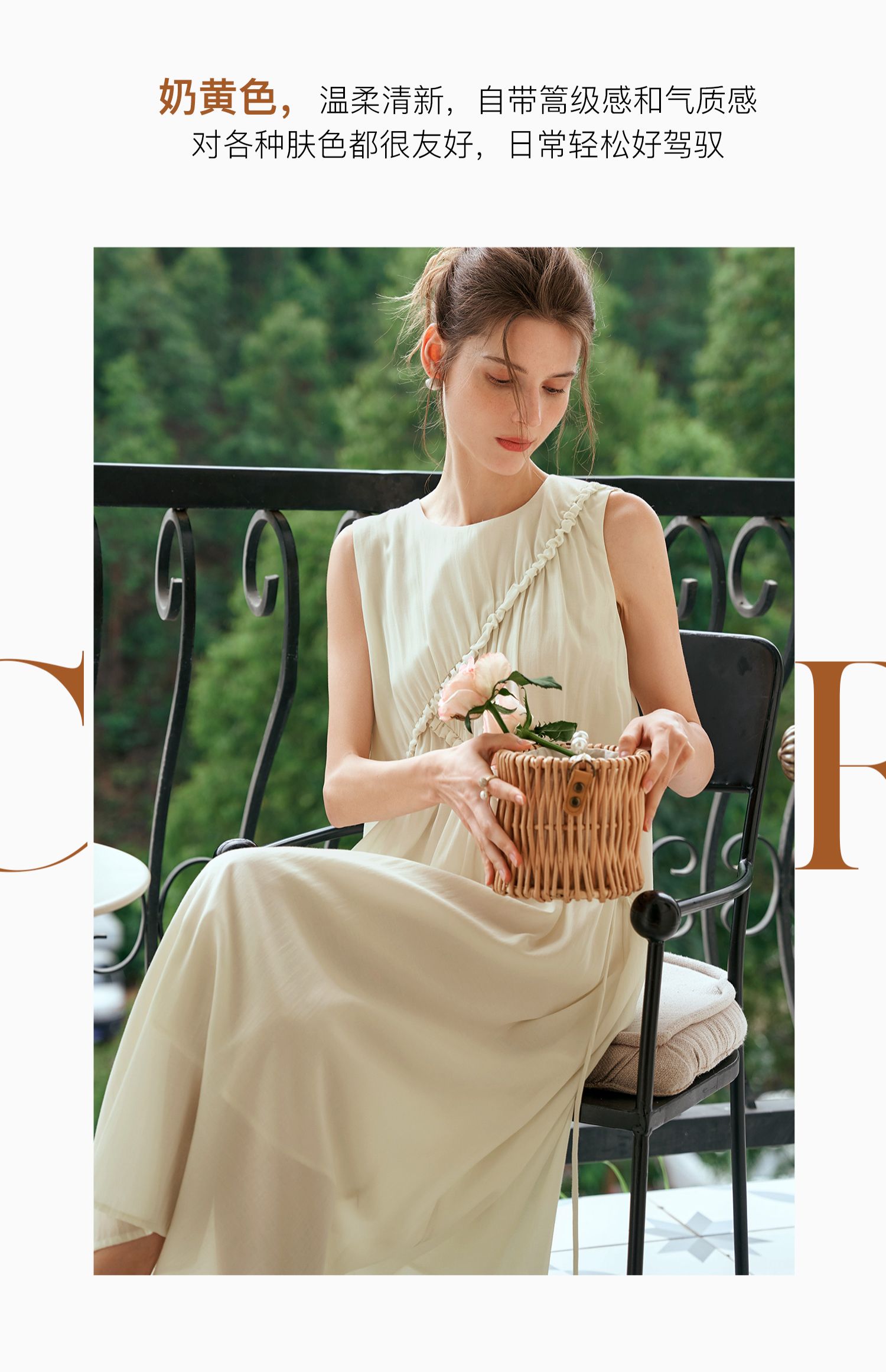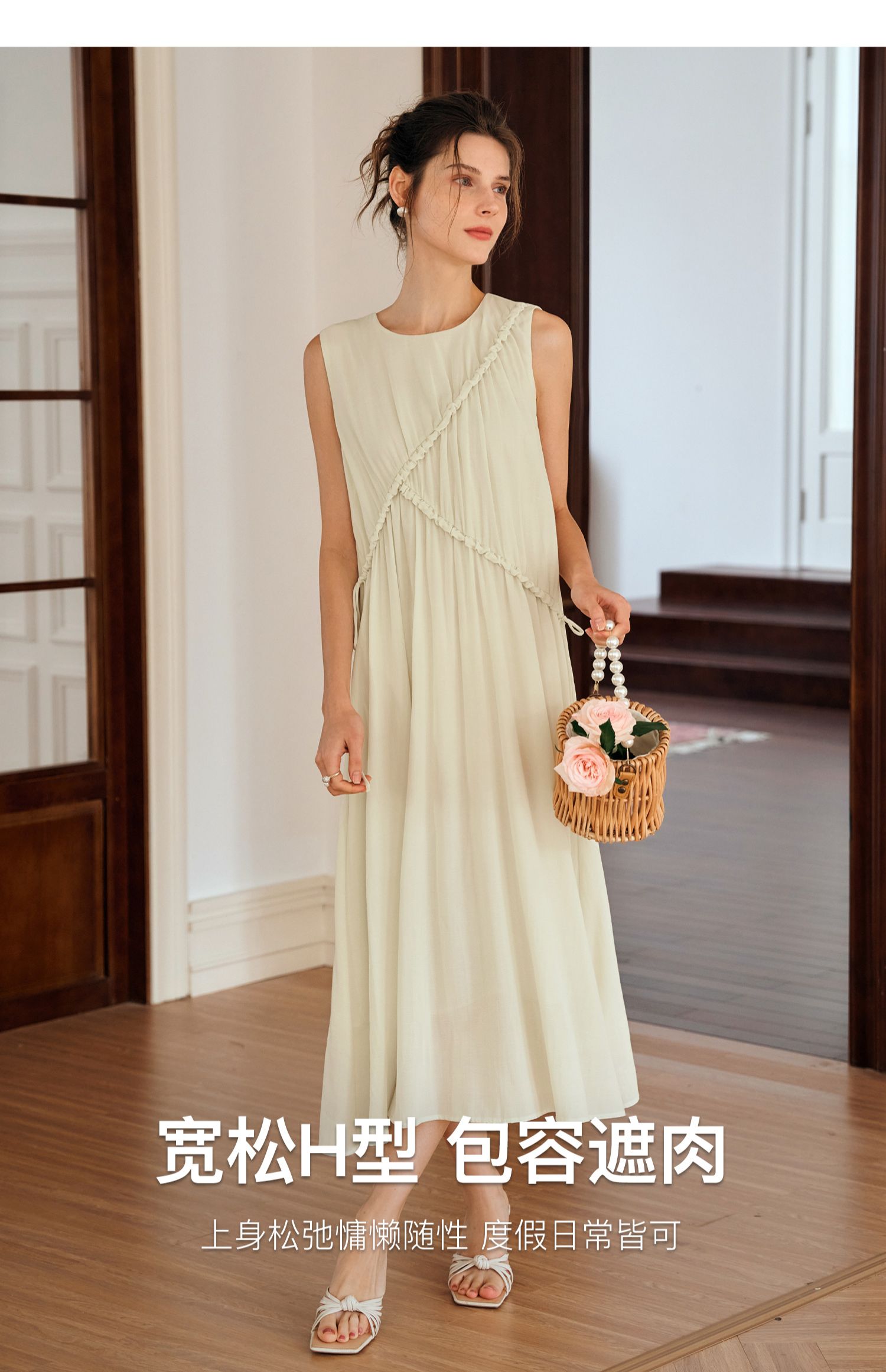 OLrain欧芮儿奶黄色无袖连衣裙女夏季2024新款茶歇设计感度假长裙