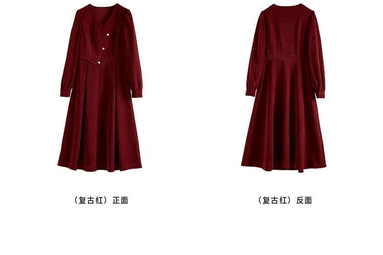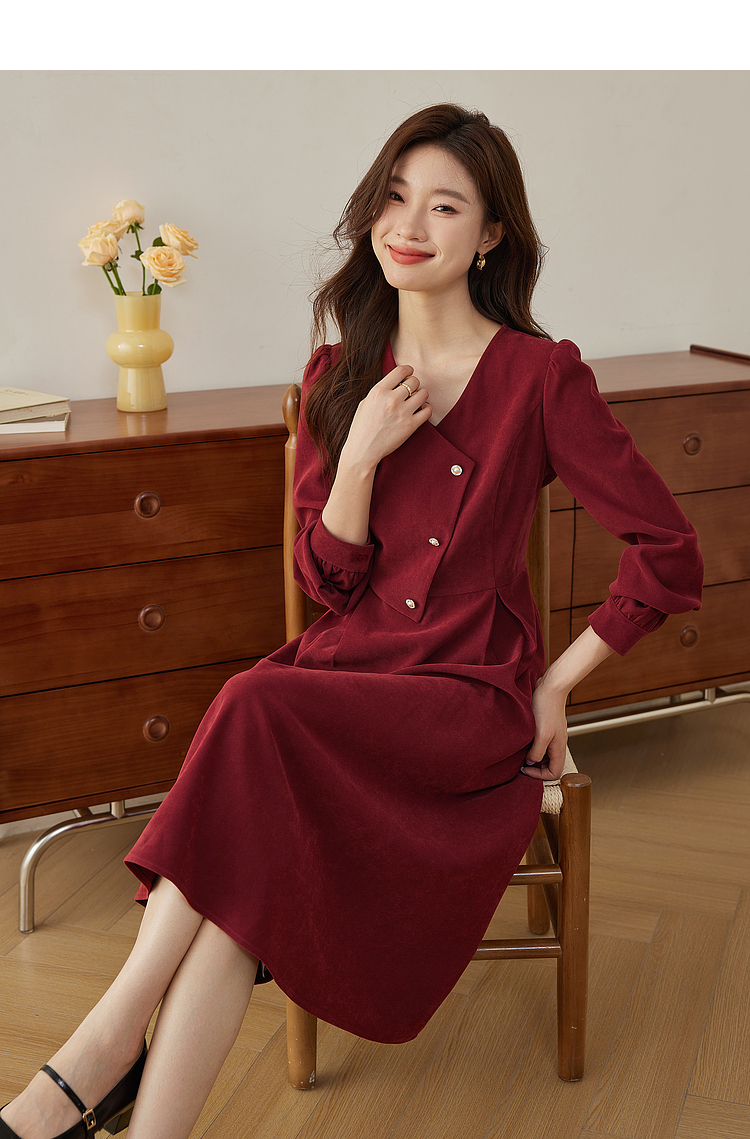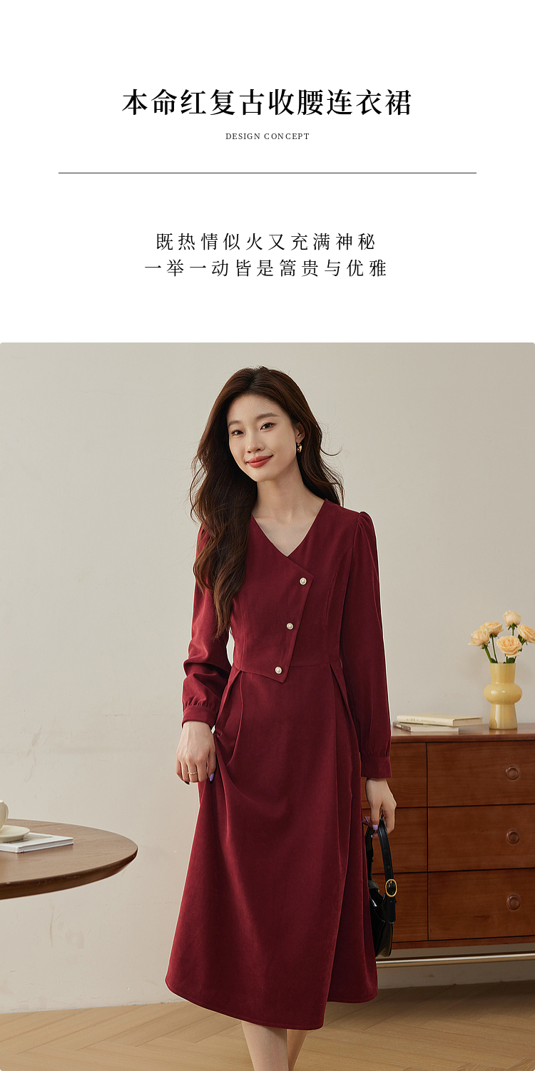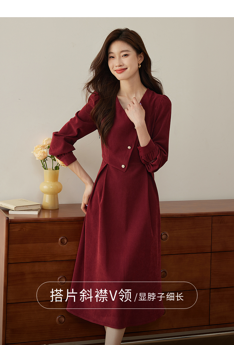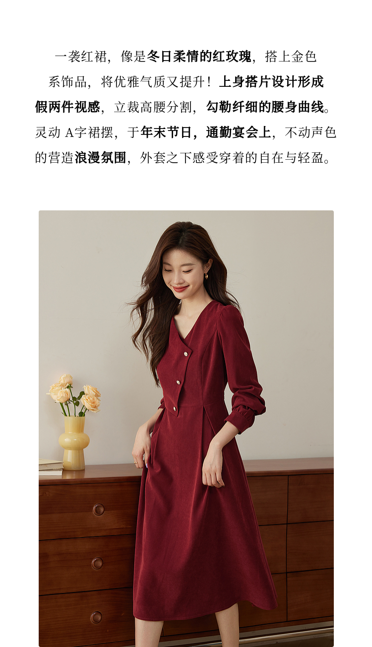 【专属特价】熙世界浪漫复古红色连衣裙秋冬新款法式赫本磨毛V领裙子高级感