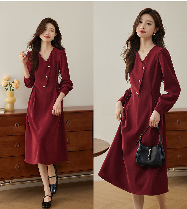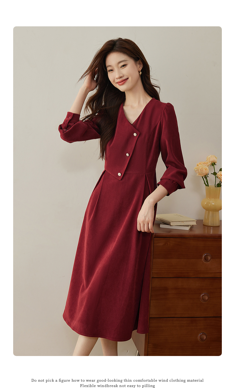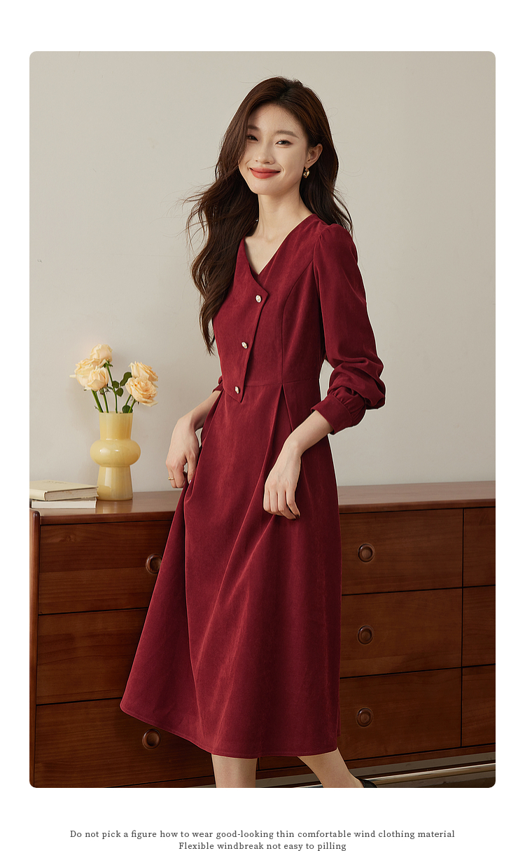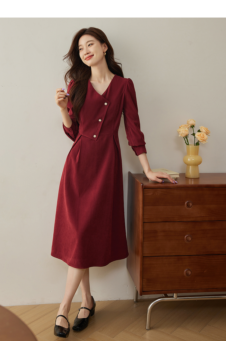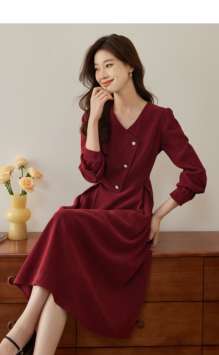 【专属特价】熙世界浪漫复古红色连衣裙秋冬新款法式赫本磨毛V领裙子高级感