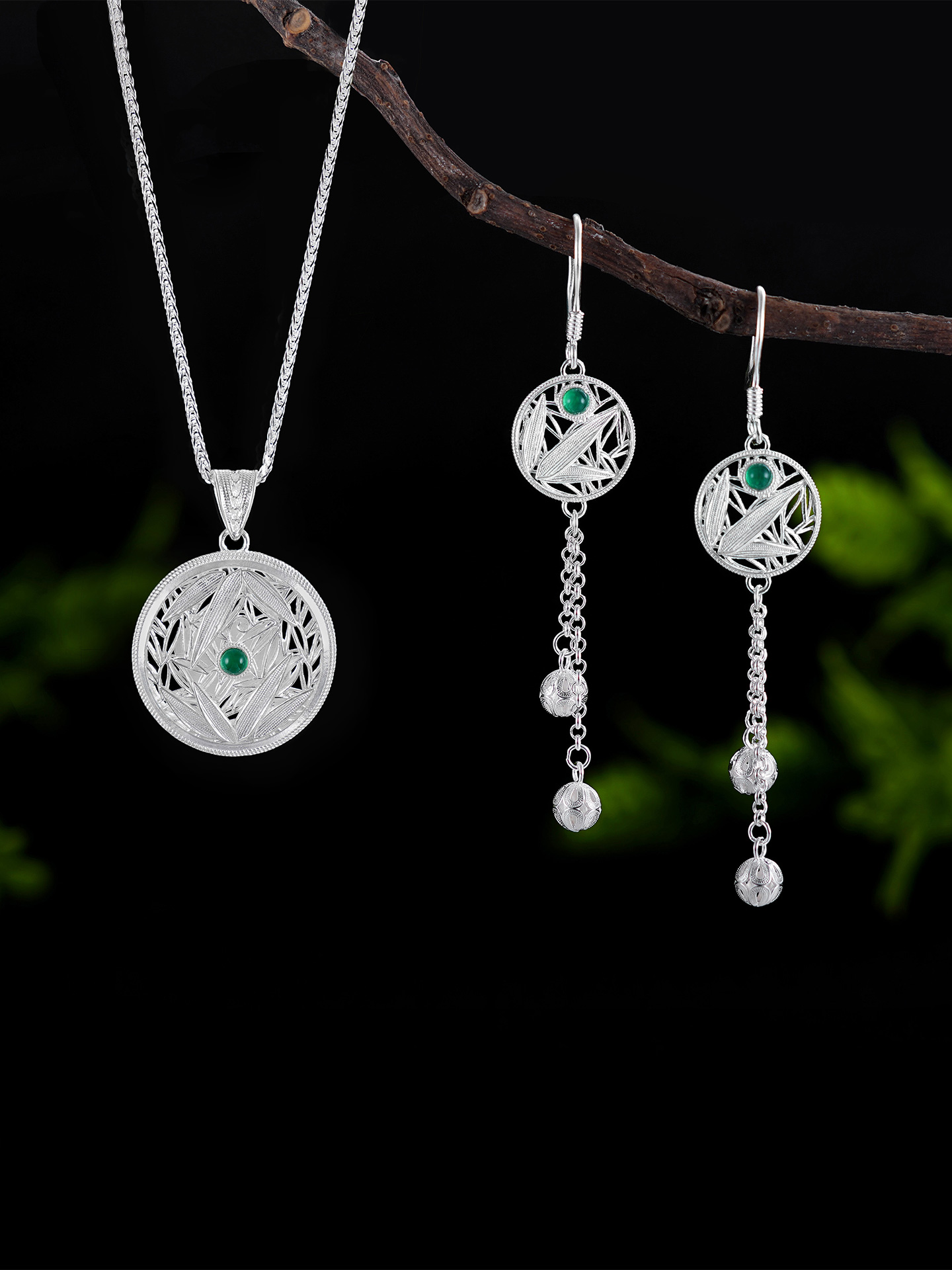【寓意】:将熊猫与竹元素相结合,通过精湛的花丝工艺,平填出细腻纹理。背面熊猫呈趴卧状态,憨态可掬;正面以竹为主体,加以玉髓点缀。整体简洁素雅,寓意吉祥顺遂。