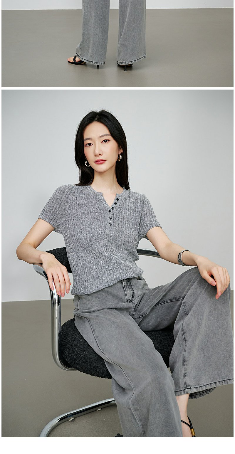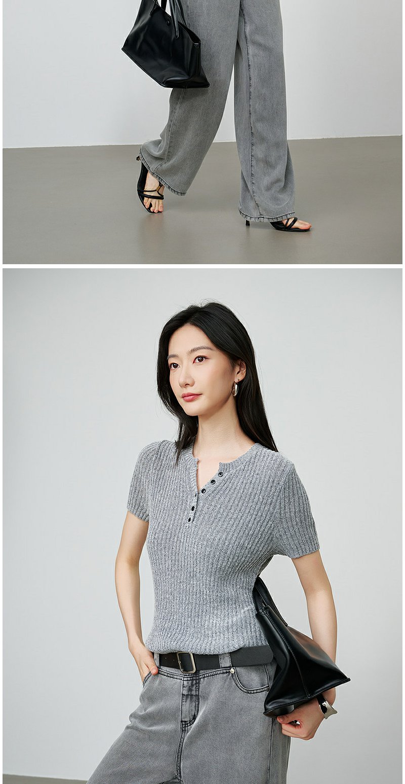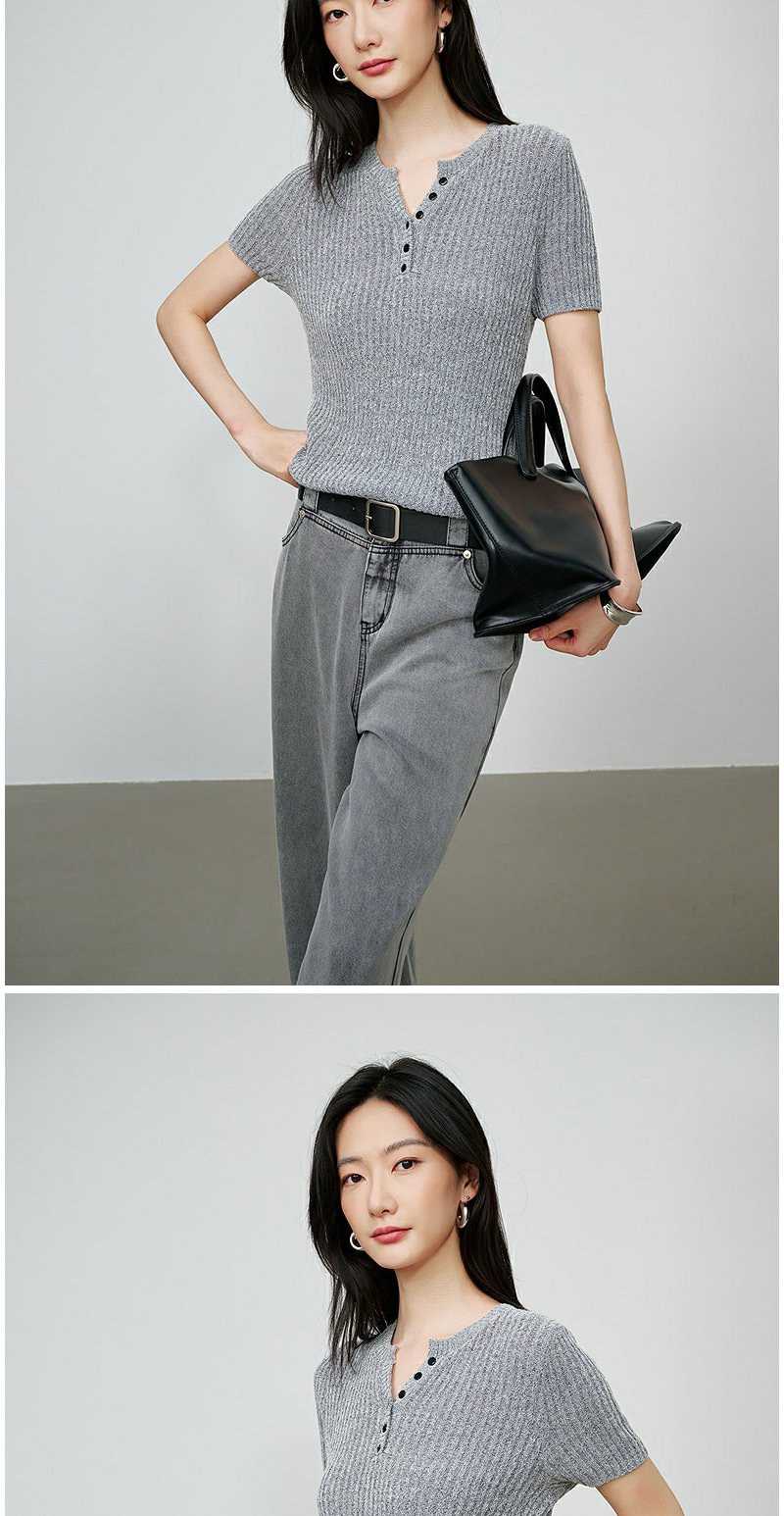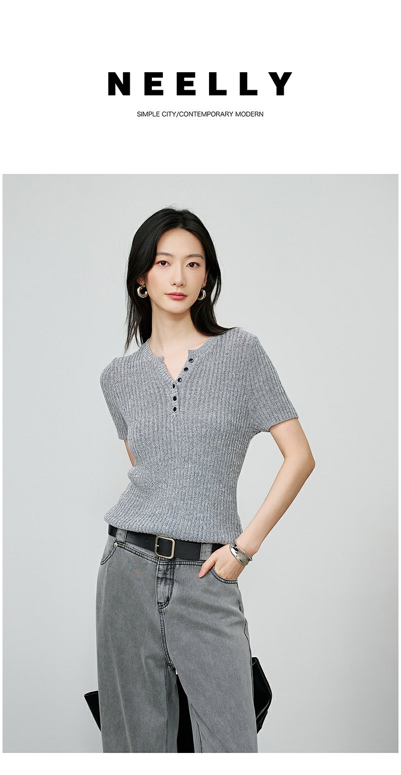 NEELLY纳俪商场同款秋季新款简约气质针织短袖女修身显瘦短款上衣N25074A05503