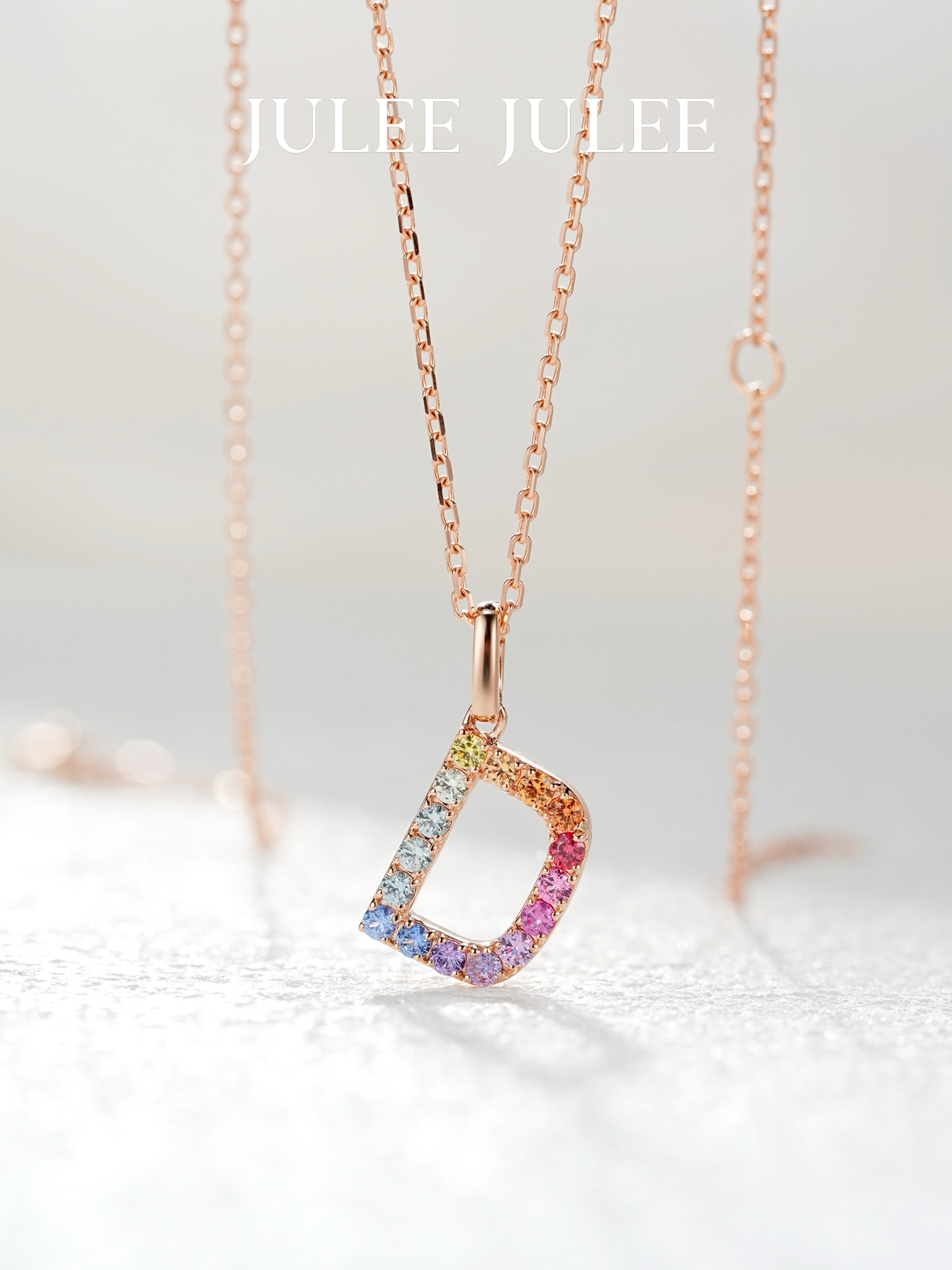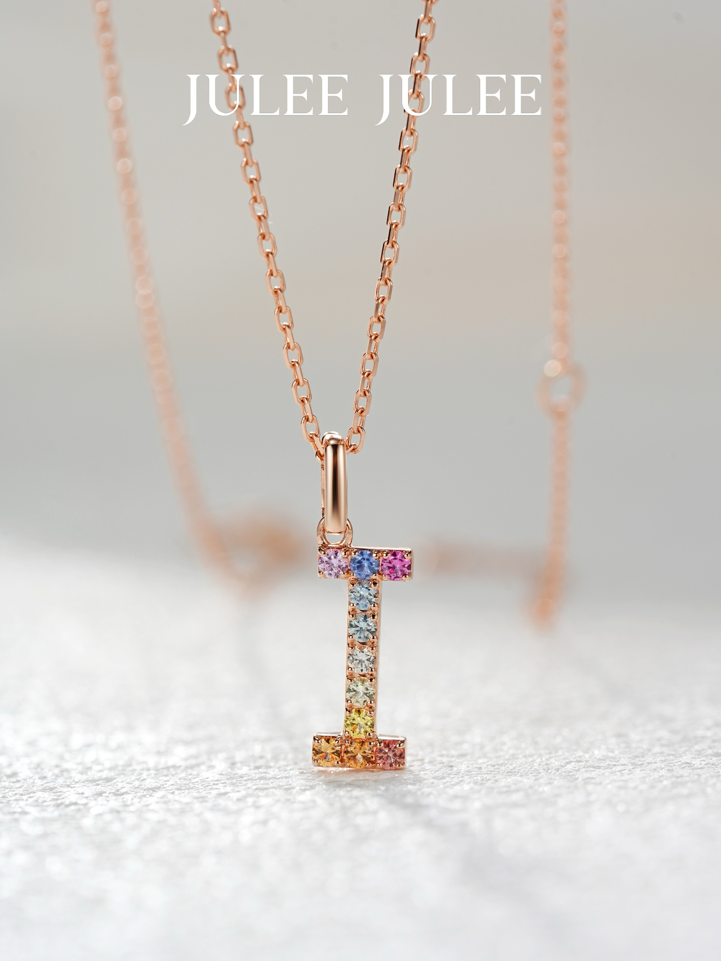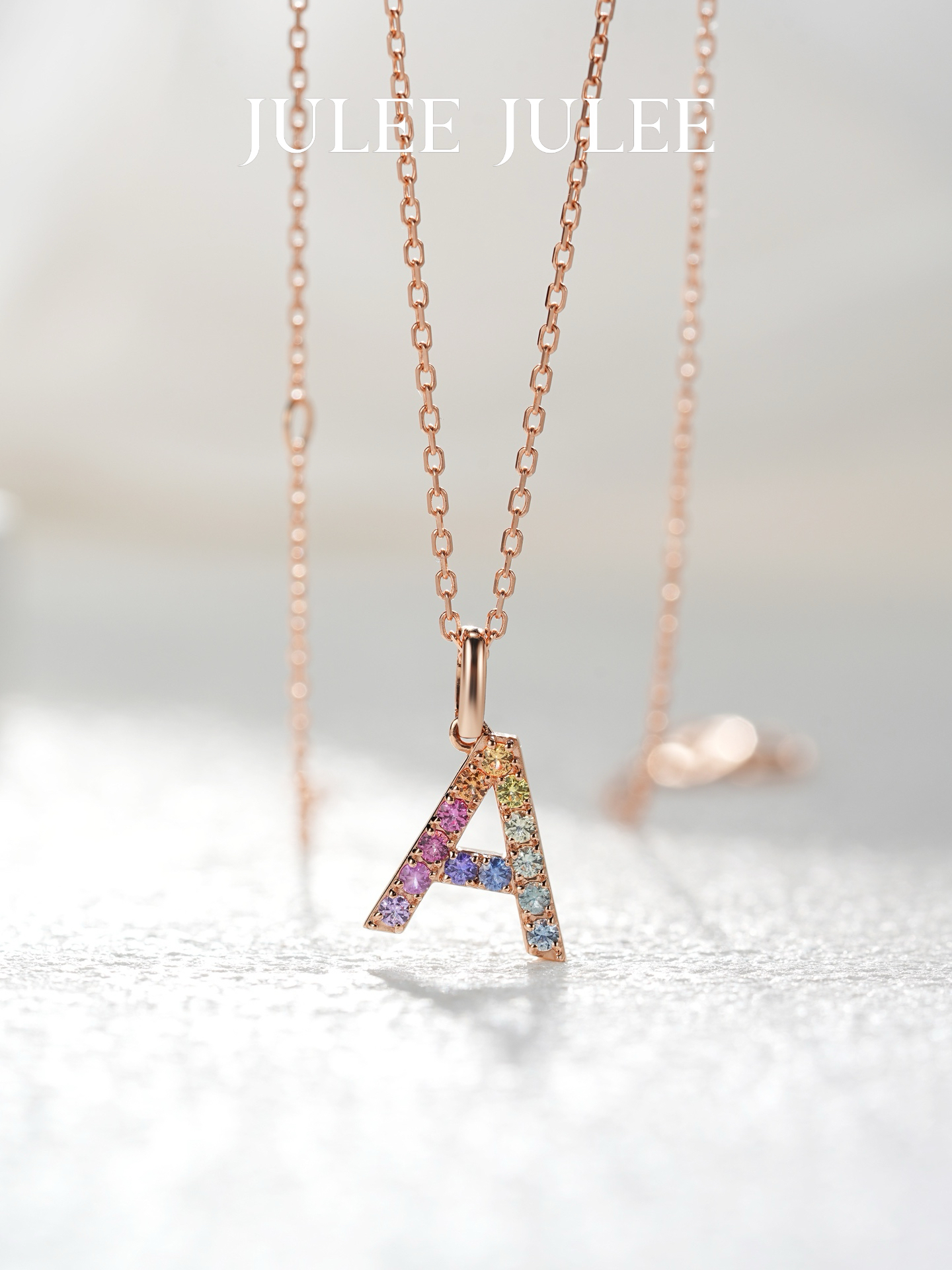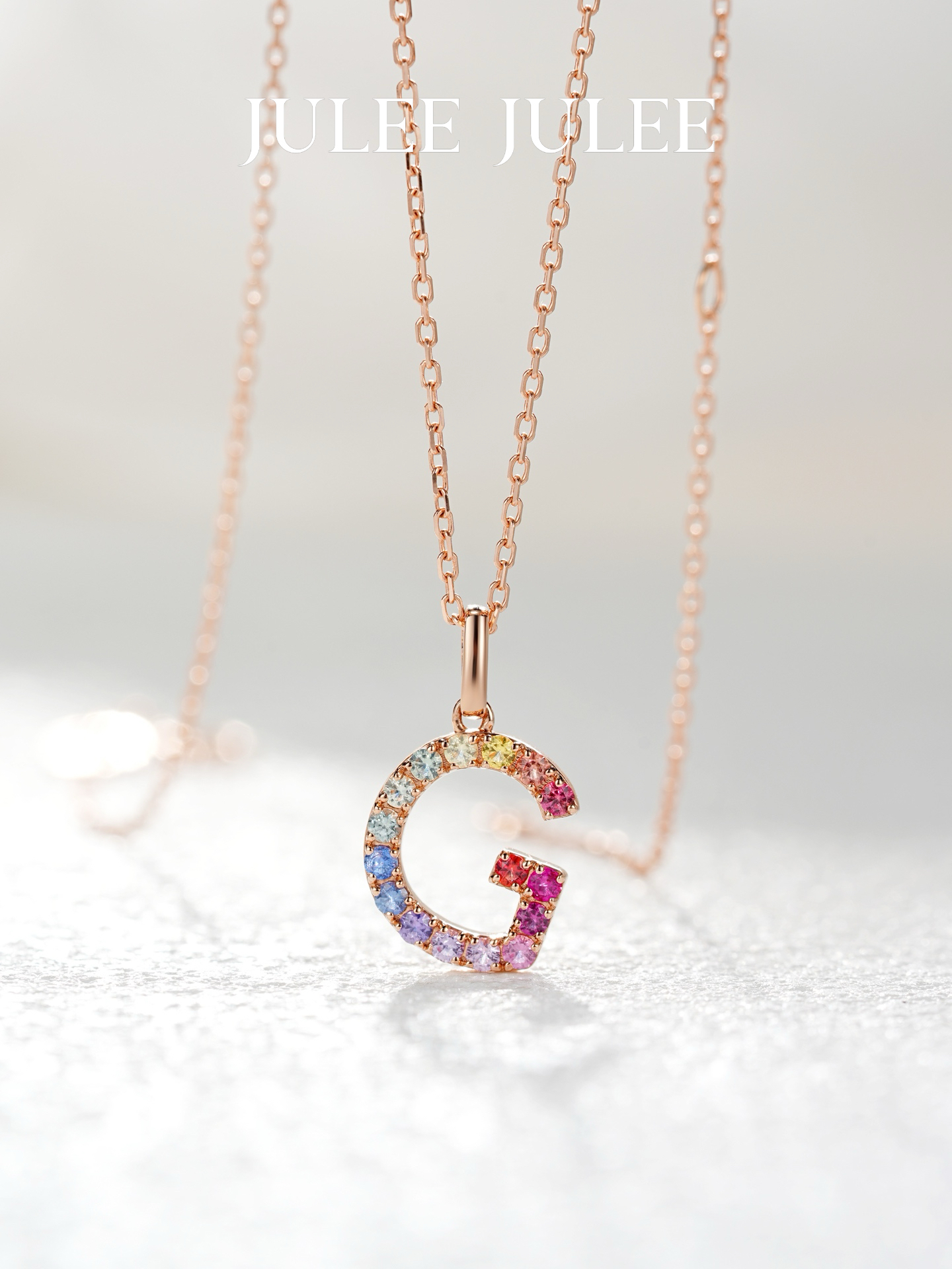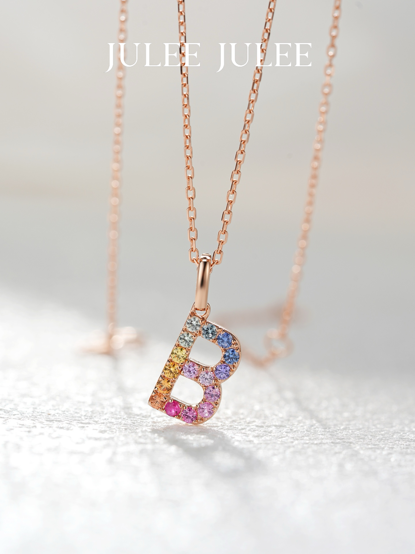 18K玫瑰金彩虹蓝宝石字母吊坠