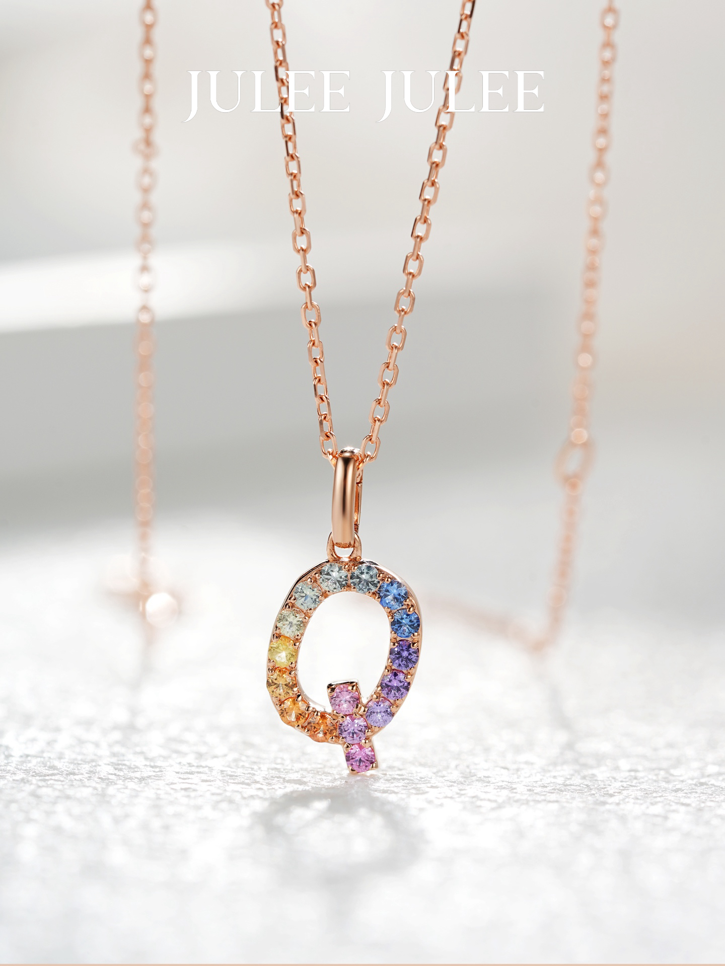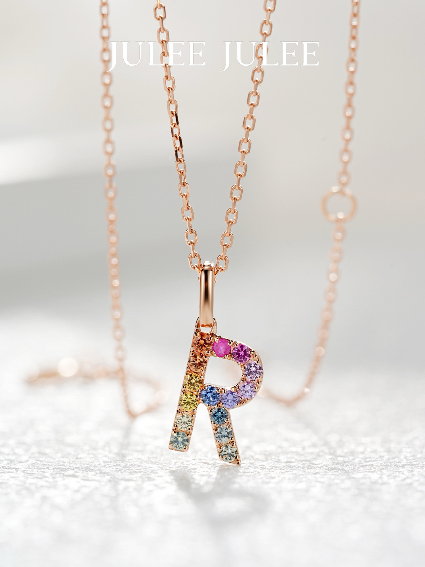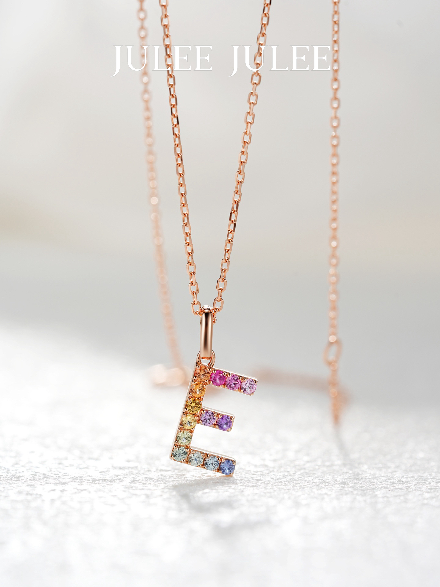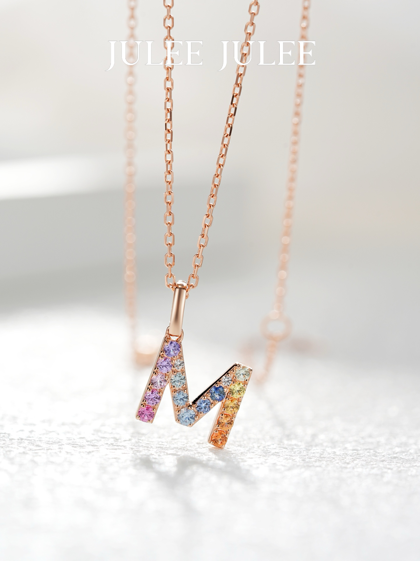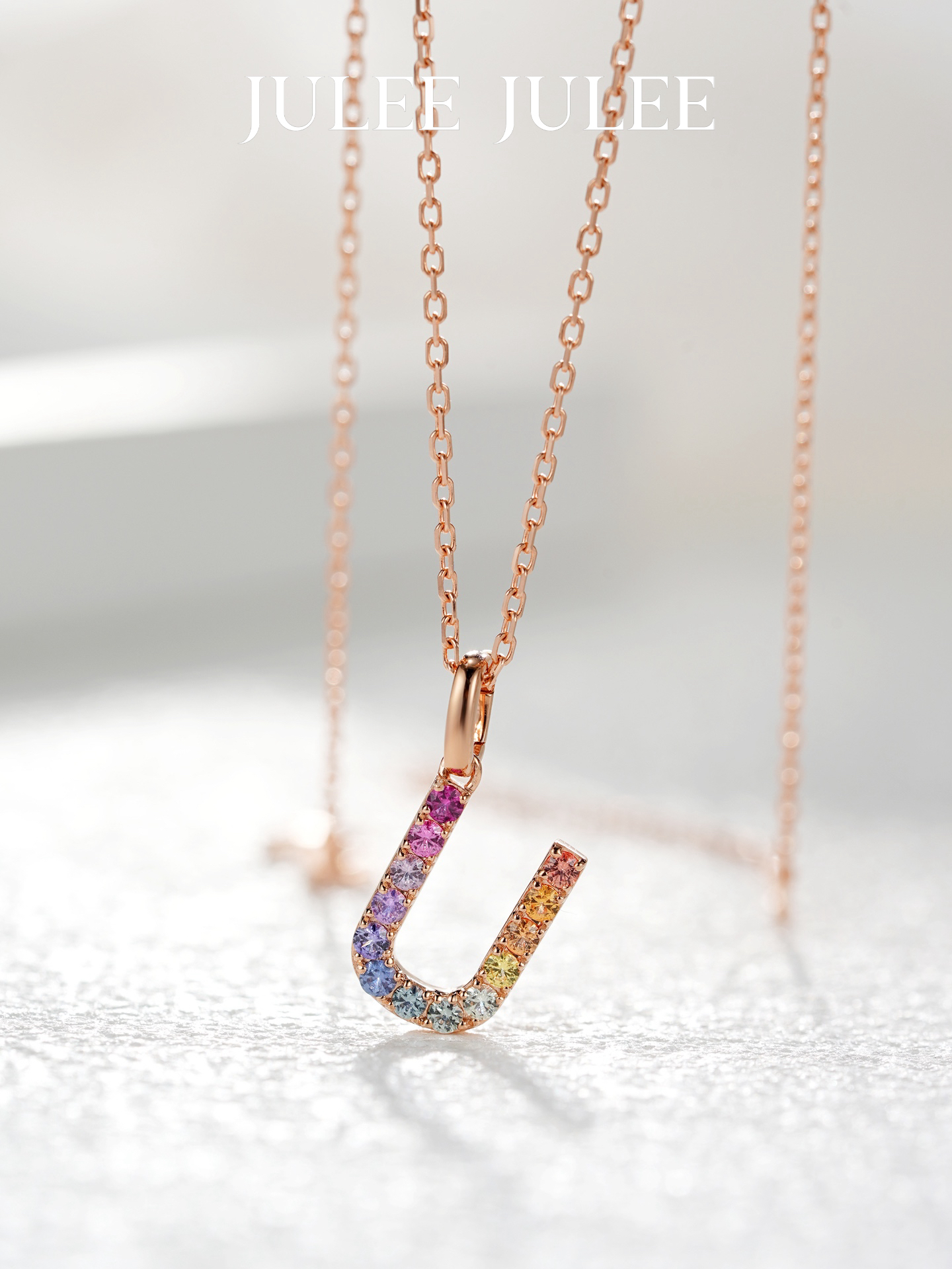 18K玫瑰金彩虹蓝宝石字母吊坠