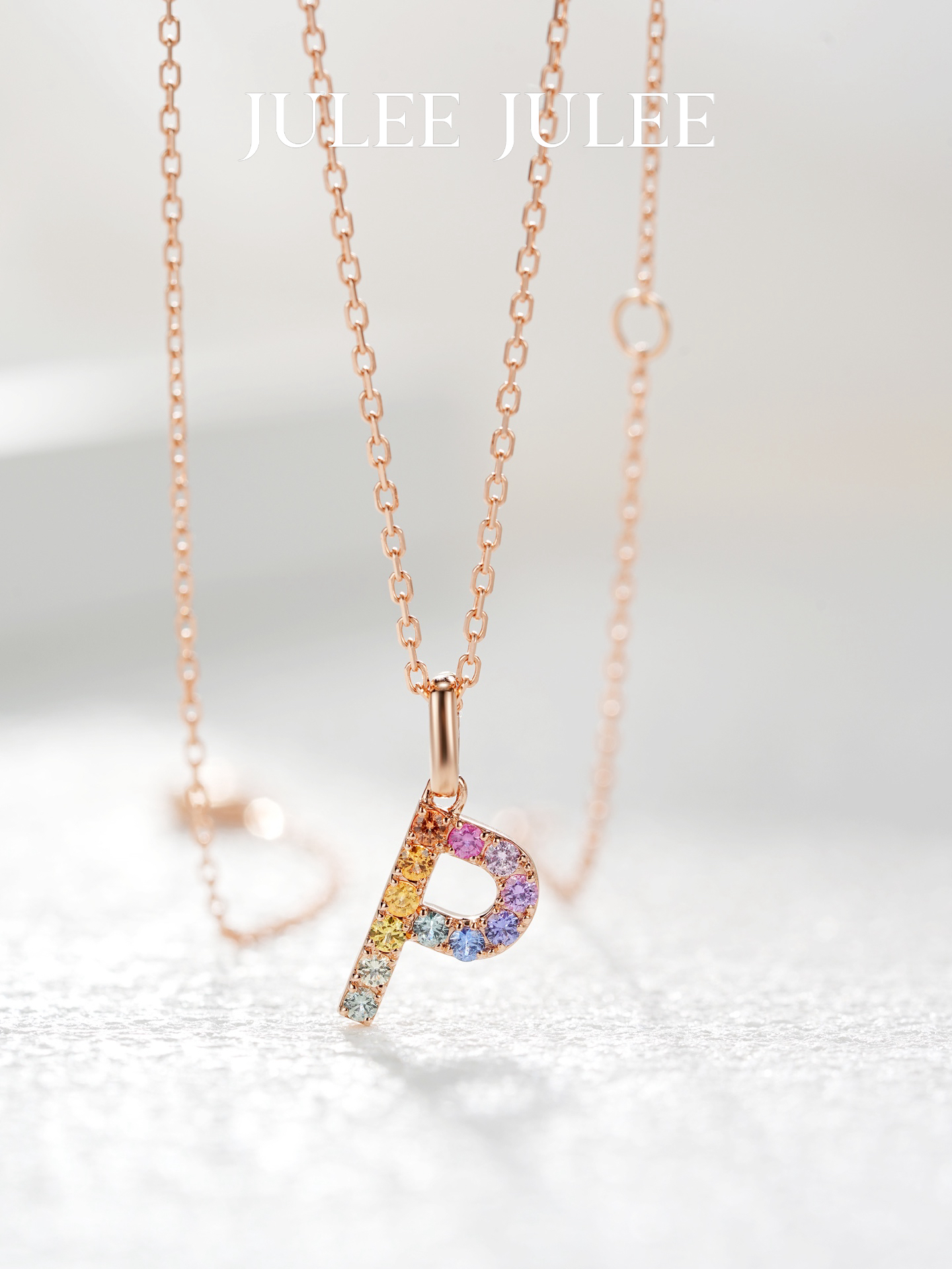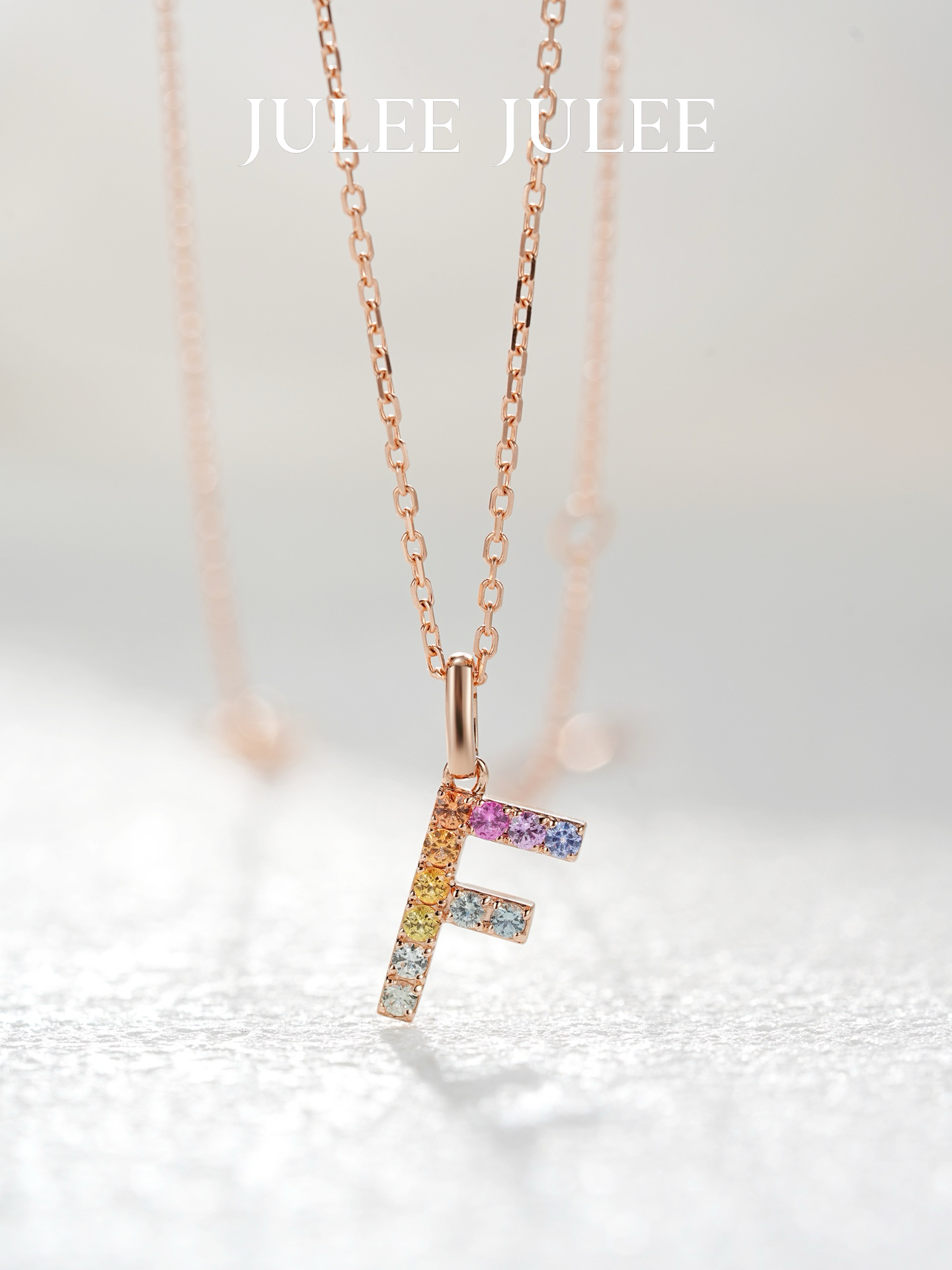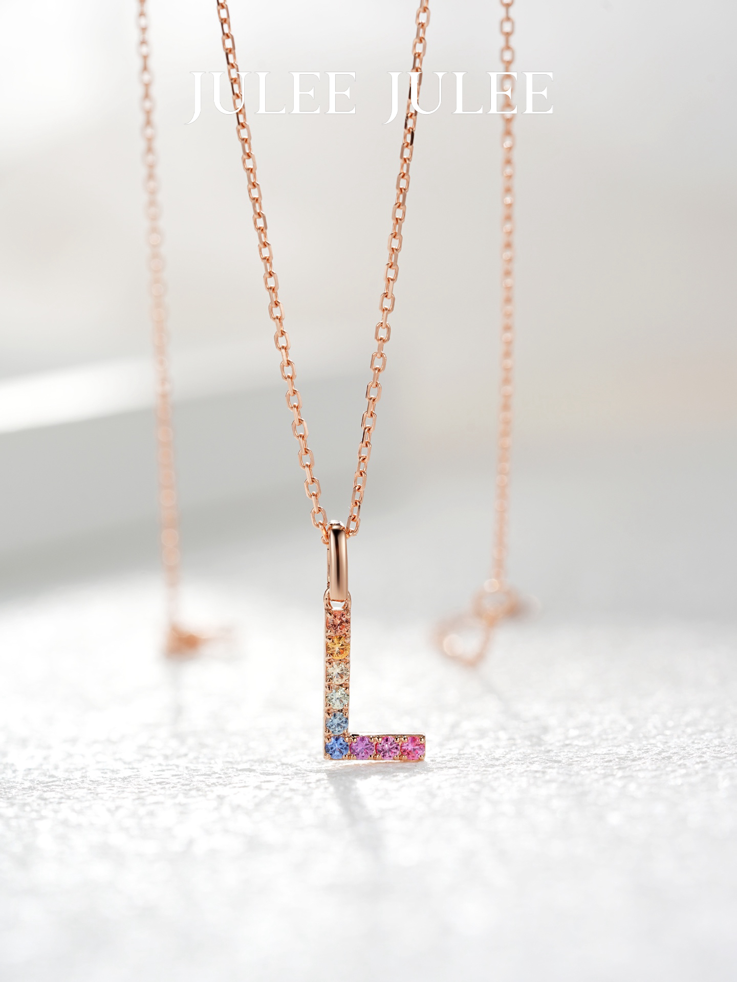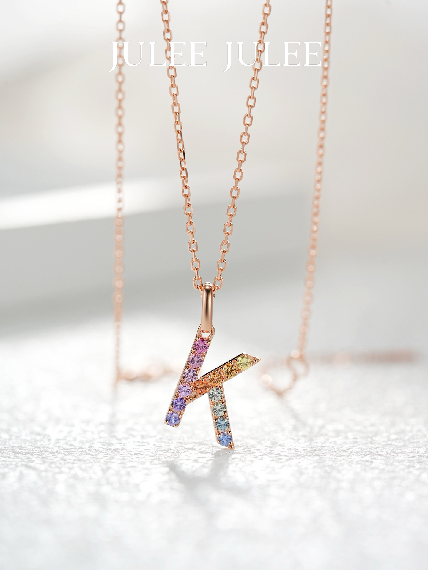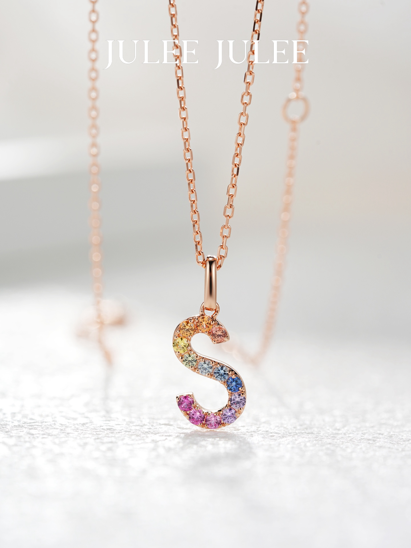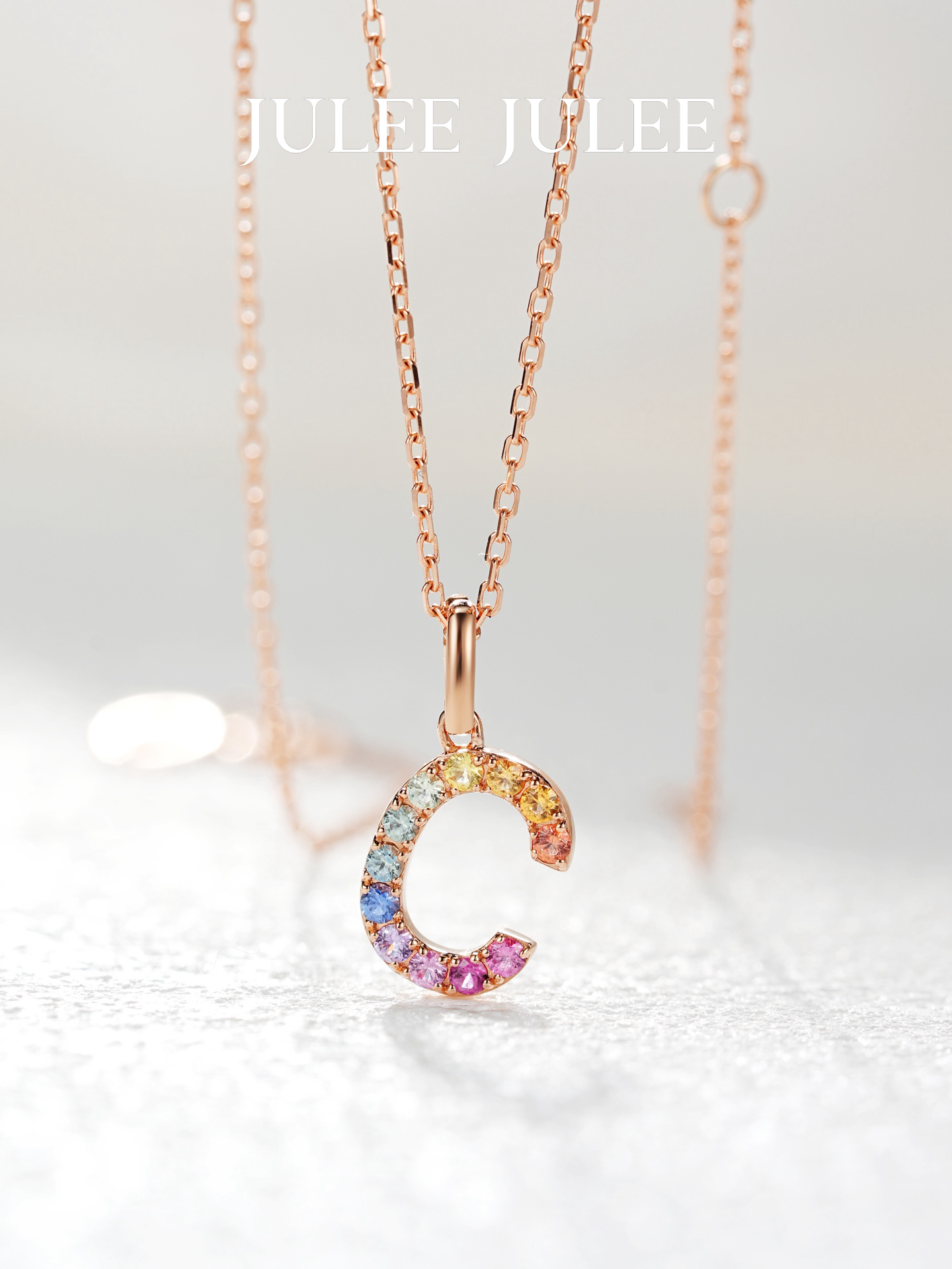 18K玫瑰金彩虹蓝宝石字母吊坠