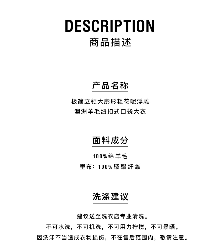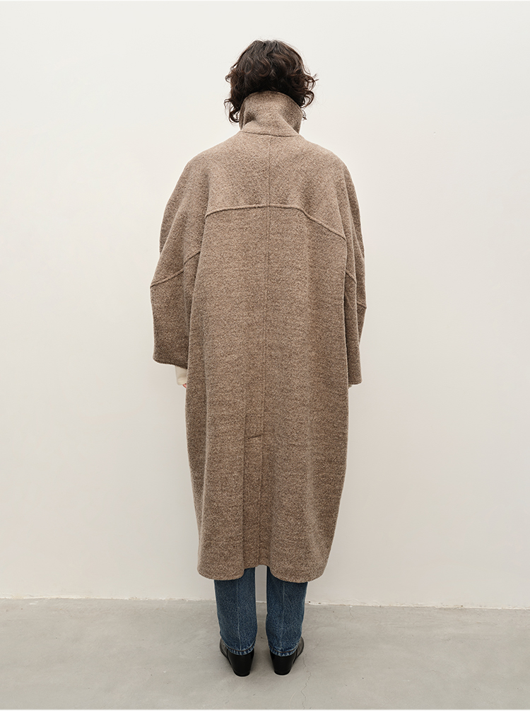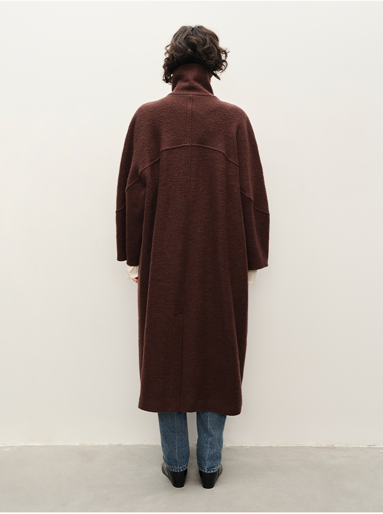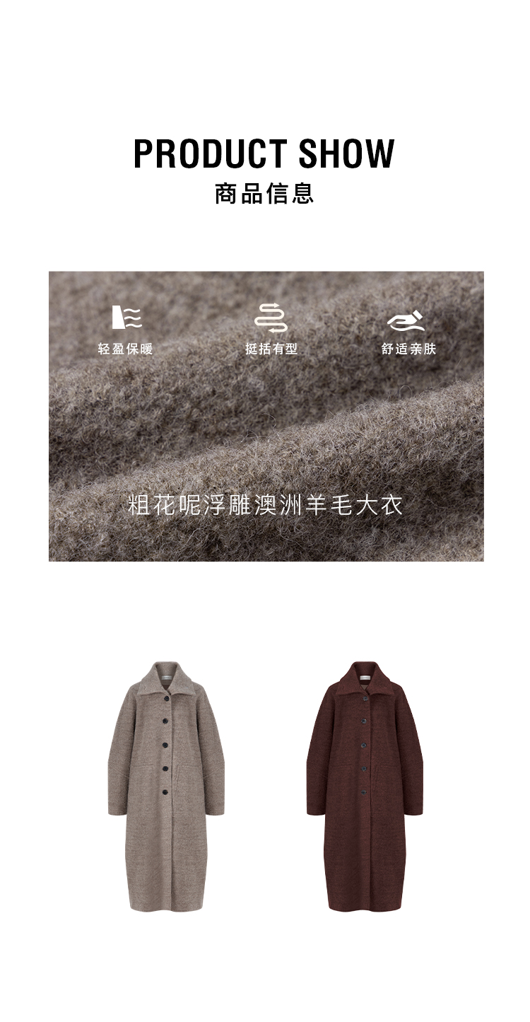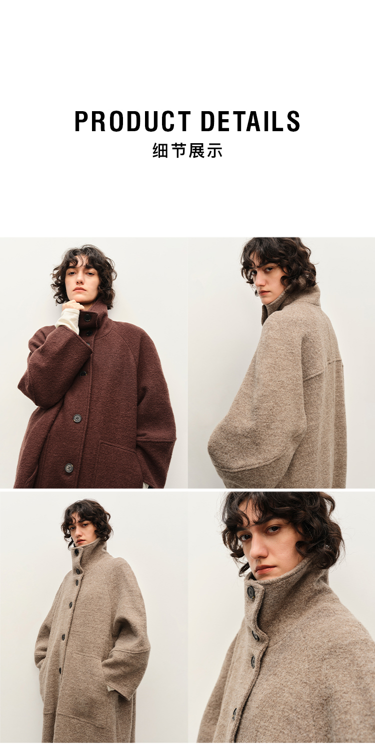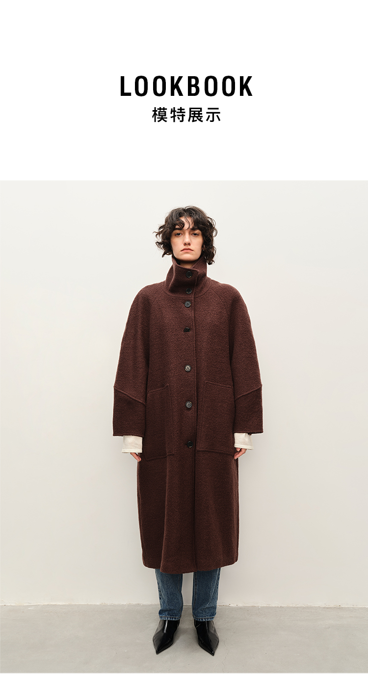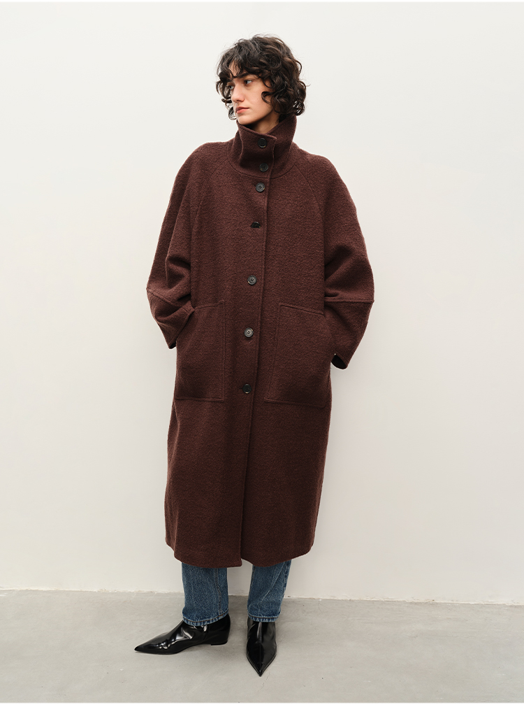 HIDEMI 极简立领大廓形经典落肩粗花呢浮雕澳洲羊毛厚款纽扣式长款口袋大衣