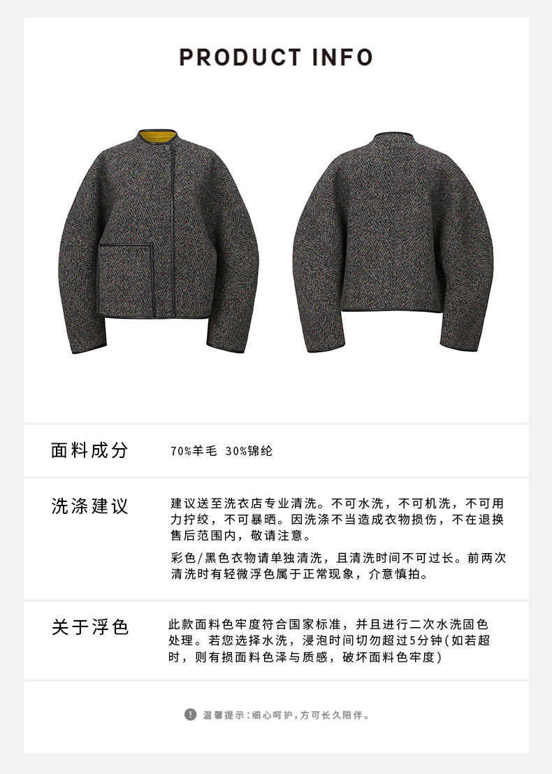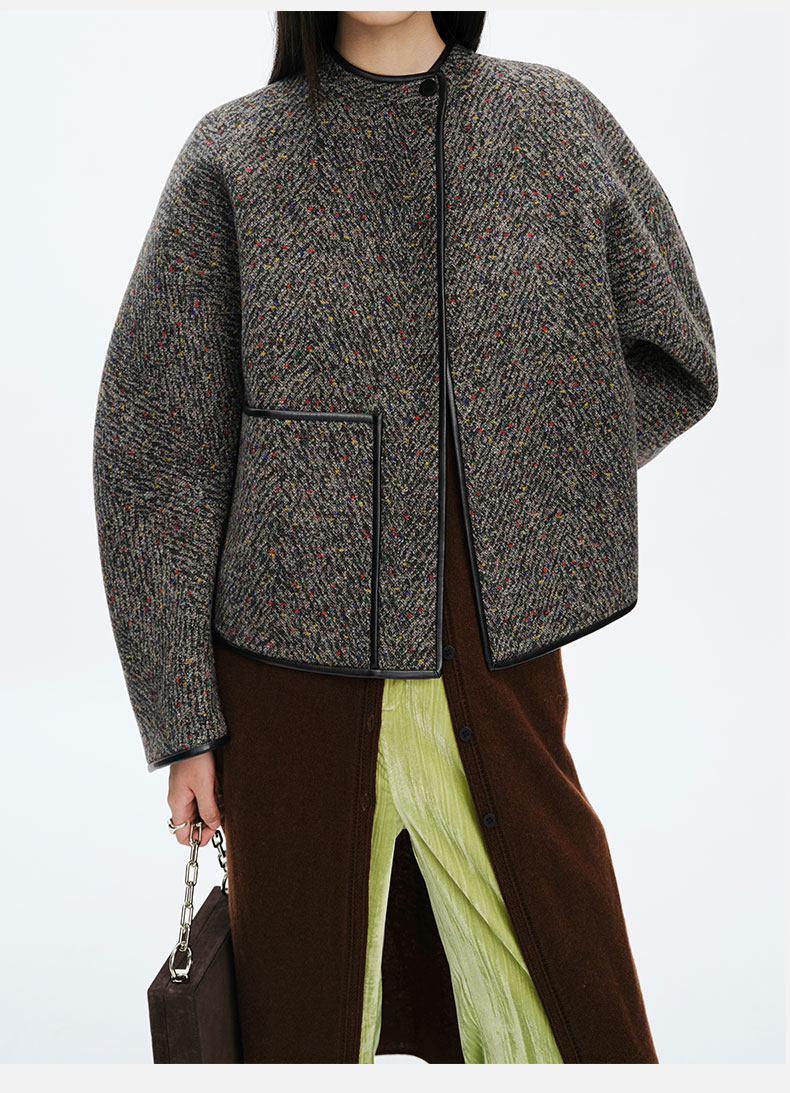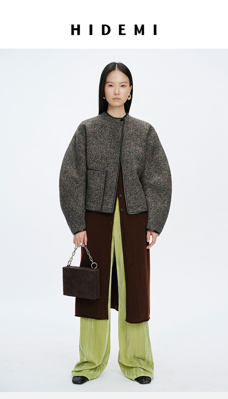 HIDEMI 人字提花双面双色羊毛皮边镶嵌一粒扣廓形短大衣外套