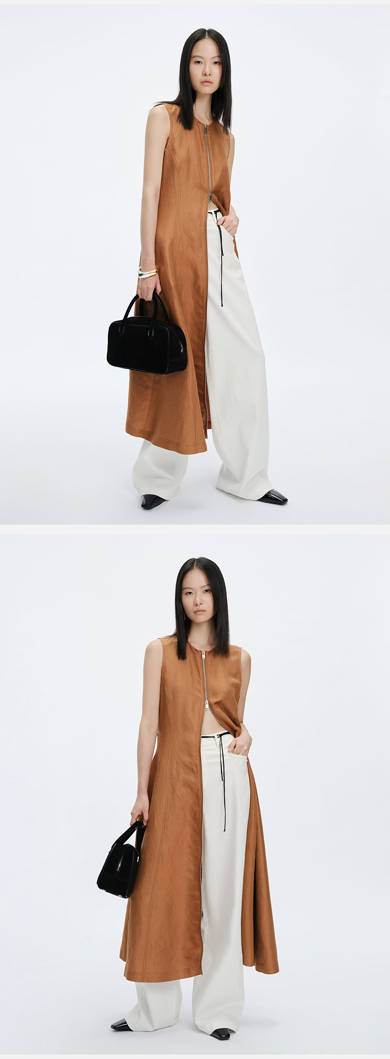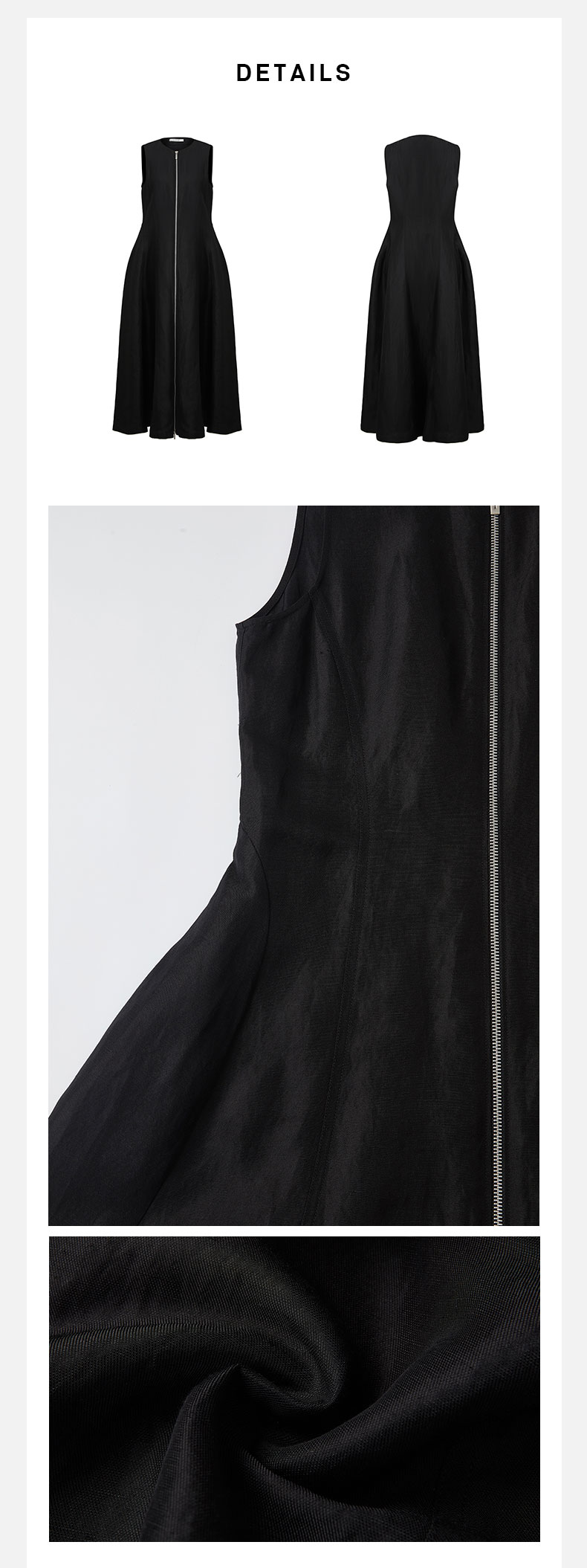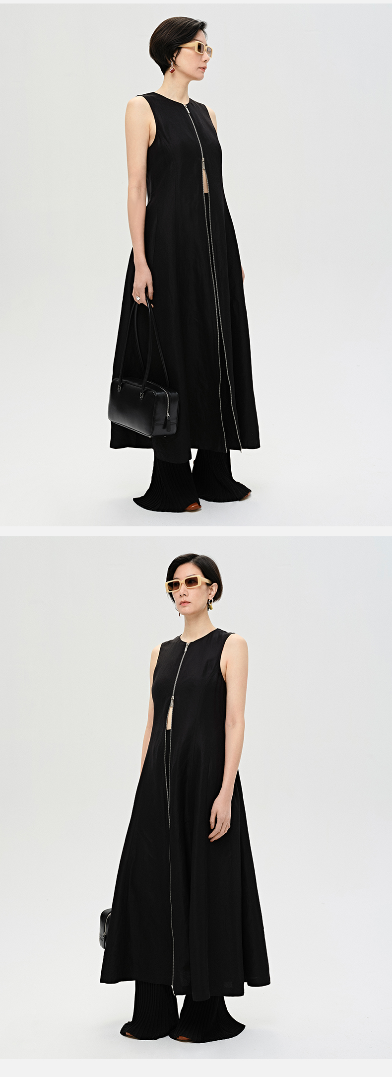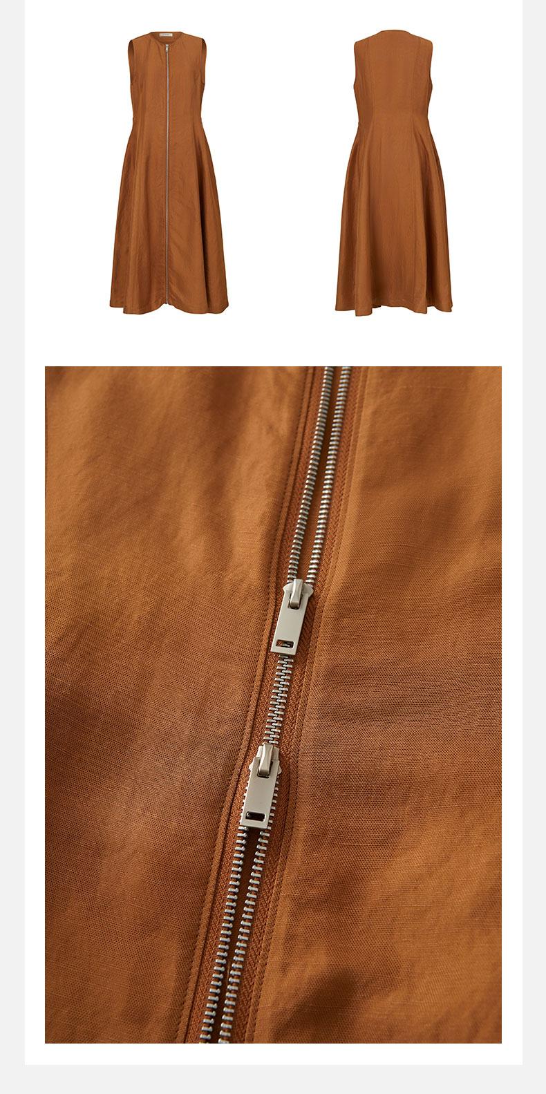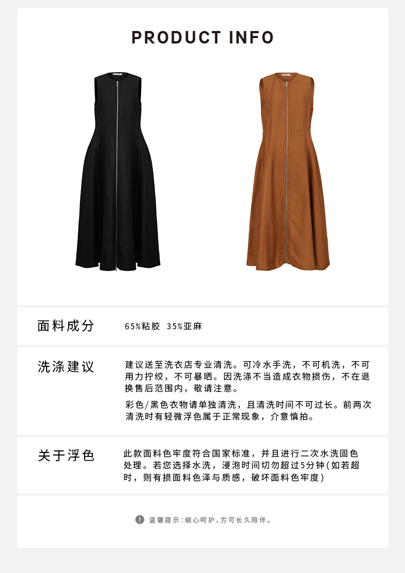 HIDEMI 简约设计感圆领拉链式收腰显瘦亚麻连衣裙 黑色/咖啡色