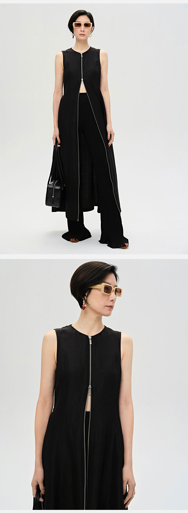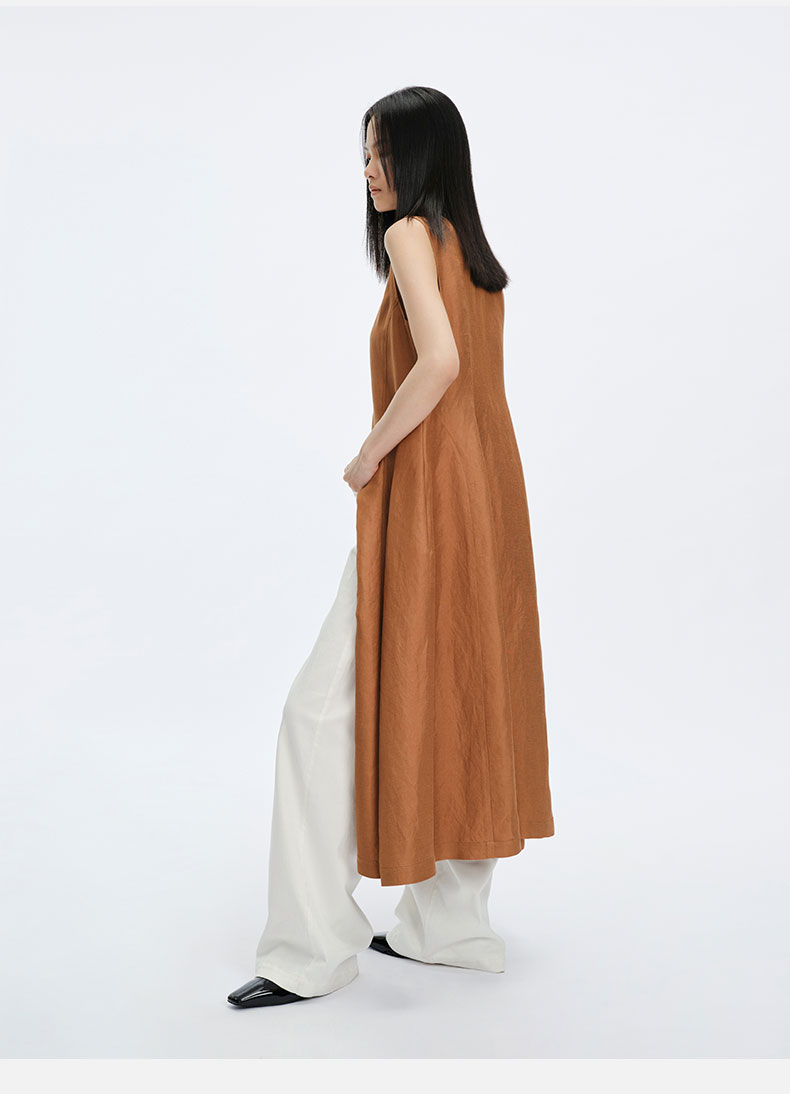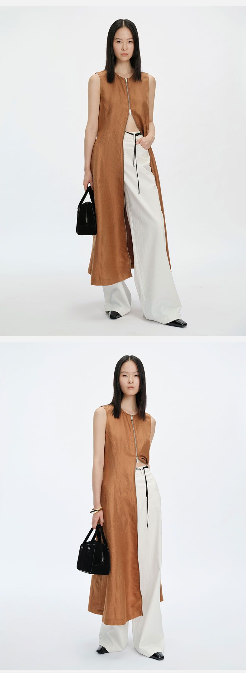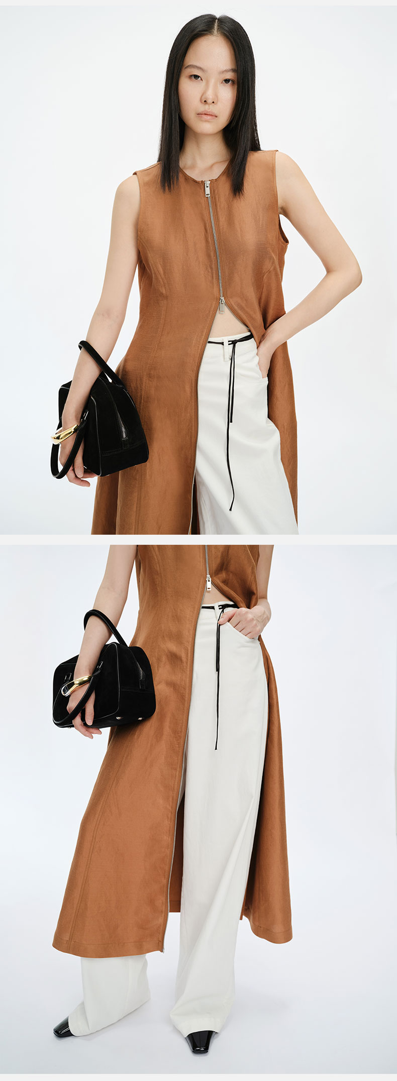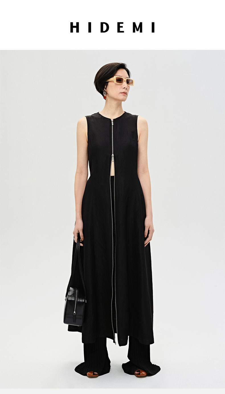 HIDEMI 简约设计感圆领拉链式收腰显瘦亚麻连衣裙 黑色/咖啡色