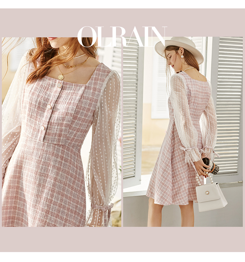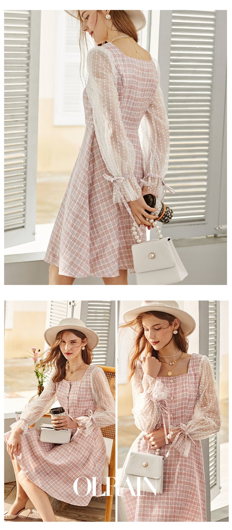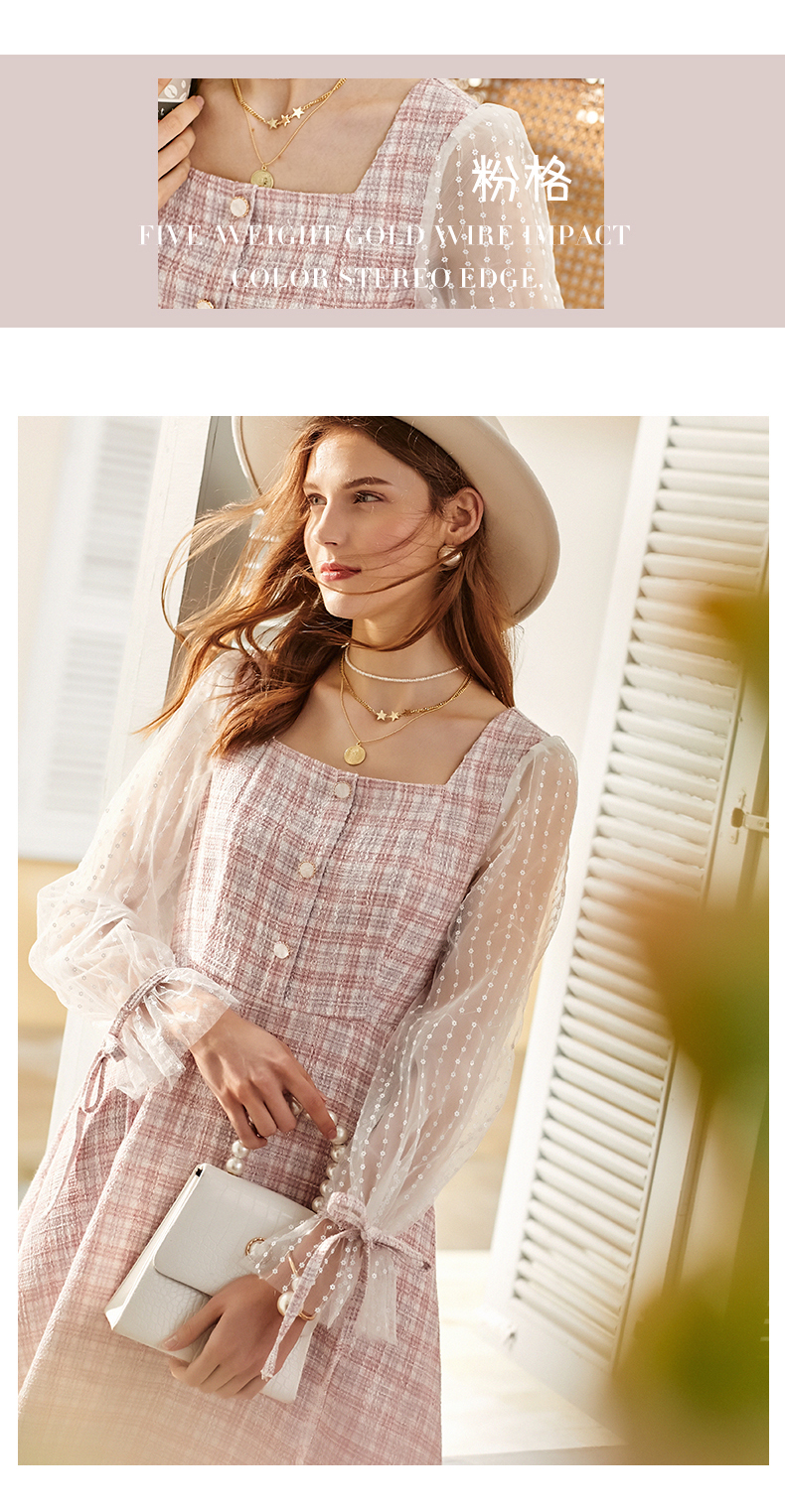 欧芮儿法式优雅网纱拼接格子连衣裙女方领中长裙女