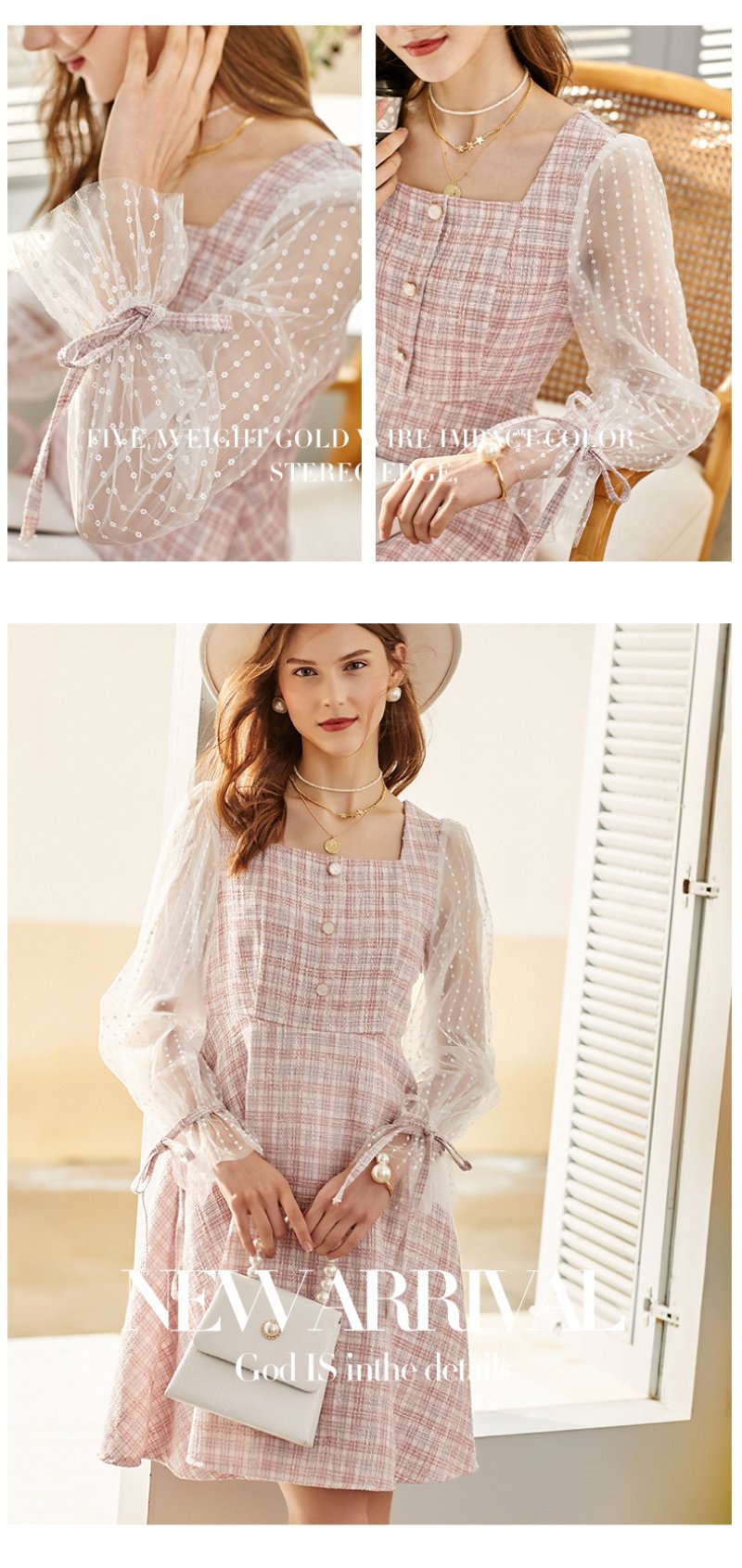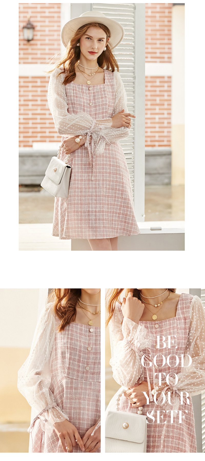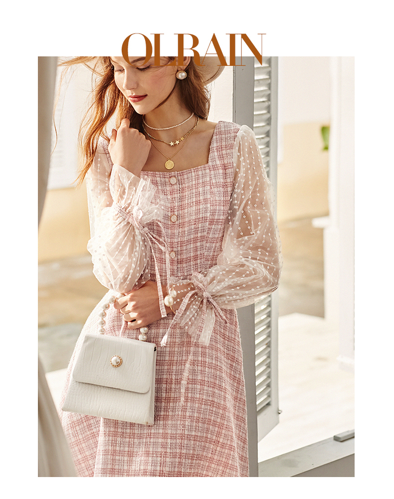 欧芮儿法式优雅网纱拼接格子连衣裙女方领中长裙女