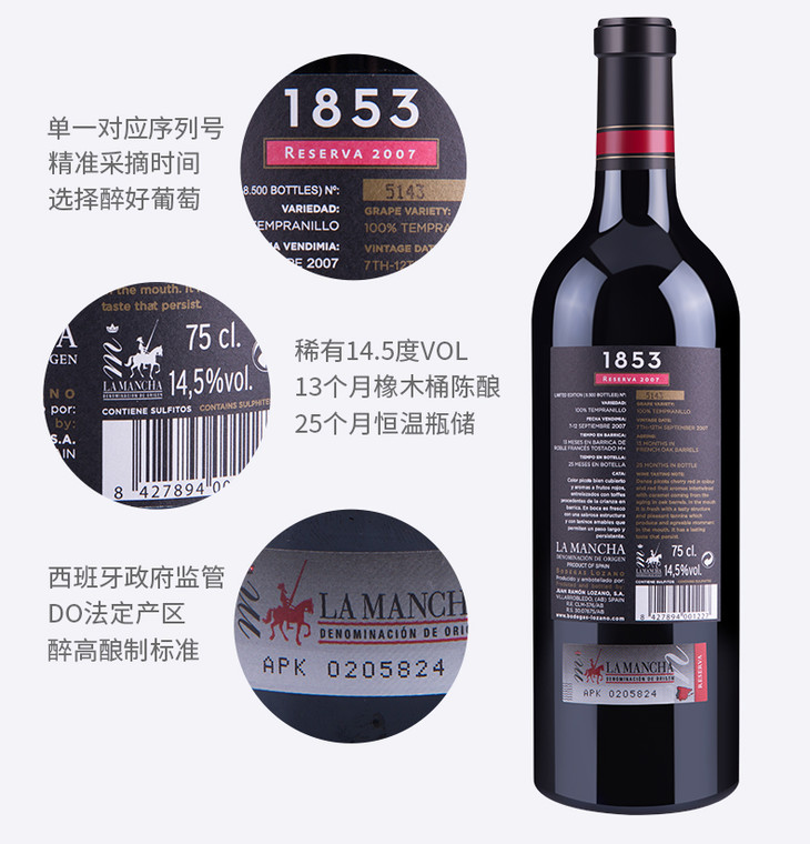 【镇店之宝·洛萨诺1853】家族私酿 酒庄原瓶进口 DO级 1853 干红葡萄酒 红酒 单支