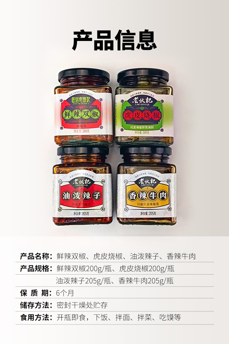 【川派辣椒酱4瓶组合系列】老伙记鲜辣双椒酱 虎皮烧椒酱 香辣牛肉酱 油泼辣子下饭酱拌面酱 四川特产调味酱料 传统手工匠作 正宗四川味道