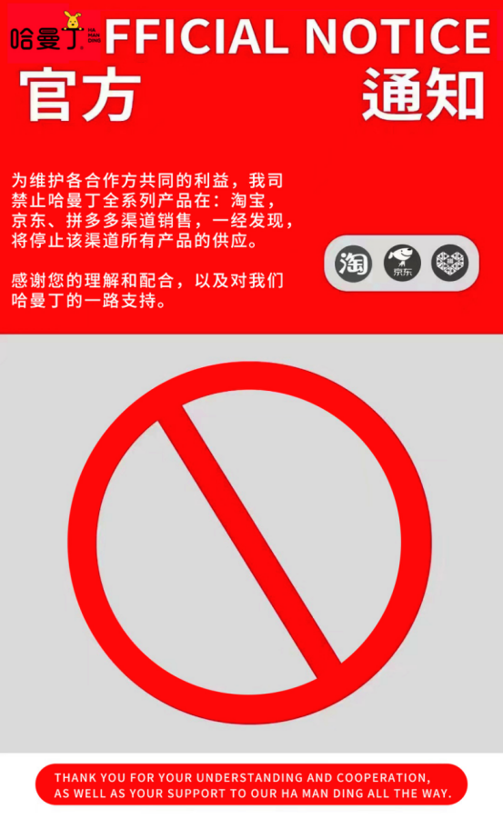 维护各合作方共同的利益,我司禁止哈曼丁全系列产品在:淘宝、京东、拼多多渠道销售,一经发现,将停止该渠道所有产品的供应。 感谢您的理解和配合,以及对我们哈曼丁的一路支持