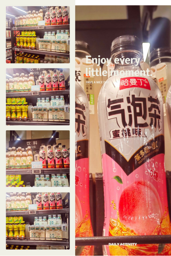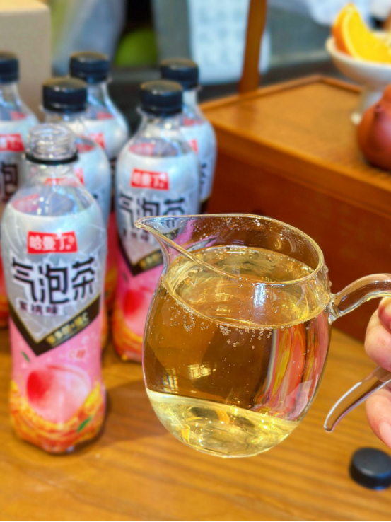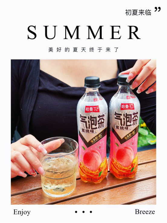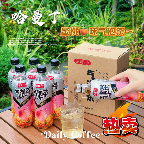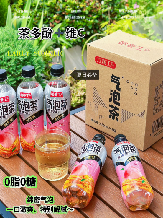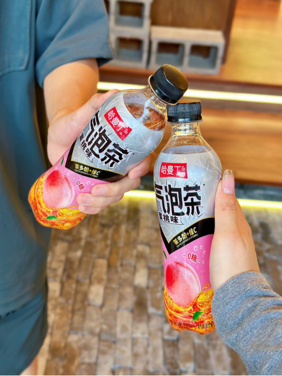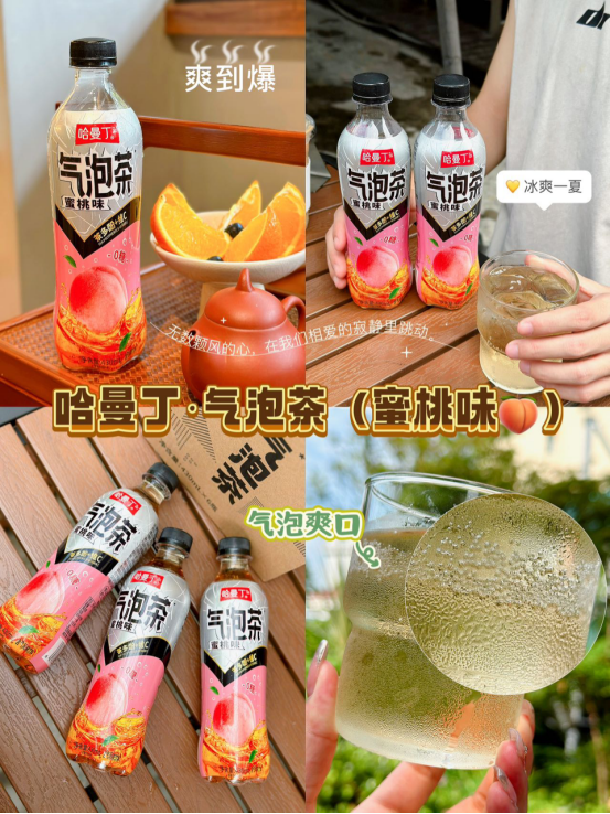 哈曼丁气泡茶,添加天然红茶 0糖,0脂,0能量 不仅提供了清爽的口感 还为消费者提供了一个更为健康的饮品选择 哈曼丁气泡茶(蜜桃味) 结合了茶与气泡的特色,享受清新口感的冲击