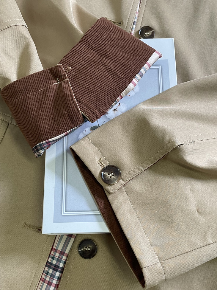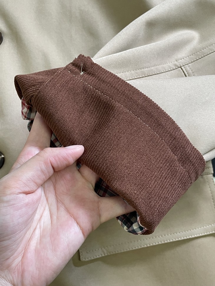 普通风衣总容易显得沉闷 但这款直接用领口 + 袖口灯芯绒拼接 瞬间打破单调!! 灯芯绒的细腻绒毛质感特别显高级 领口系上扣子时,能露出一圈温柔的肌理 比纯色风衣多了份精致!! 袖口挽起来的时候,灯芯绒细节刚好露出来 随便抬手都能成为亮点,不会让人觉得很普通 关键这设计还特实用 领口和袖口是平时最容易磨损的地方 灯芯绒比普通面料更耐磨 能大大延长风衣的穿著寿命 而且灯芯绒保暖性更好,秋日早晚穿 能给脖子和手腕多一层保护 不用额外搭围巾也不冷 好看又好用,细节控直接爱了