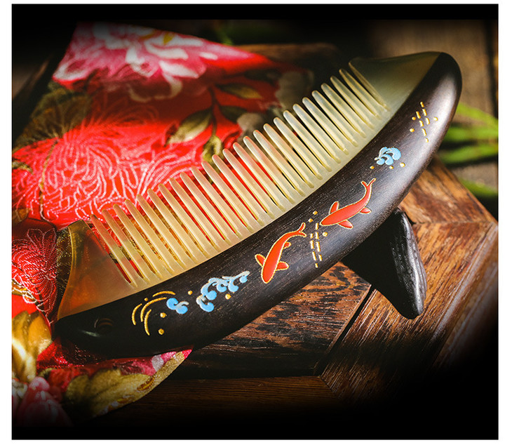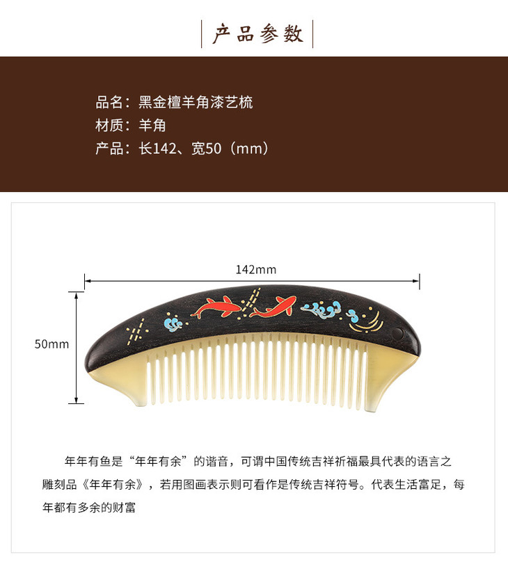 天然手工梳年年有余漆艺梳黑金檀木加羊角 谭匠木工艺 送女友 领导 长辈