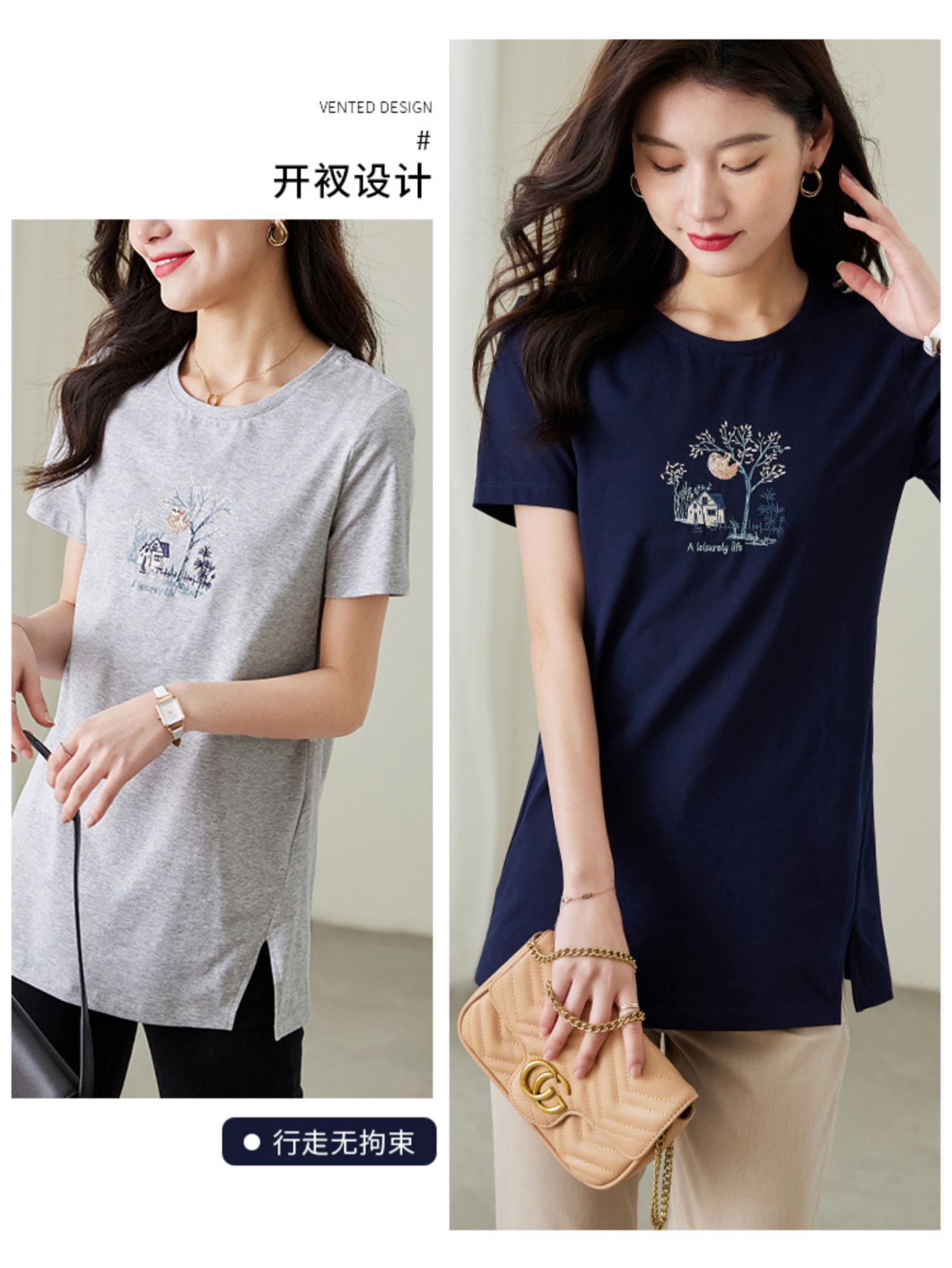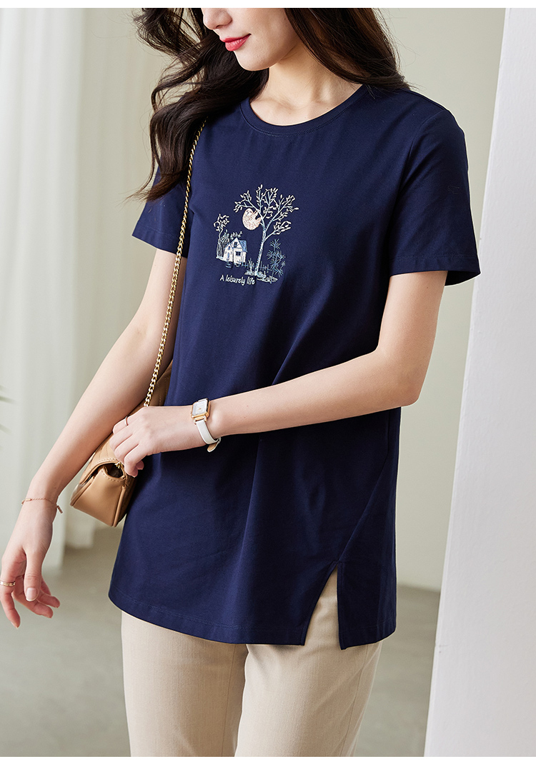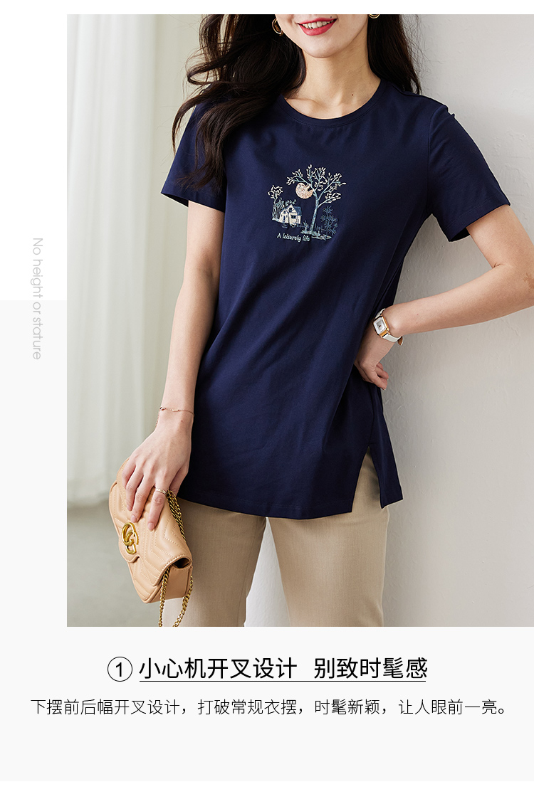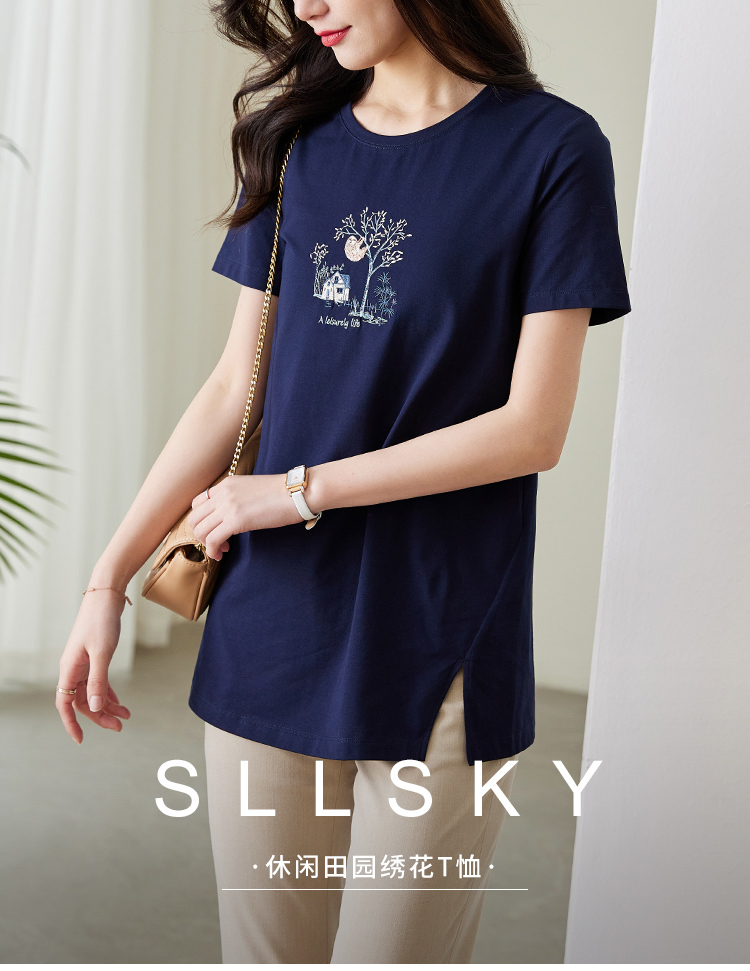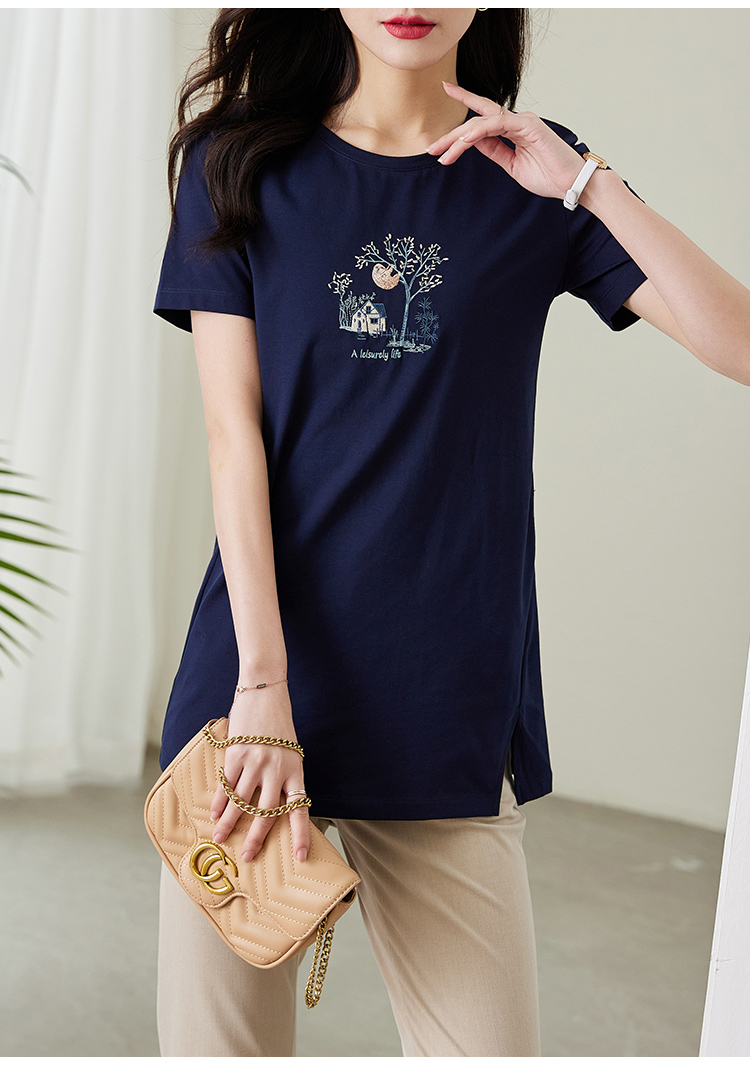 【专属特价】熙世界夏新款时尚休闲刺绣T恤女长袖宽松开叉圆领棉质上衣
