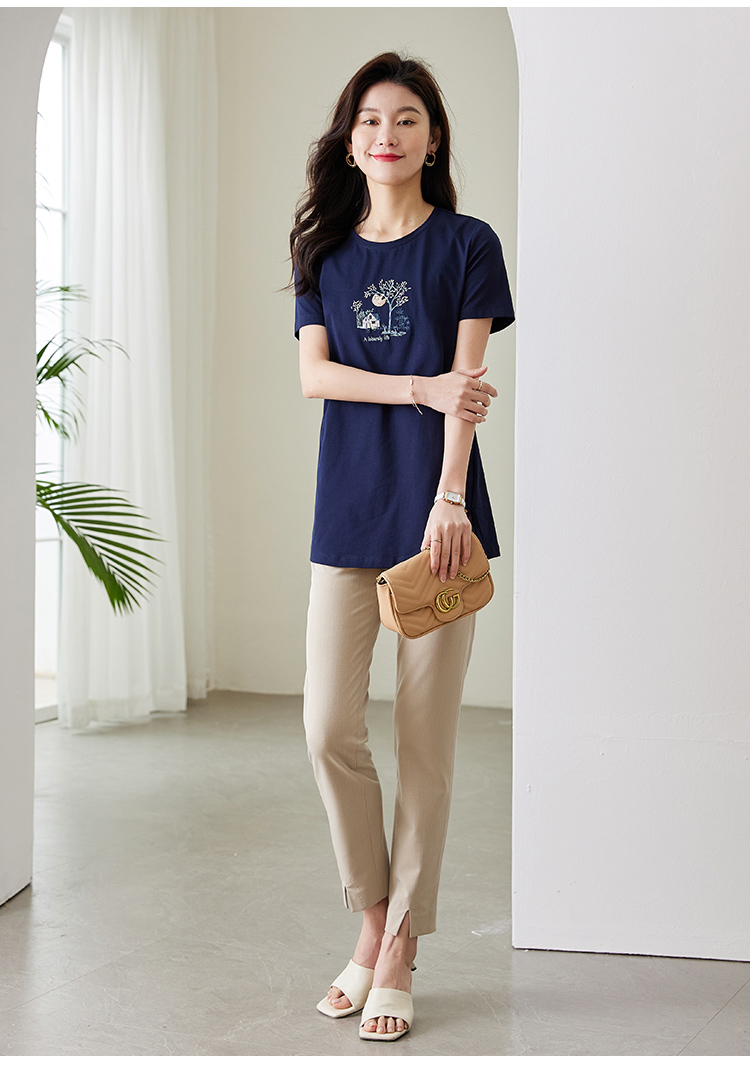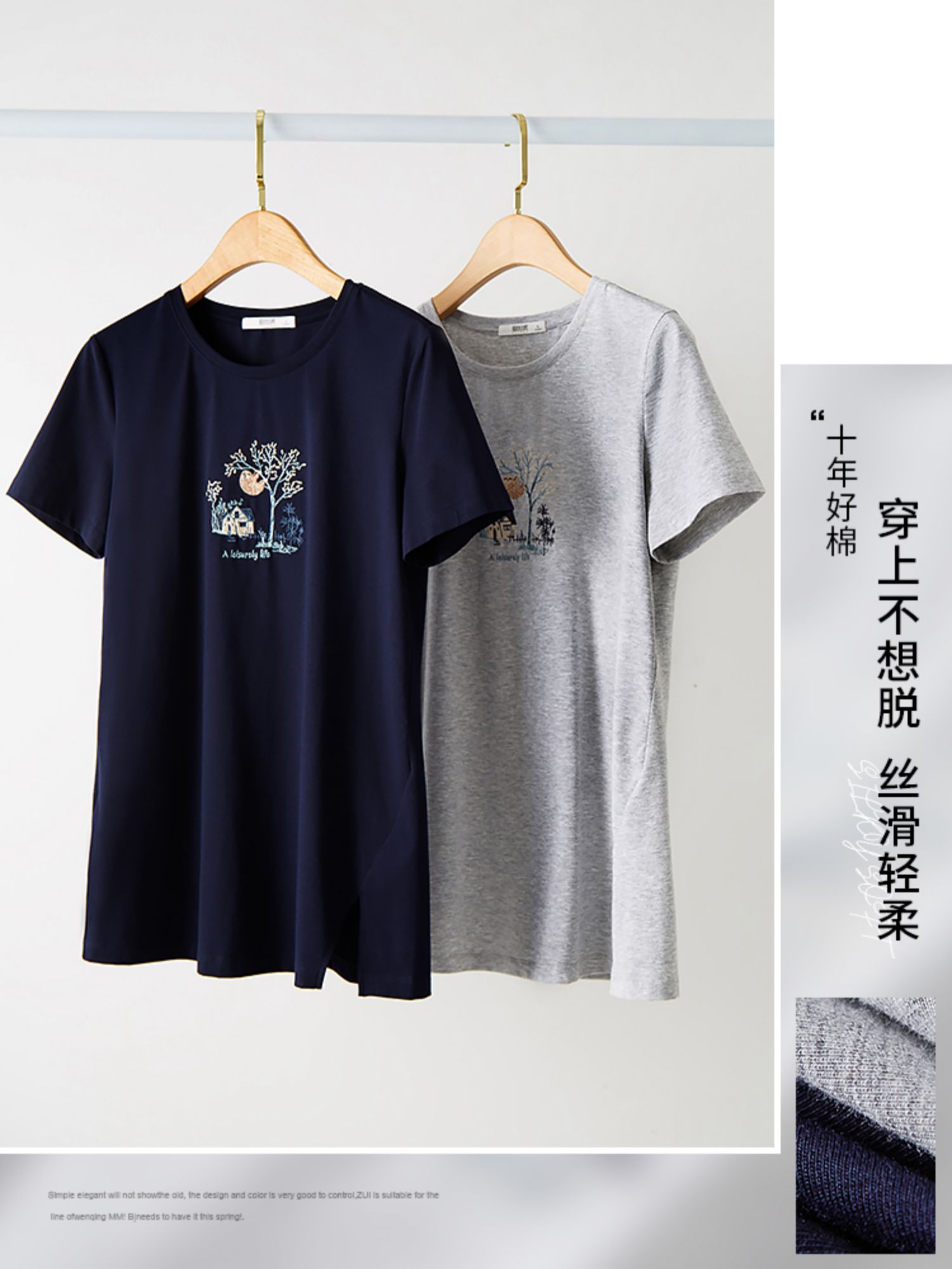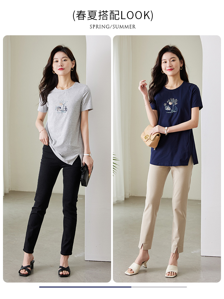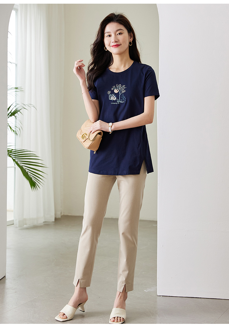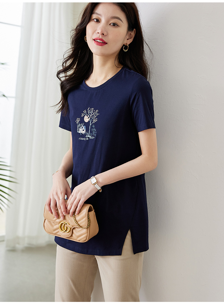 【专属特价】熙世界夏新款时尚休闲刺绣T恤女长袖宽松开叉圆领棉质上衣