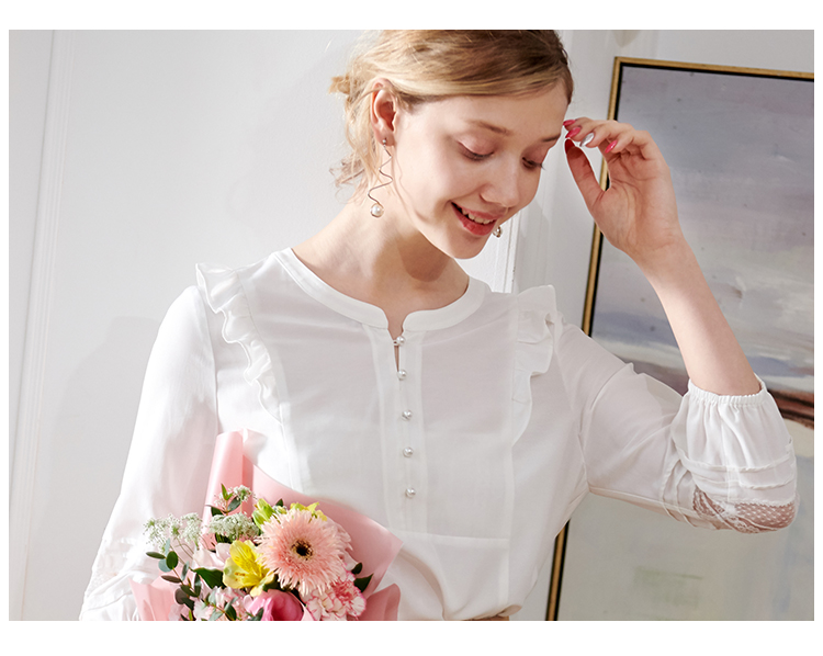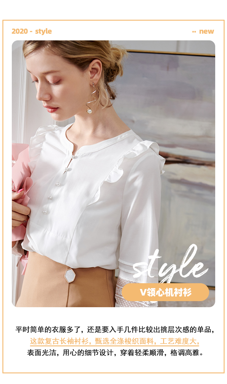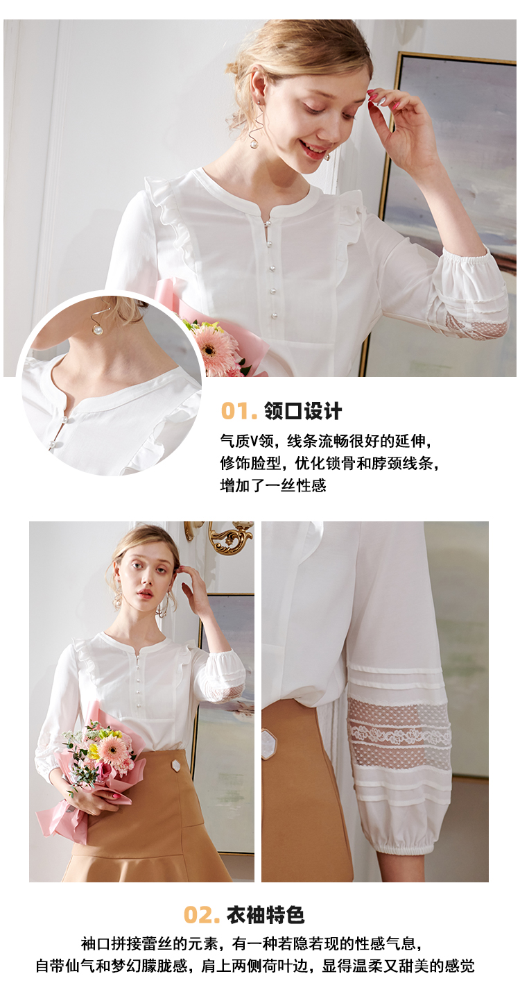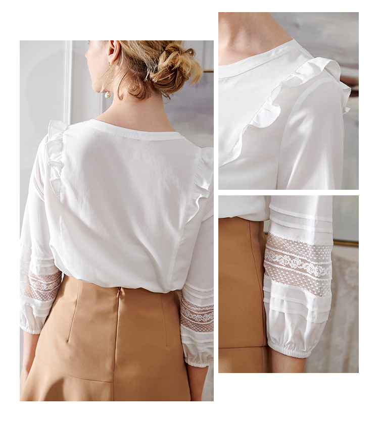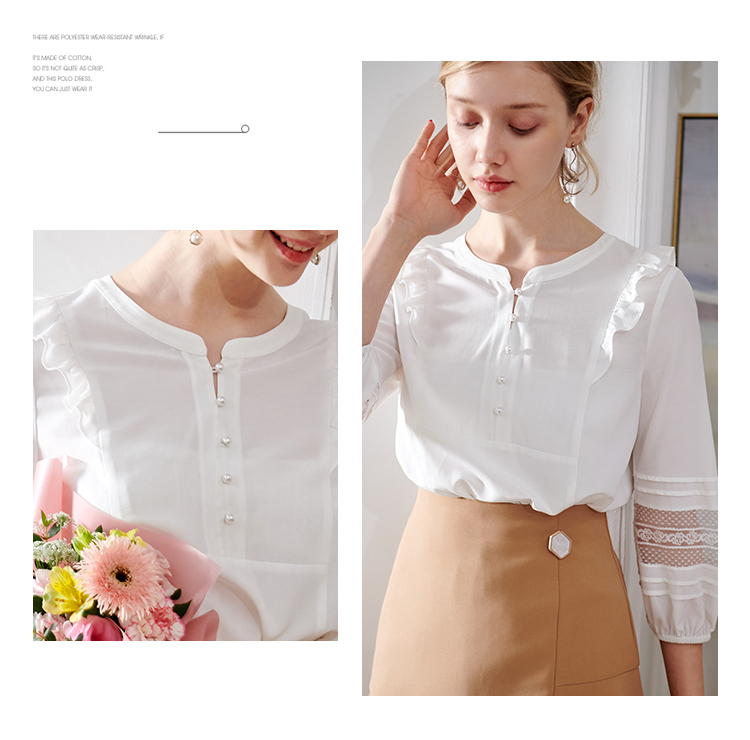 欧芮儿2020夏装新款七分袖白色衬衫女荷叶边衬衣百搭绣花透视上衣