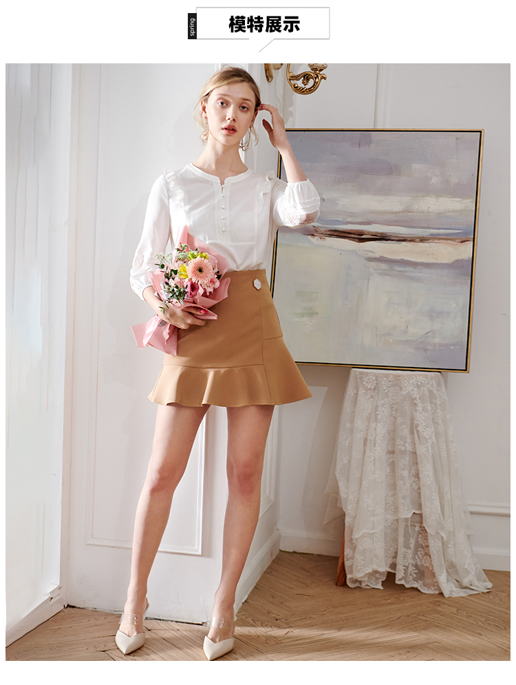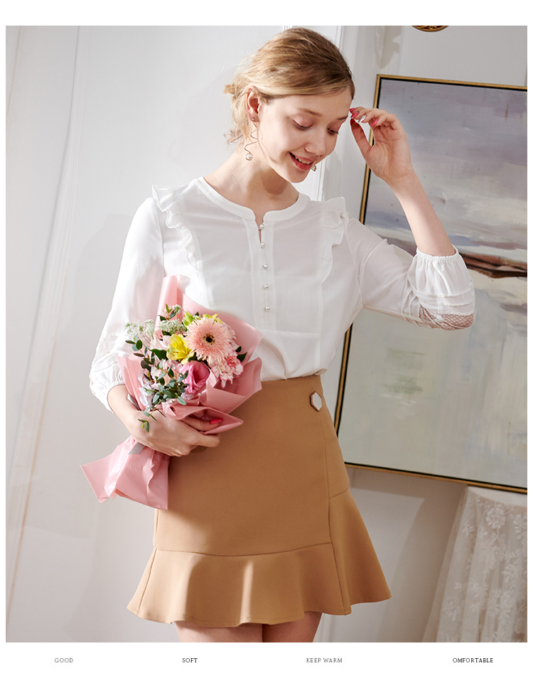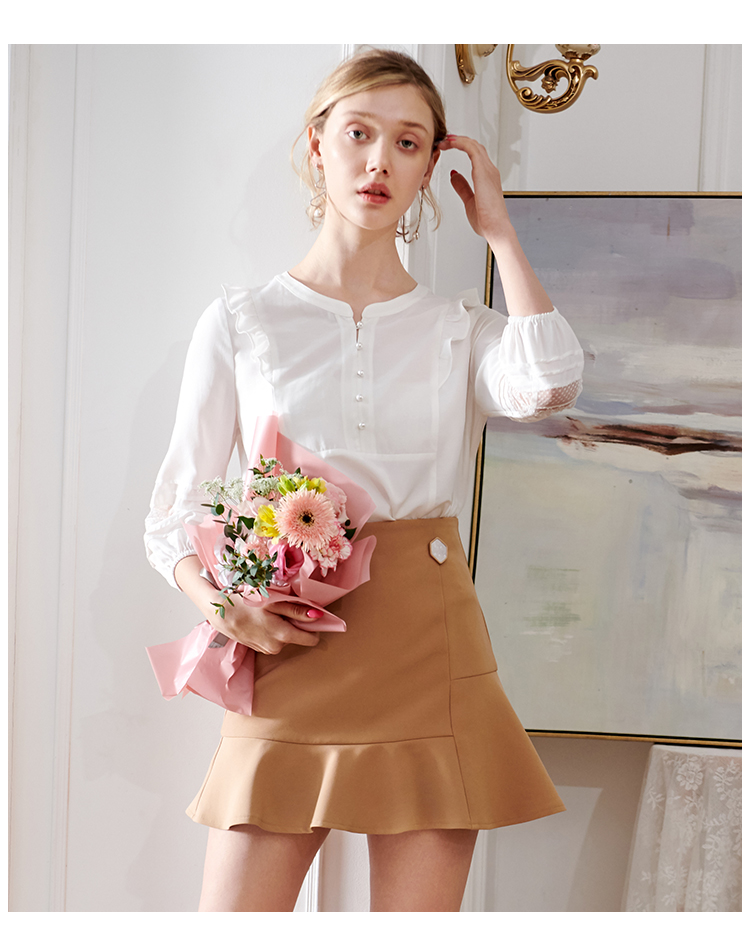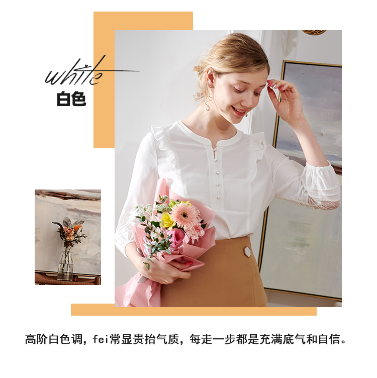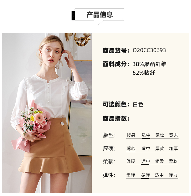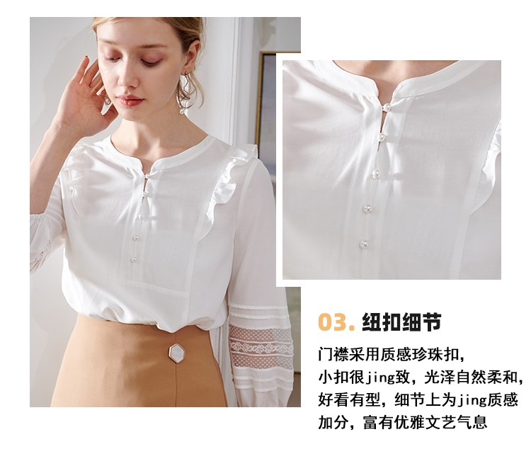 欧芮儿2020夏装新款七分袖白色衬衫女荷叶边衬衣百搭绣花透视上衣