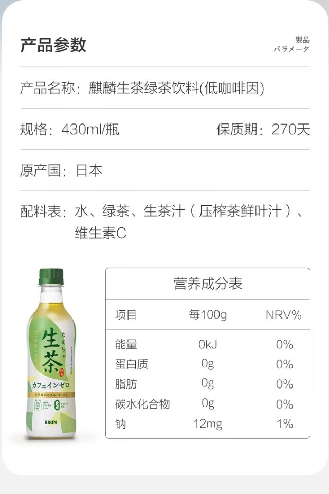 麒麟生茶绿茶饮料(低咖啡因)430ml