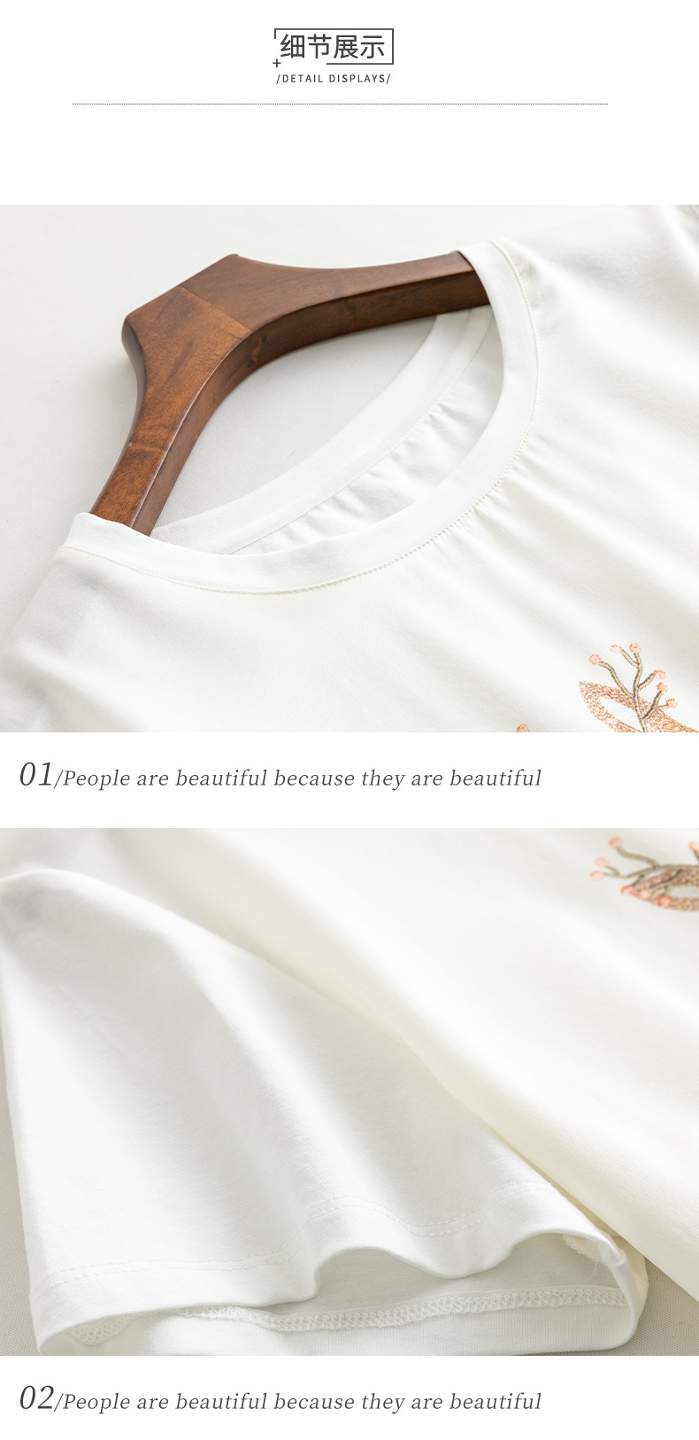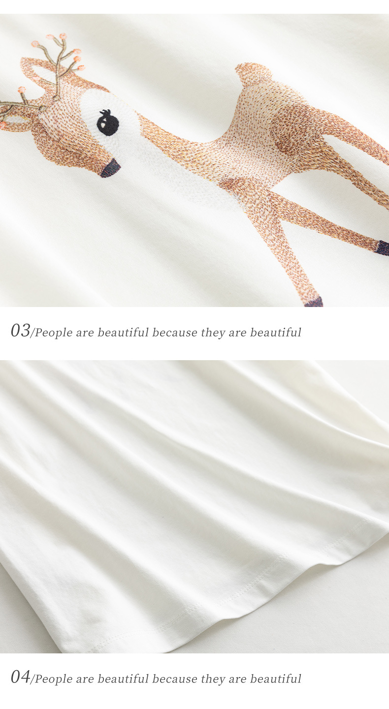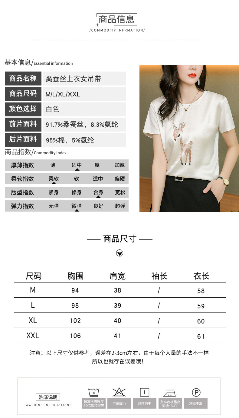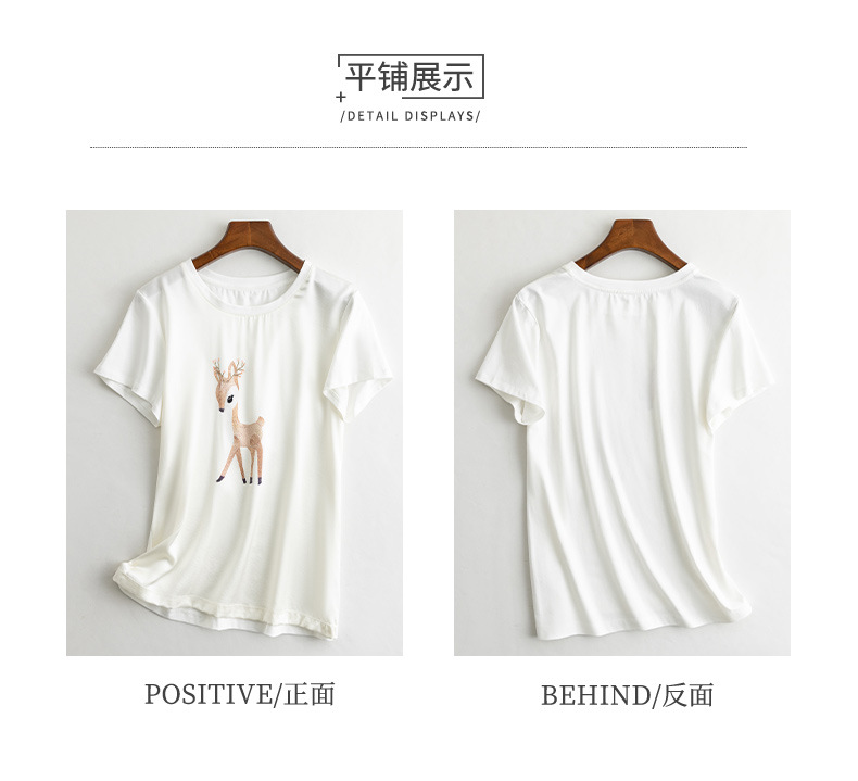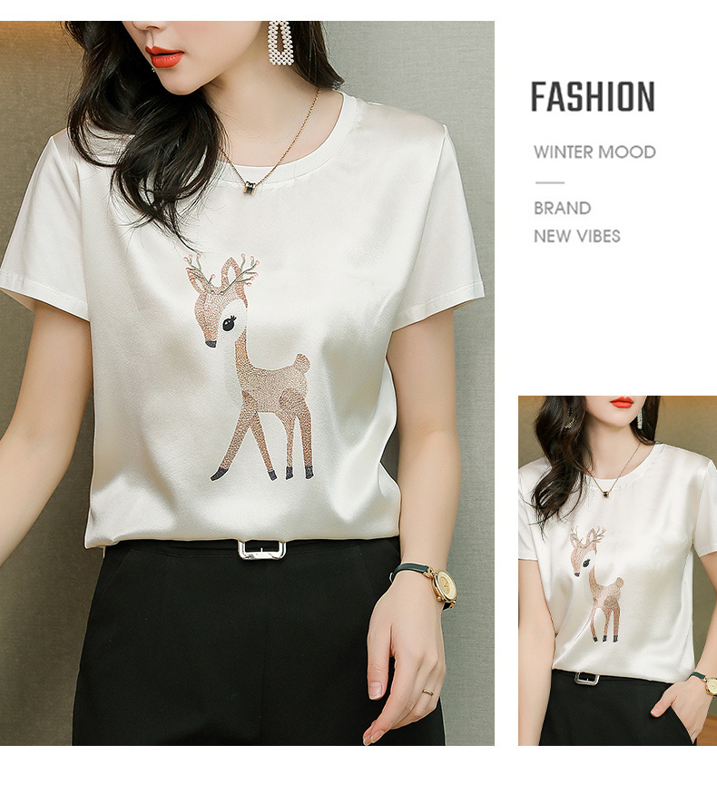 时尚圆领短袖,桑蚕丝小鹿印花白色上衣HR-WX21709