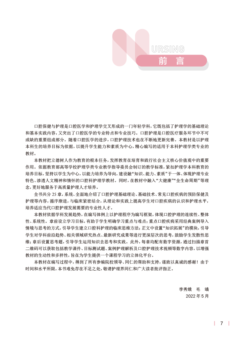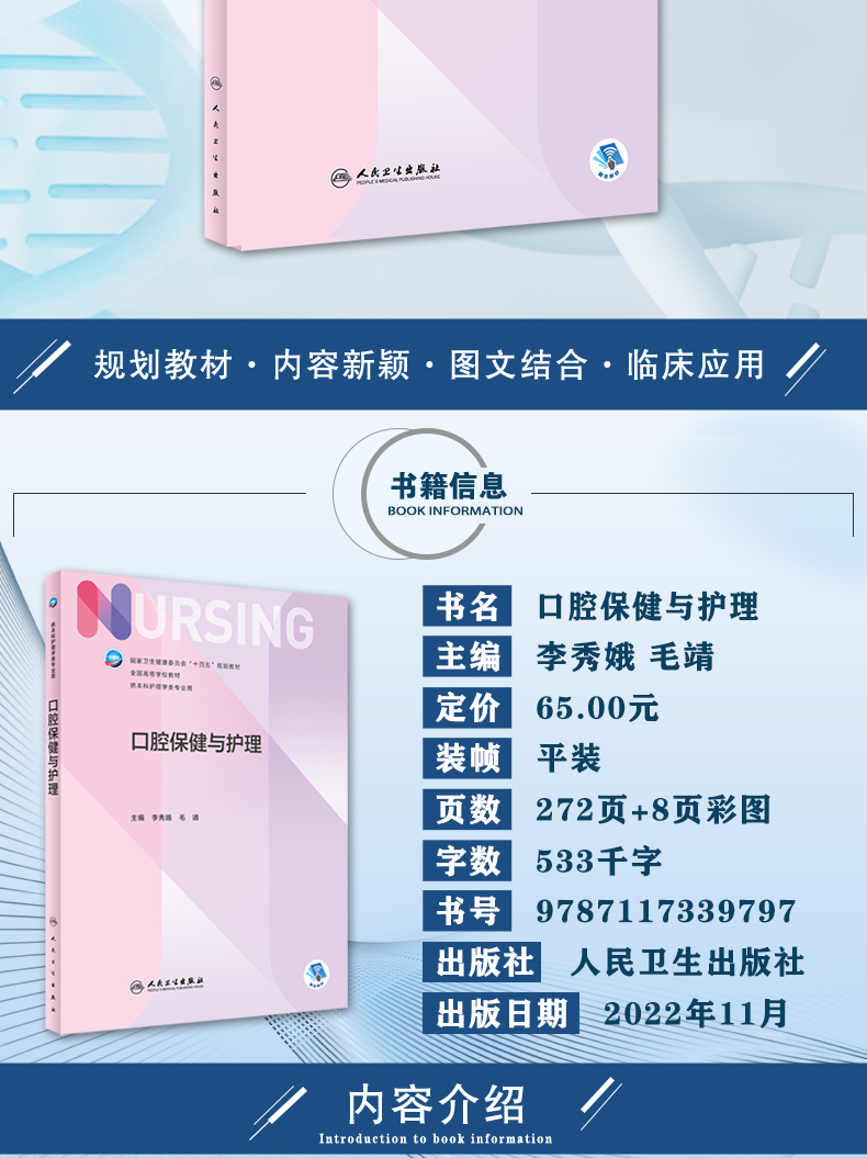 口腔保健与护理 十四五规划教材 7版本科护理全国高等学校教材 供本科护理学类专业用 李秀娥 毛靖 人民卫生出版社9787117339797