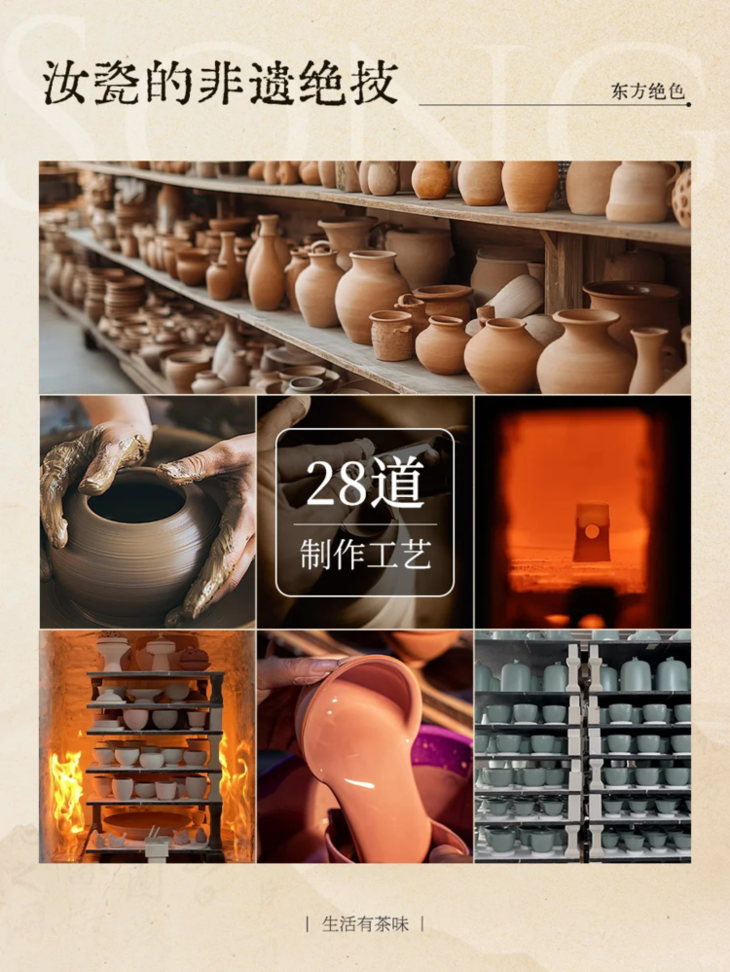 采用100%天然矿石釉料,经过36道工序,45天制作,1320℃稳定高窑火而生,比普瓷高100℃的淬炼。