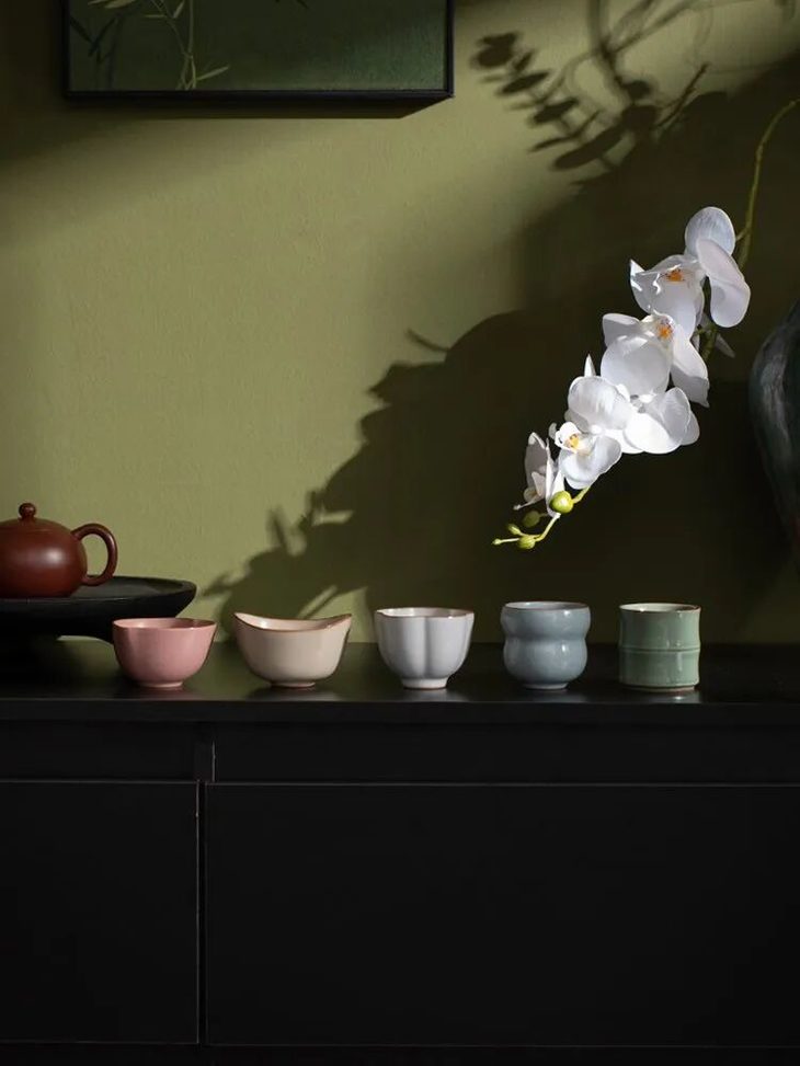 五款杯子有着五款不同的釉色,带着淡淡的朦胧感,温柔得能掐出水来。摸上去滑溜溜的,像一块上好的美玉。