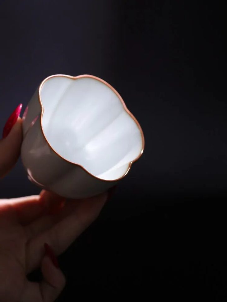 普通茶杯都是圆形的、方形的,但这个汝窑杯是带有国人喜欢的形状:葫芦、元宝、竹节、梅花、蟠桃。