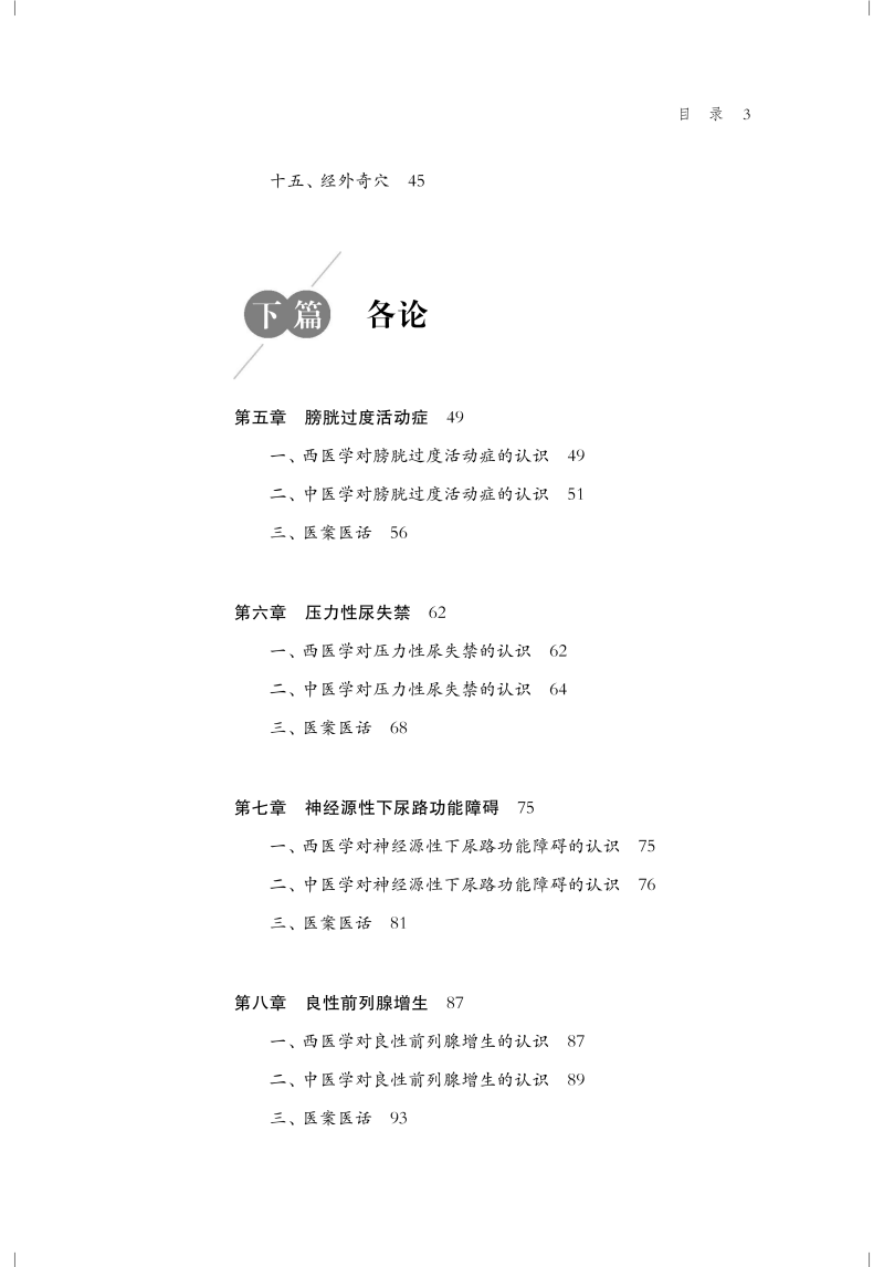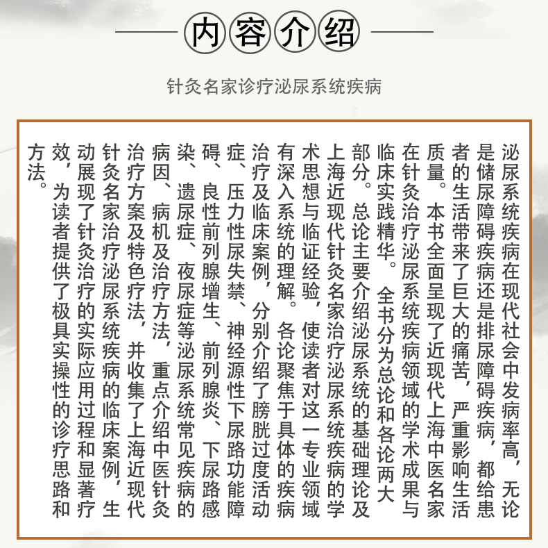 泌尿系统疾病在现代社会中发病率高,无论是储尿障碍疾病还是排尿障碍疾病,都给患者的生活带来了巨大的痛苦,严重影响生活质量。本书全面呈现了近现代上海中医名家在针灸治疗泌尿系统疾病领域的学术成果与临床实践精华。 全书分为总论和各论两大部分。总论主要介绍泌尿系统的基础理论及上海近现代针灸名家治疗泌尿系统疾病的学术思想与临证经验,使读者对这一专业领域有深入系统的理解。各论聚焦于具体的疾病治疗及临床案例,分别介绍了膀胱过度活动症、压力性尿失禁、神经源性下尿路功能障碍、良性前列腺增生、前列腺炎、下尿路感染、遗尿症、夜尿症等泌尿系统常见疾病的病因、病机及治疗方法,重点介绍中医针灸治疗方案及特色疗法,并收集了上海近现代针灸名家治疗泌尿系统疾病的临床案例,生动展现了针灸治疗的实际应用过程和显著疗效,为读者提供了极具实操性的诊疗思路和方法。