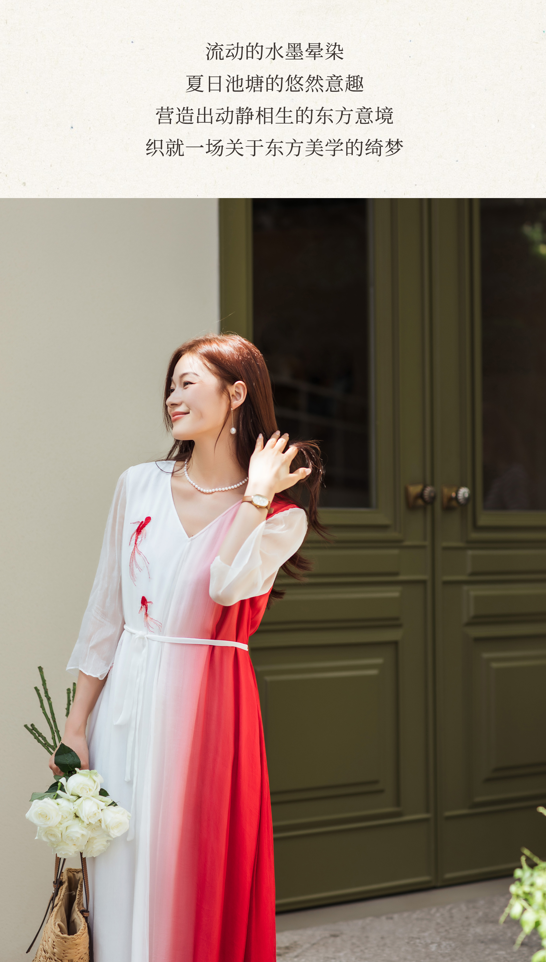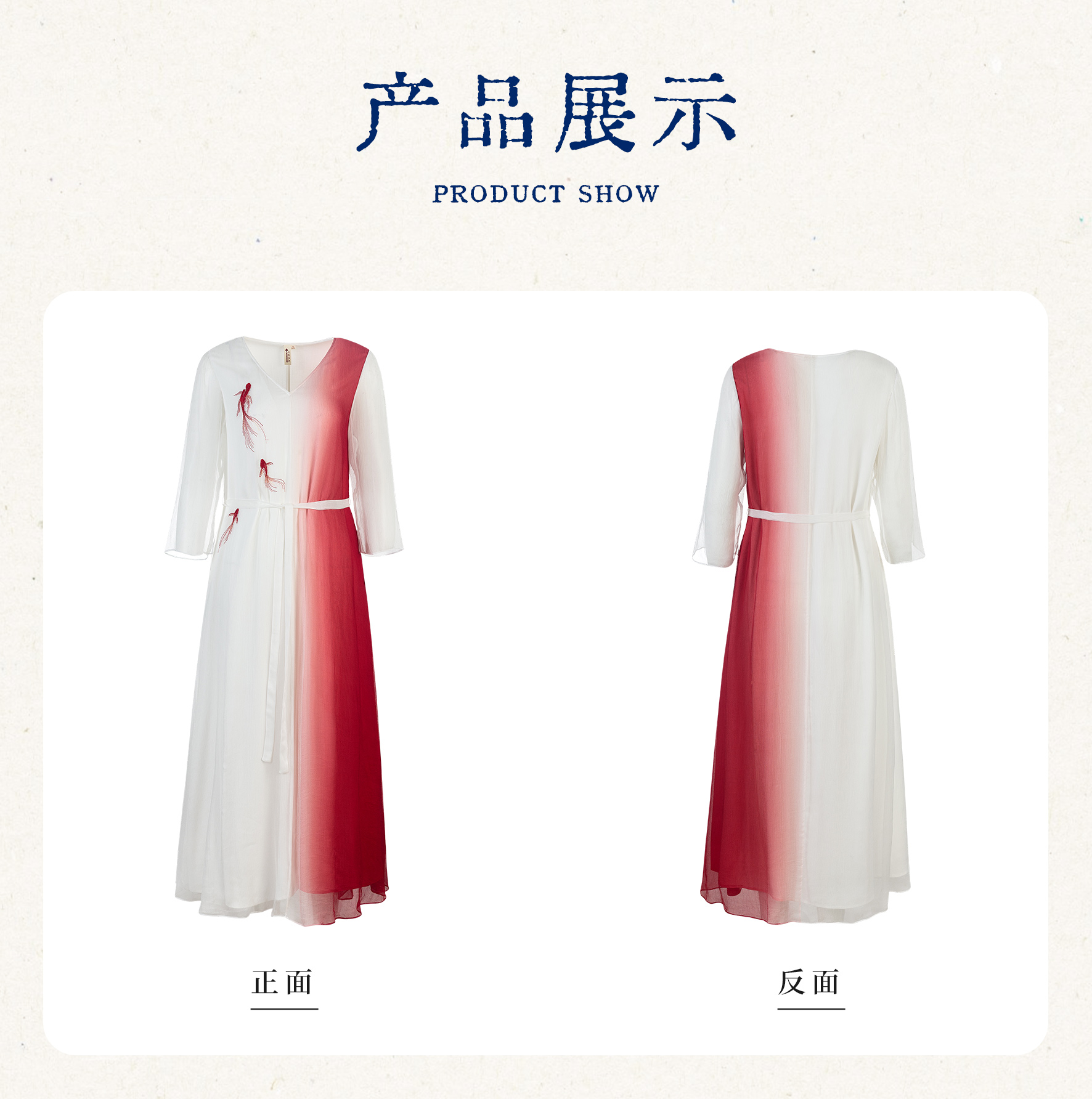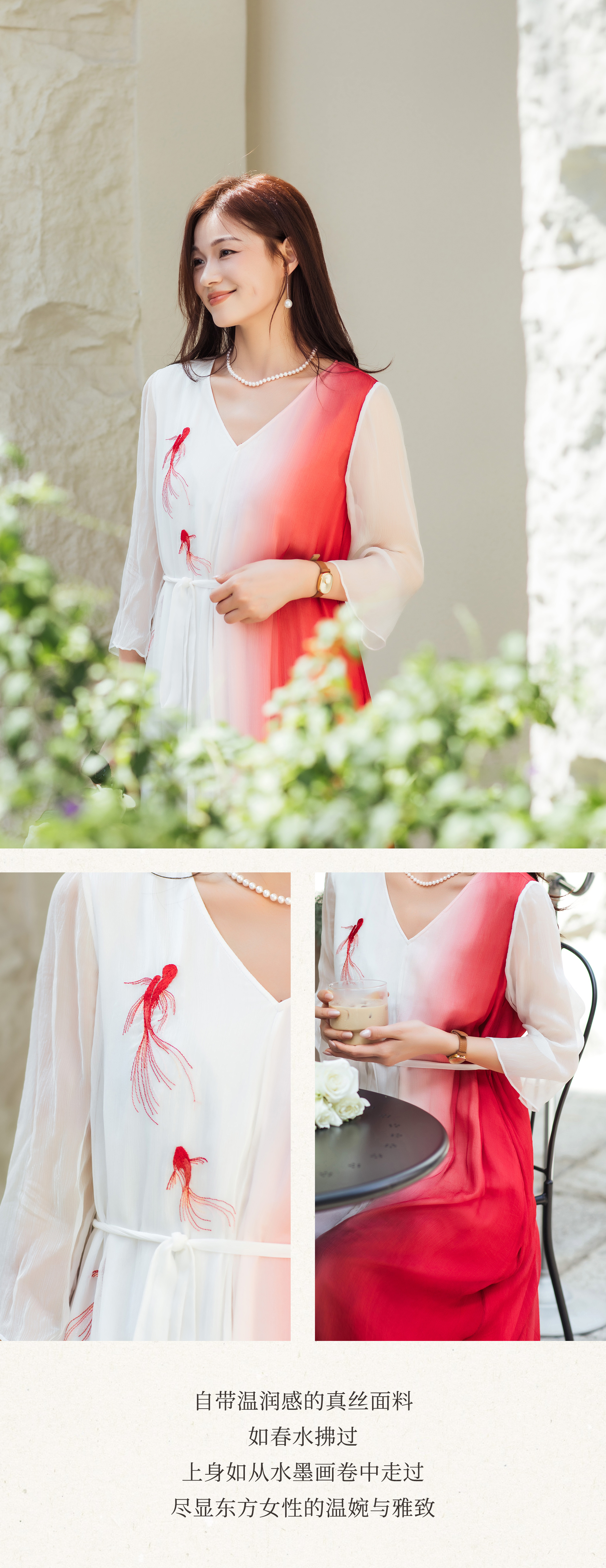 【林栖设计小店】【林栖推荐】锦鲤渐变色桑蚕丝连衣裙 夏季新款气质V领长裙N1953319