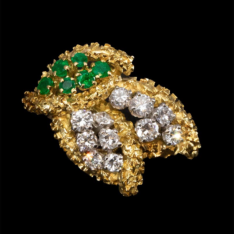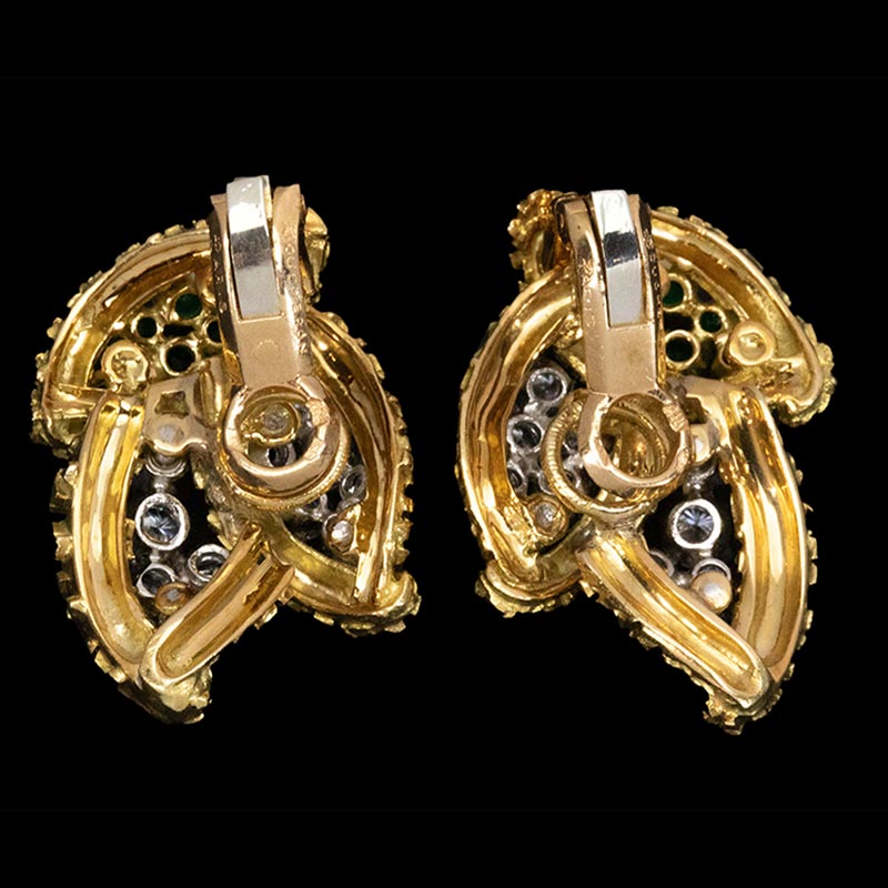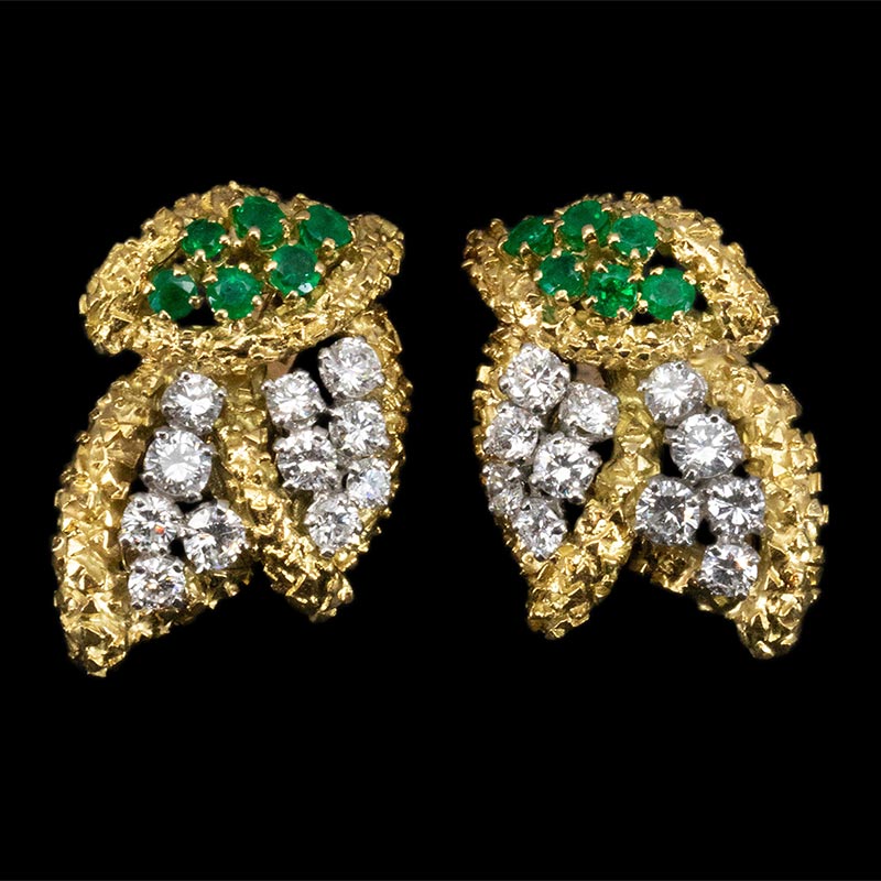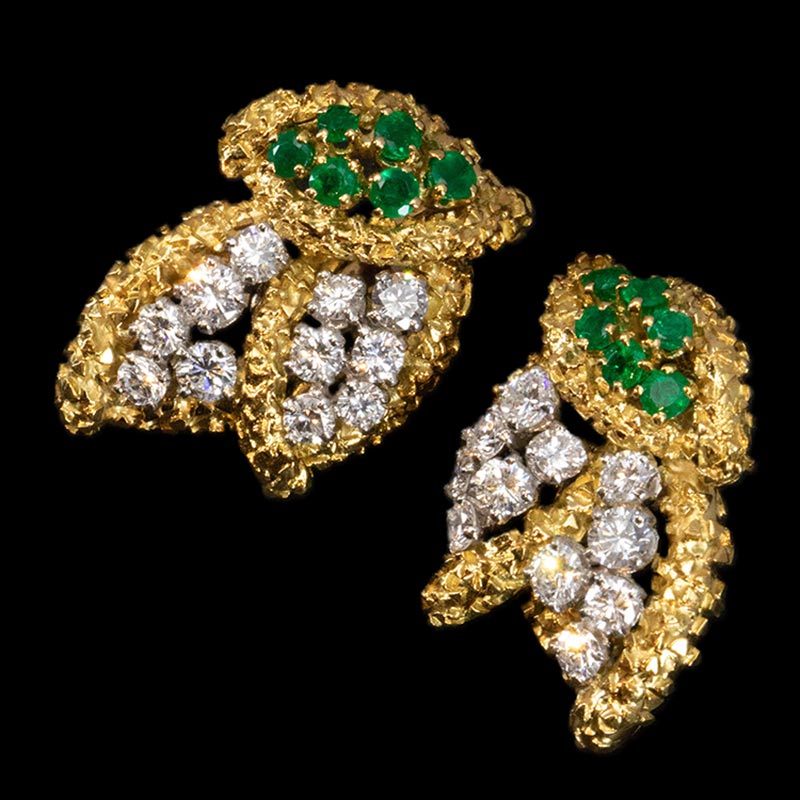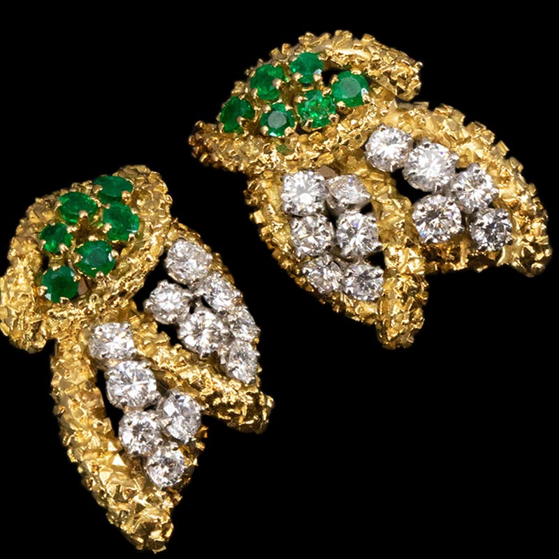 1965年代法国出品18K黄金铂金镶嵌钻石及祖母绿耳环一对