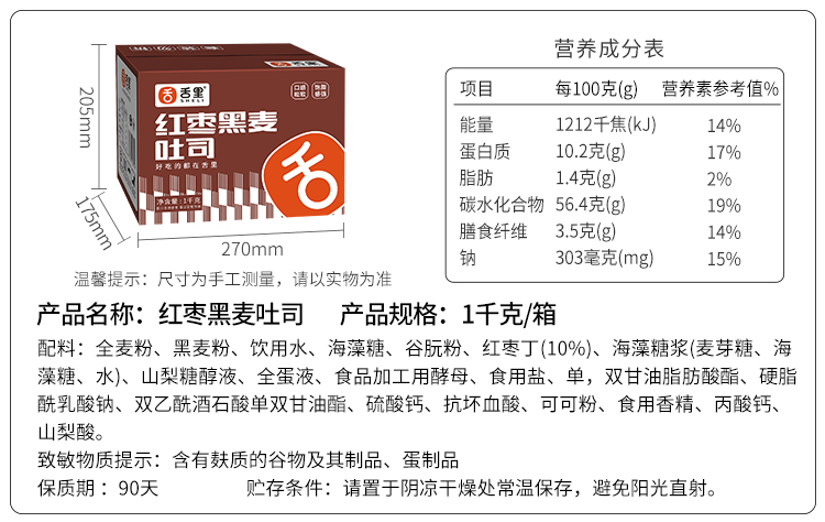 【舌里红枣黑麦吐司1000g】 黑麦全麦红枣丁 独立包装 一箱约20小袋