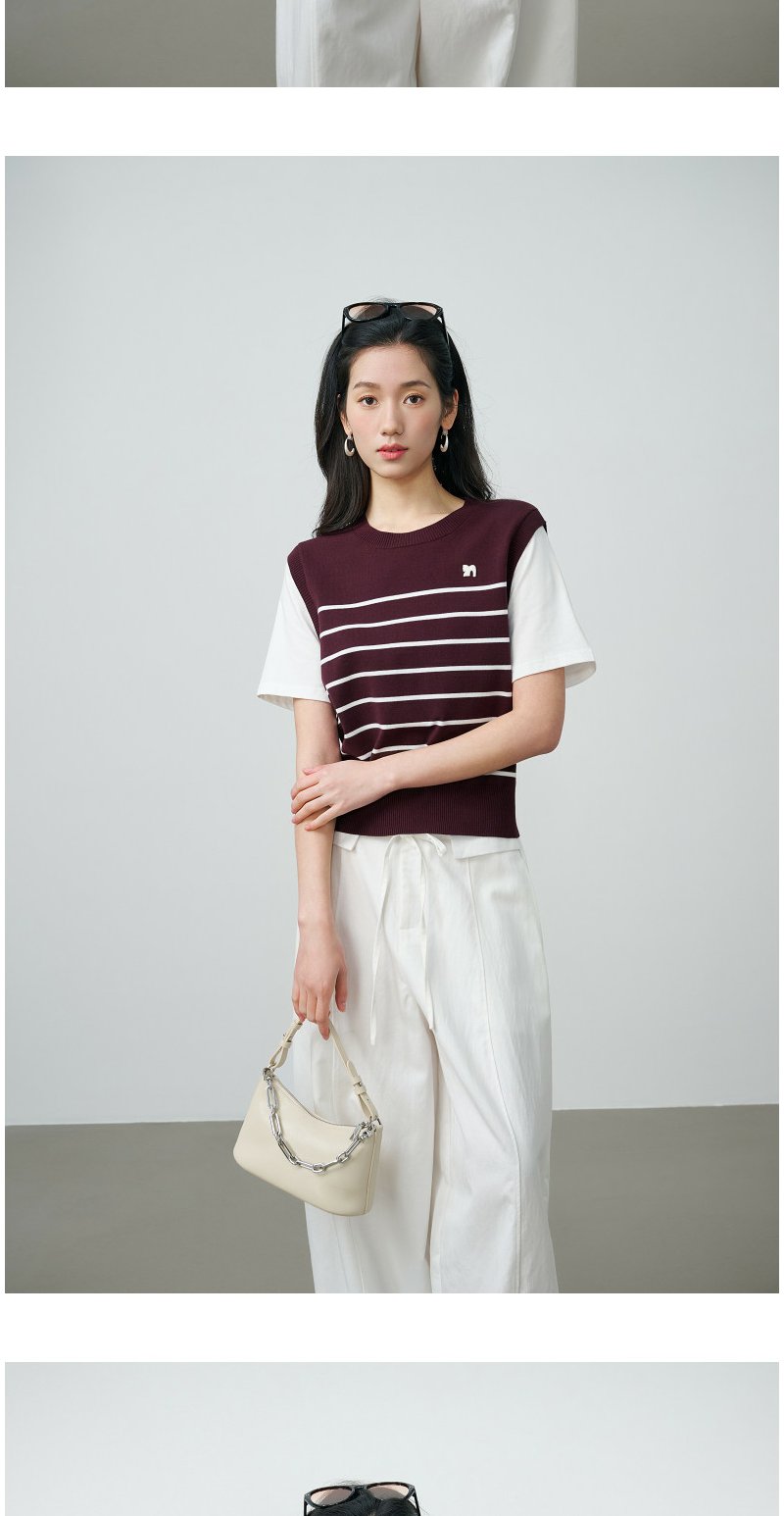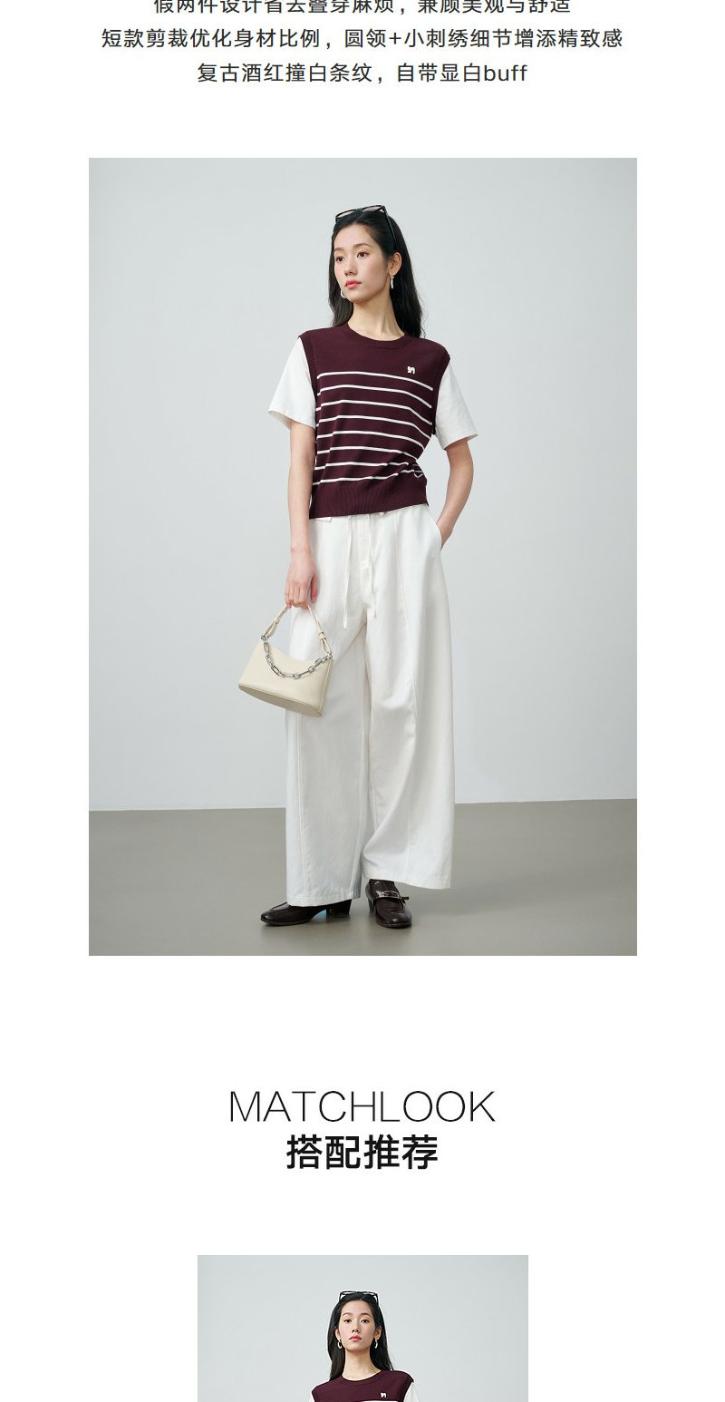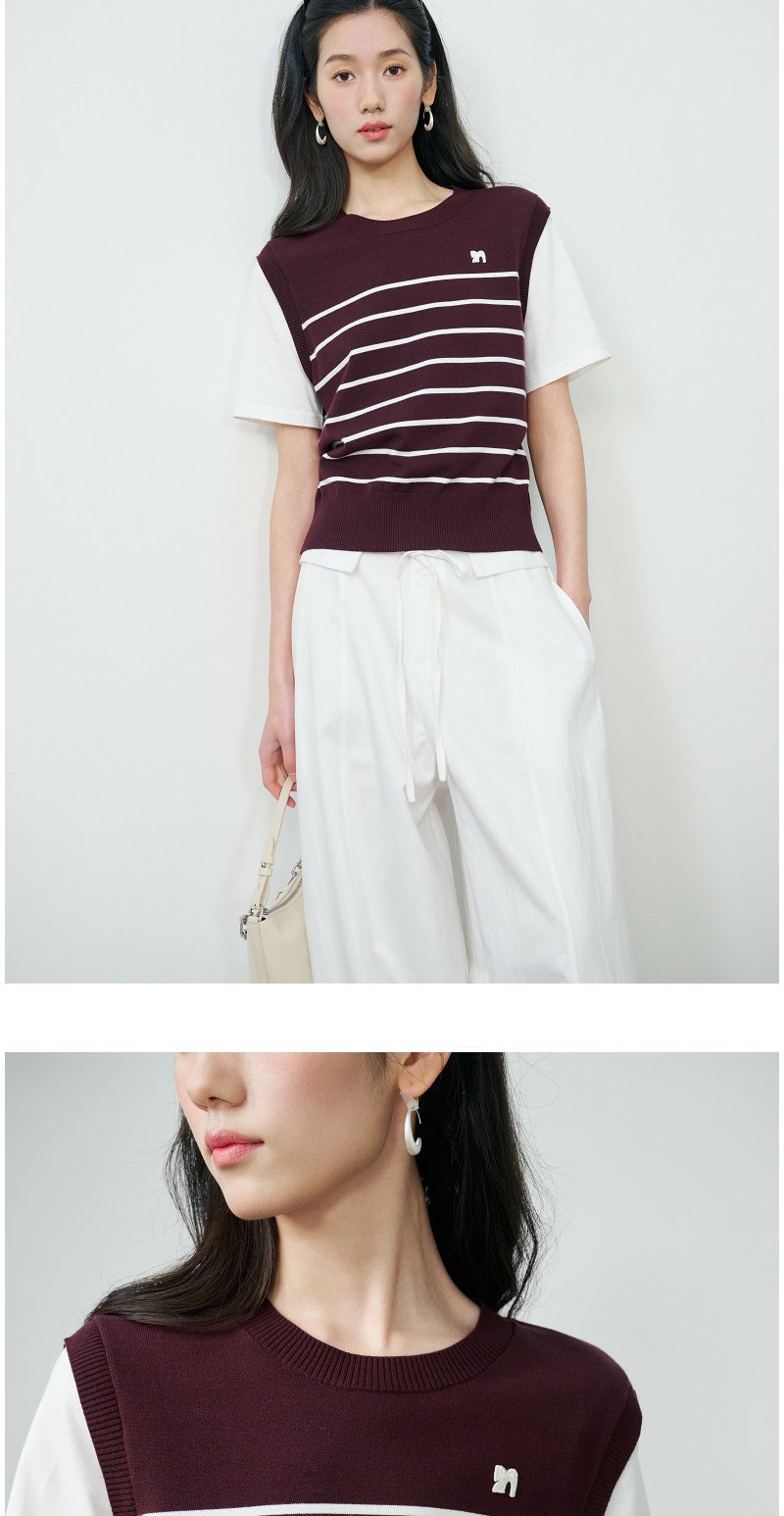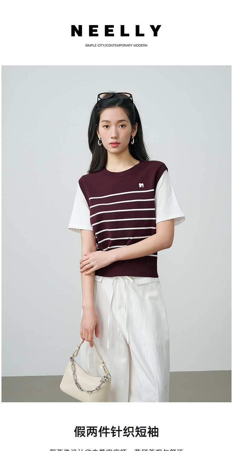 NEELLY纳俪商场同款春新款休闲假两件针织短袖女简约撞色随性上衣N26024A04408