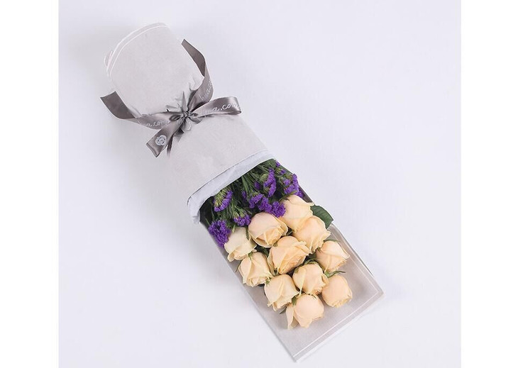 恰似你的温柔---香槟玫瑰11枝、深紫色勿忘我0.3扎 素染纸-浅灰2张,雪梨纸0.5张,银灰色logo缎带1米,魔力铁山灰盒(小)1037