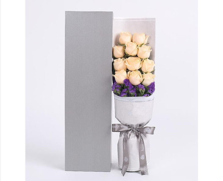 高档礼盒装鲜花:香槟玫瑰11枝、深紫色勿忘我0.3扎