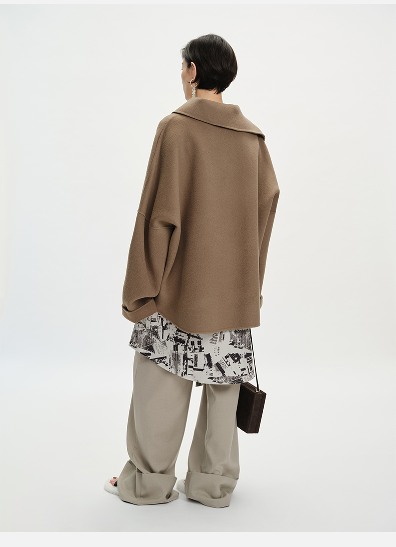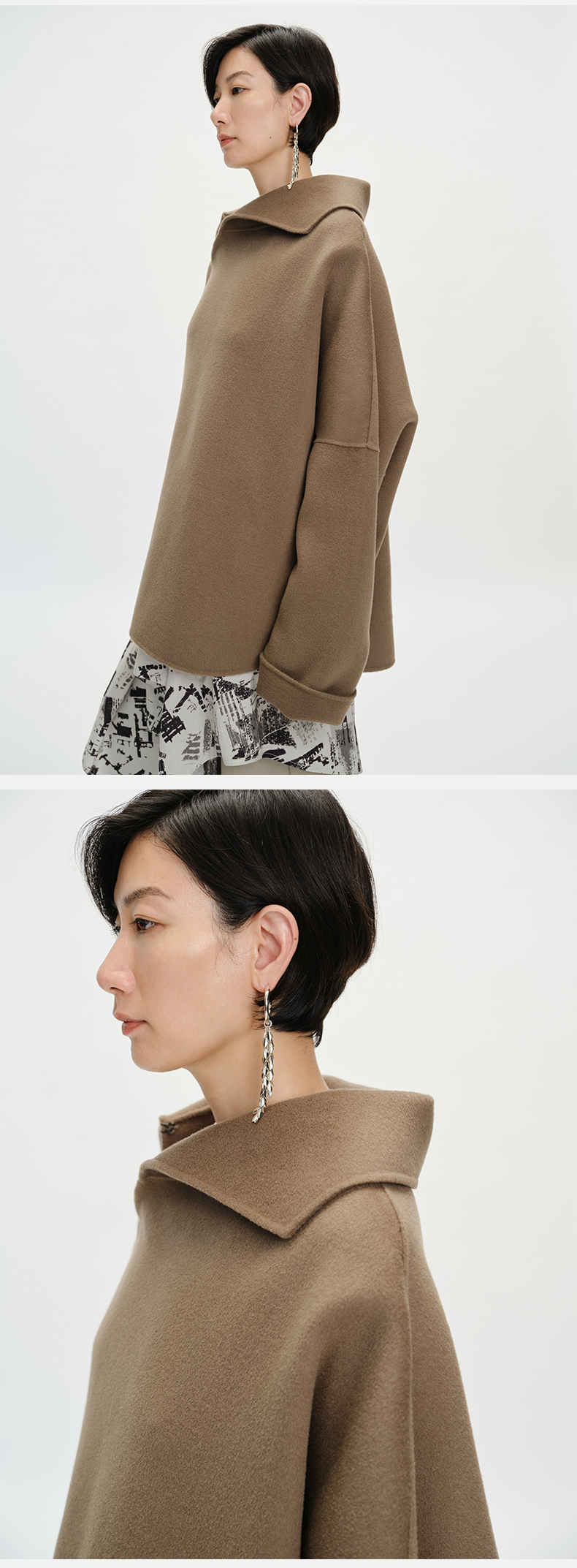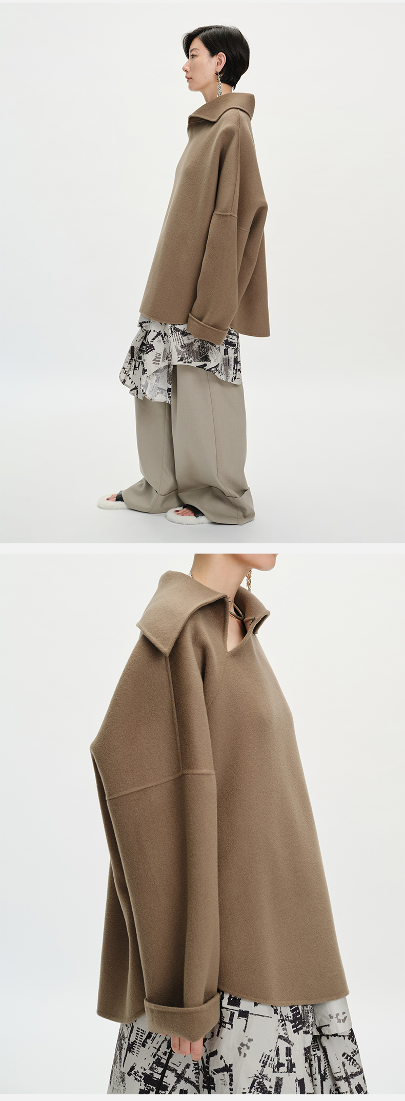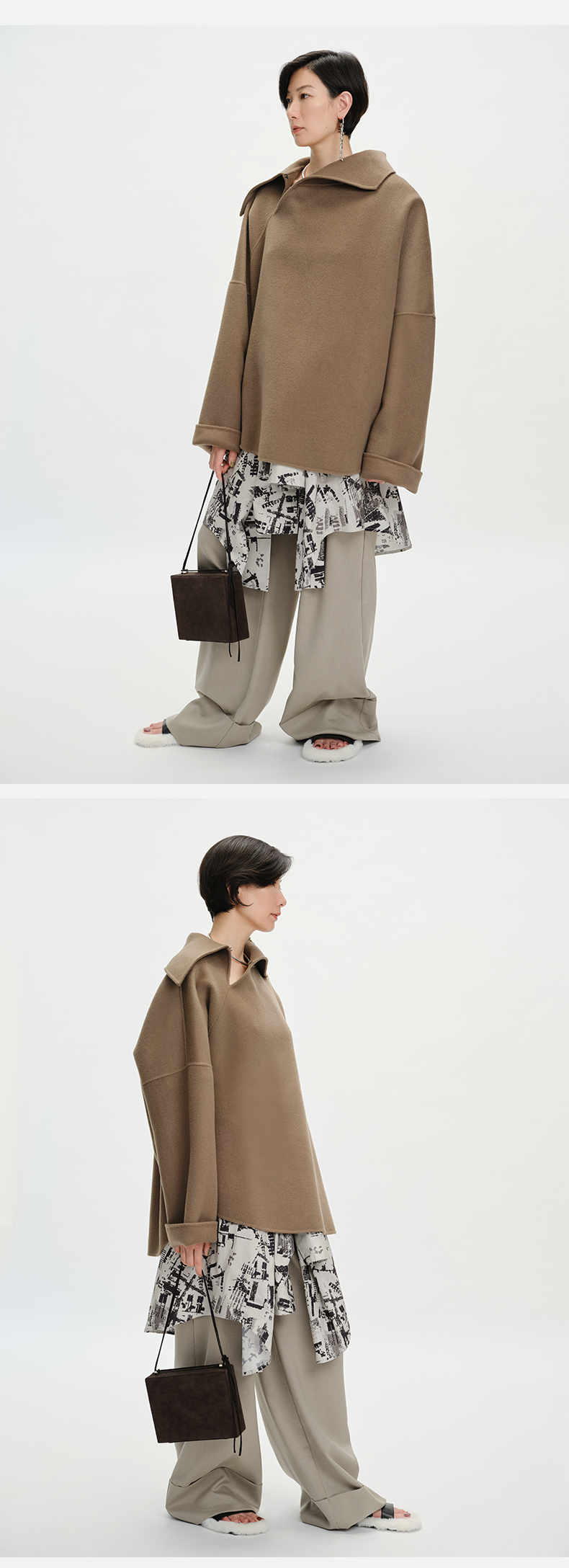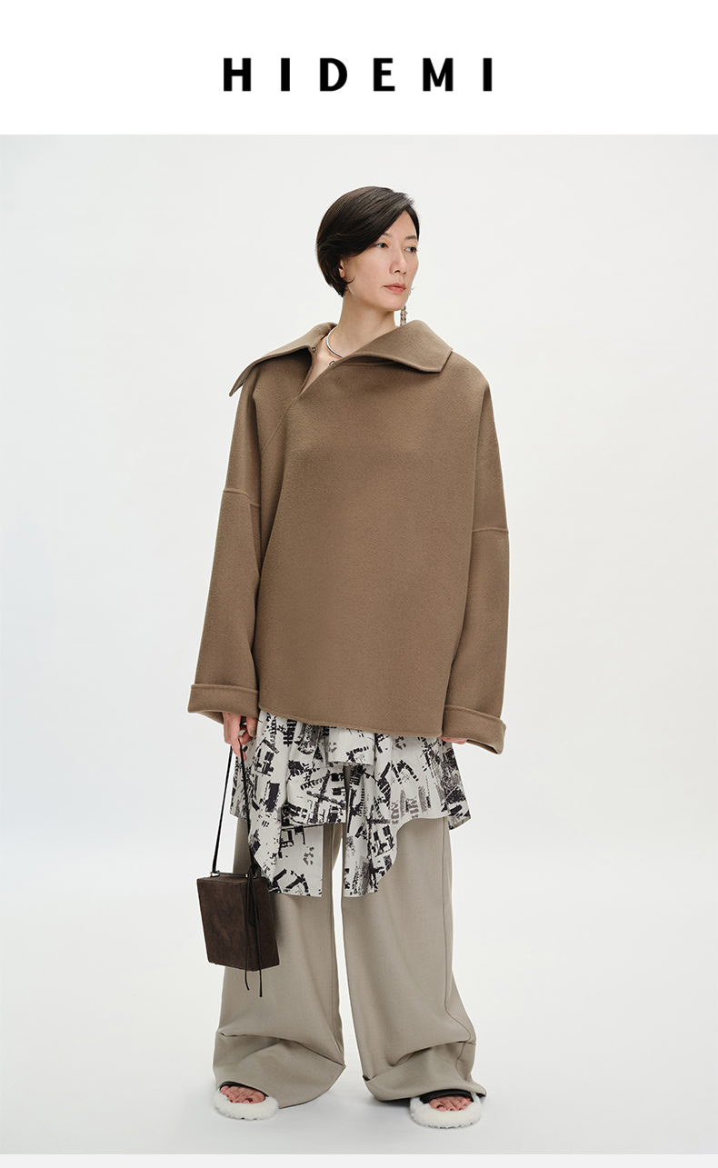 HIDEMI 美利奴双面羊毛不对称翻领大廓形套头大衣外套