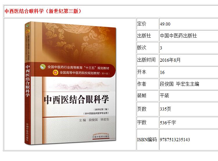 中西医结合眼科学 新世纪第3三版 全国高等中医药院校规划教材 第十10版 段俊国 毕宏生 中国中医药出版社 供中西医临床医学专业用
