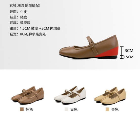 一字扣带设计 它的闭合方式超级便捷 一秒就能学会如何穿脱 再也不用担心鞋带散乱的尴尬了 鞋面采用牛皮 柔软舒适耐刮 内里则加入了猪皮革和海波力鞋垫,走起路来软软的 3CM内增高+1.5CM跟高 简直就是小个子的天菜 无痛增高4.5CM!!! 防滑橡胶大底 不仅好看,更是安全便捷的代名词 防滑耐磨 不用当心打滑!!!
