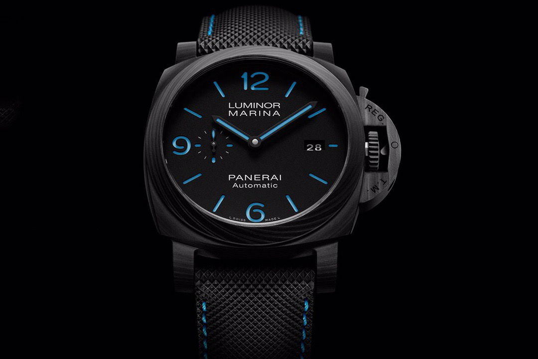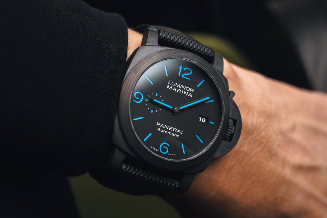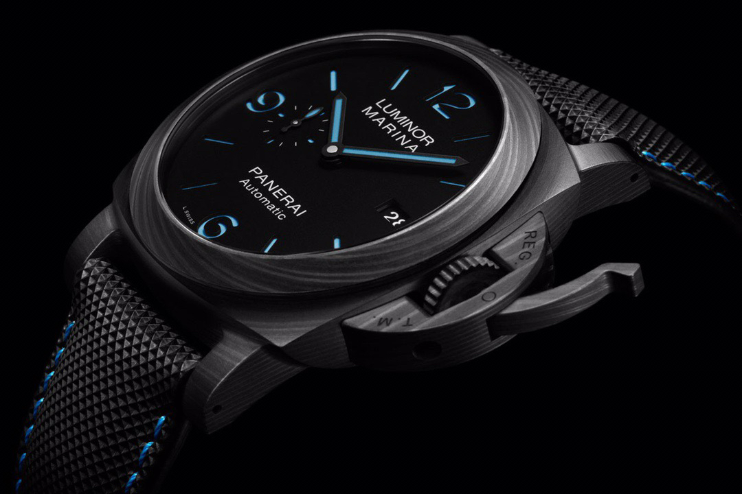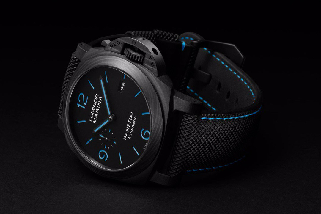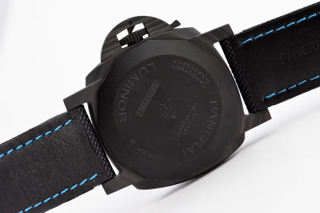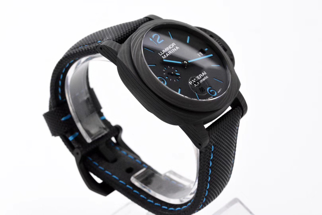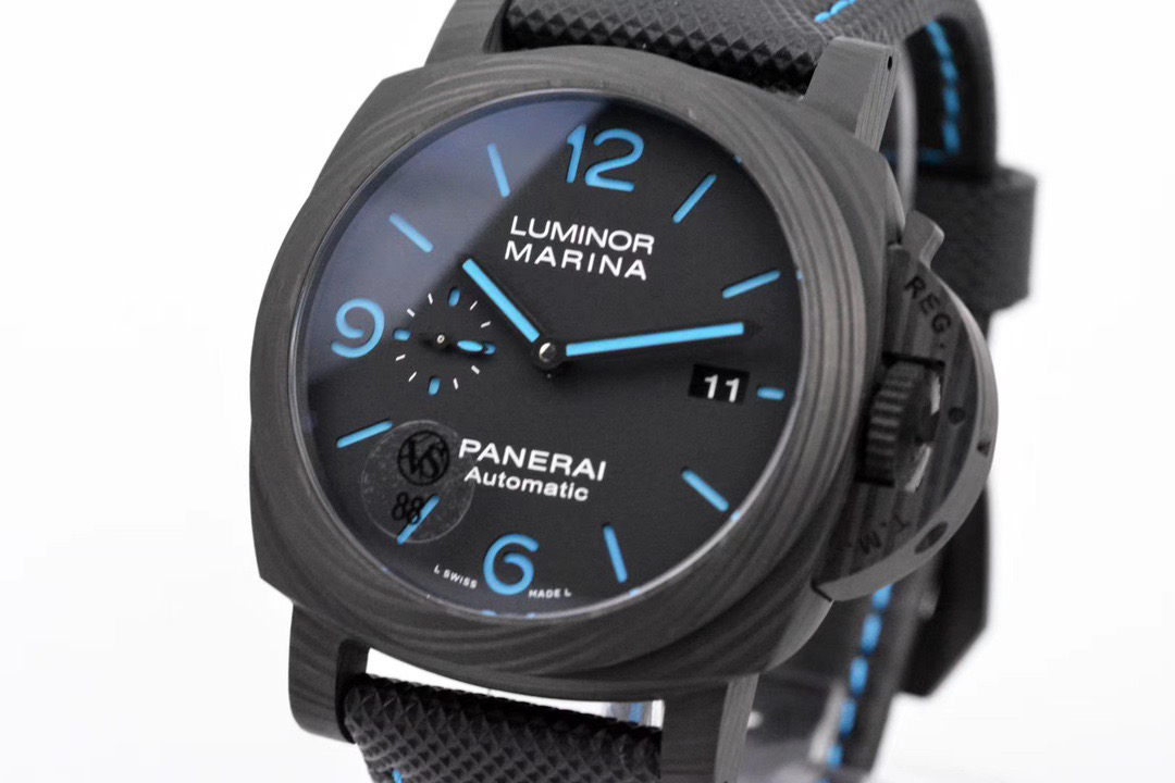 VS佩纳海2020全新庐米诺系列碳纤维腕表-44毫米PAM01661,正品需要排队预定的款式。轻量化碳纤维表壳,经典三明治表盘搭配蓝色超级夜光涂层,搭配沛纳海防水材质黑色表带,蓝色缝线。强悍的内心化为微光,指引前路的方向。