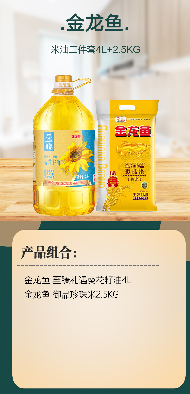 金龙鱼米油面组合(胡姬花锦衣玉食花生油1.8L*1 金龙鱼阳光葵花籽油1.8L*1 金龙鱼乳玉皇妃凝玉稻香贡米2.5kg*1 金龙鱼御品麦芯粉1kg*1 金龙鱼爱心桃花小米400g*1)