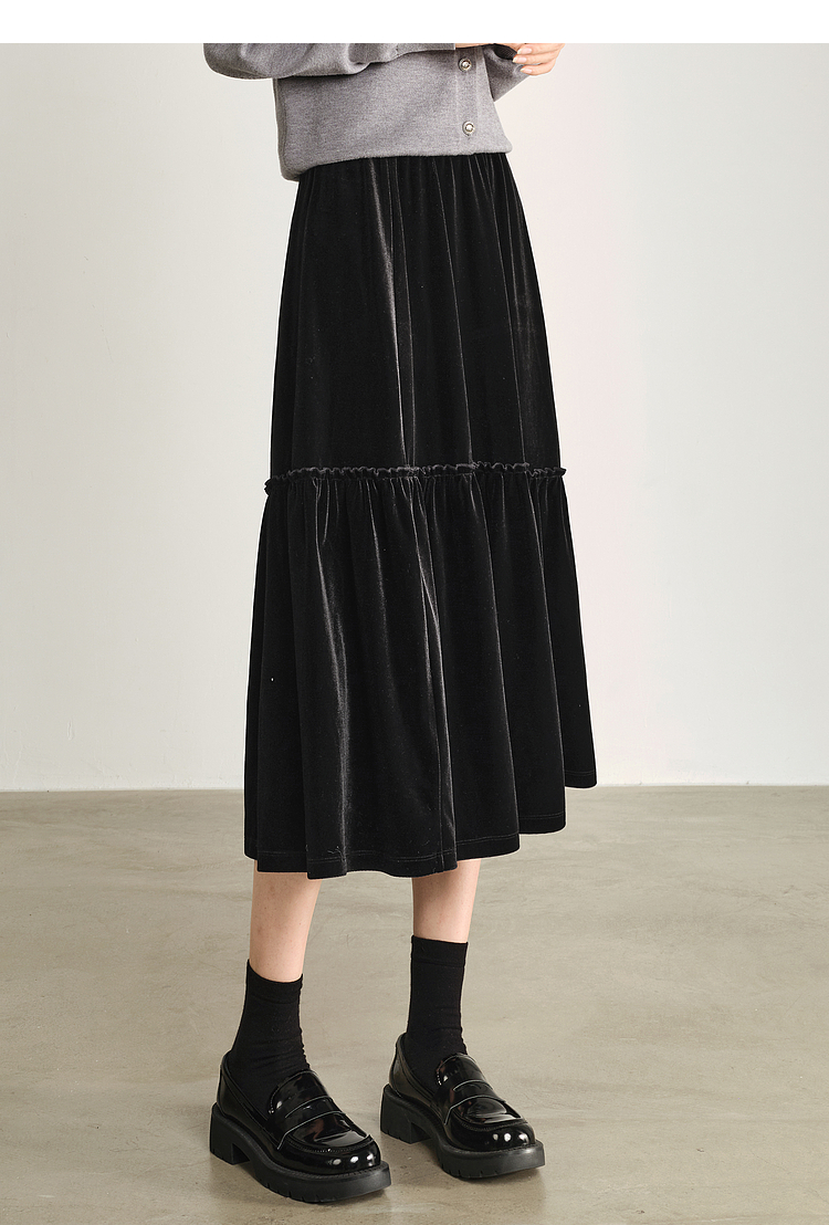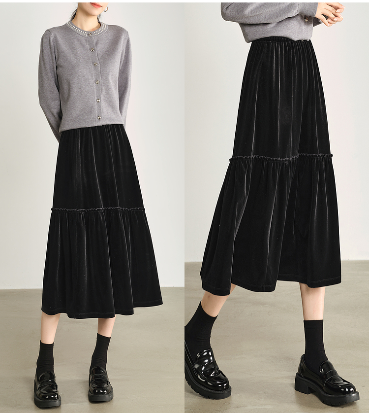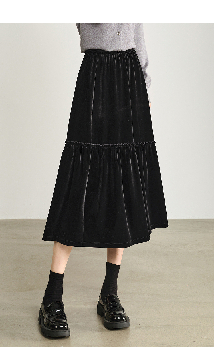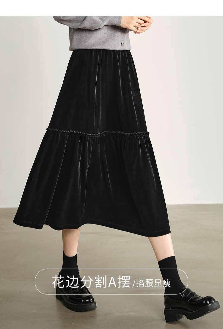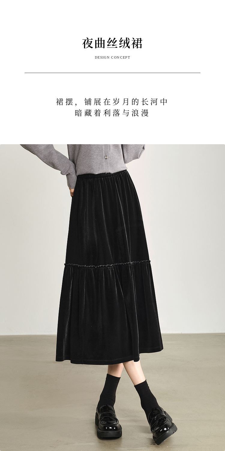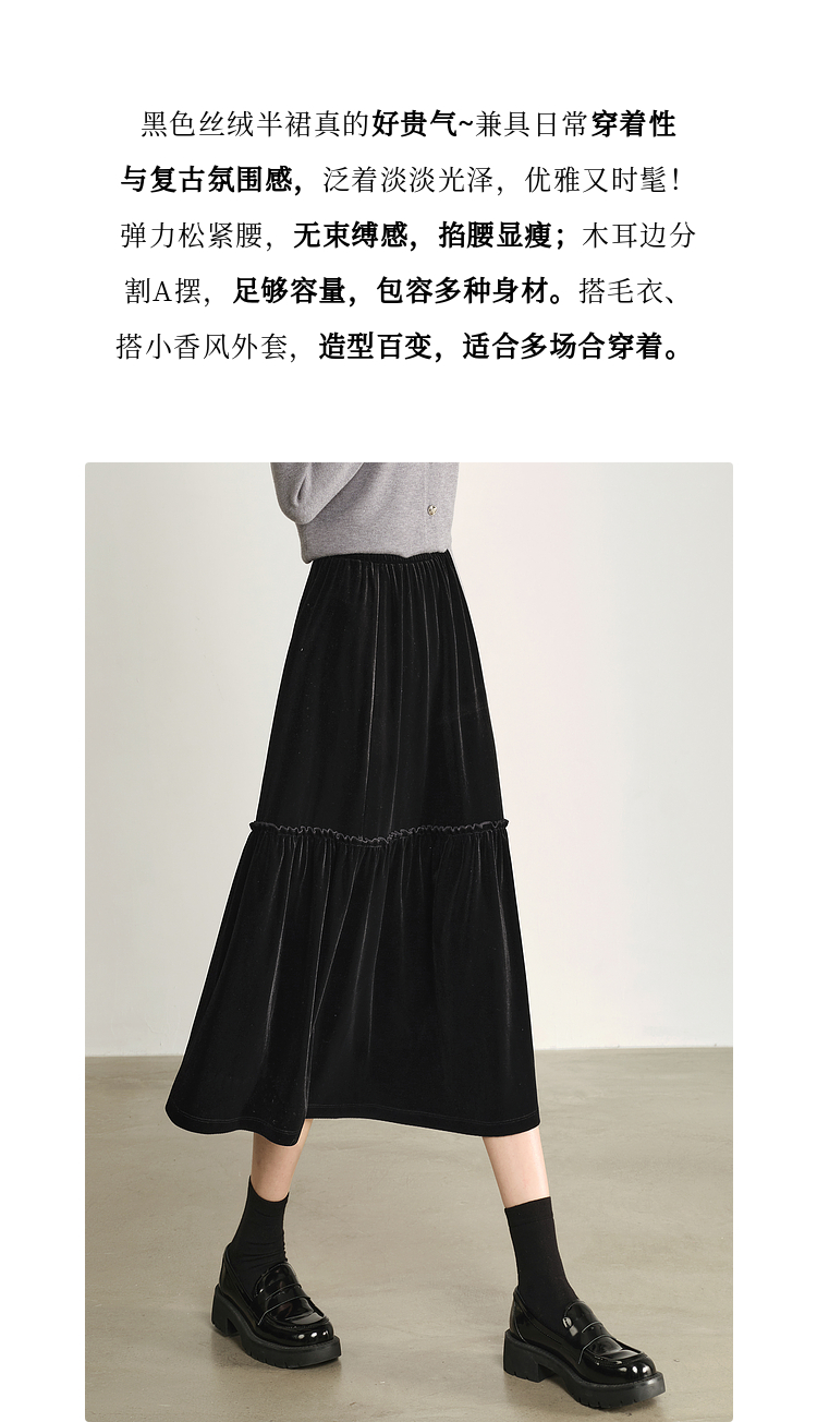 【1件75折】熙世界复古黑色金丝绒半身裙女2025新款冬天配毛衣大摆a字伞裙