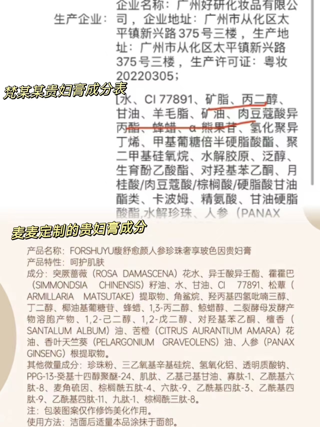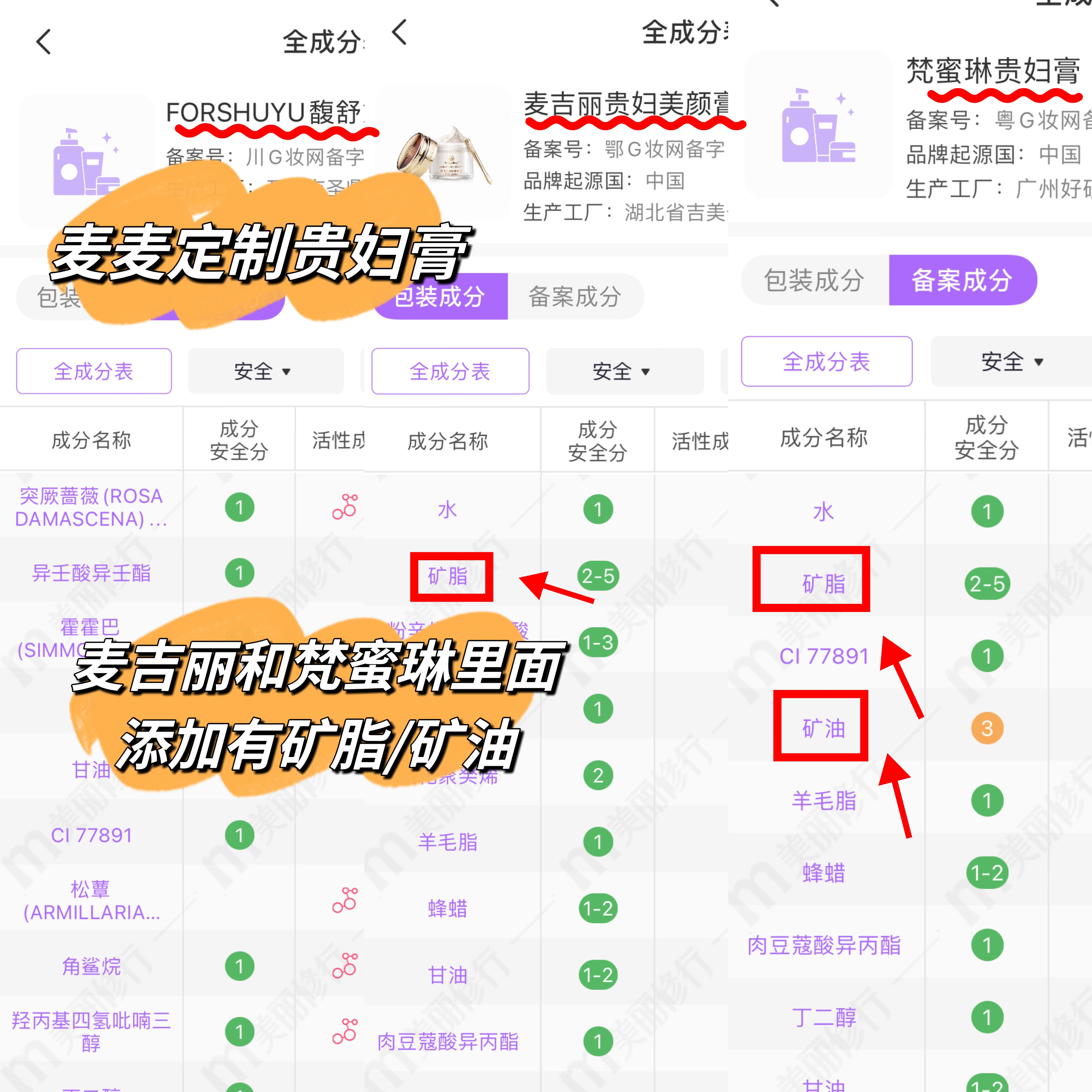 附上配方的对比图,大家可以看到麦吉丽和梵蜜琳品牌的主油相是矿物脂/矿物油这类