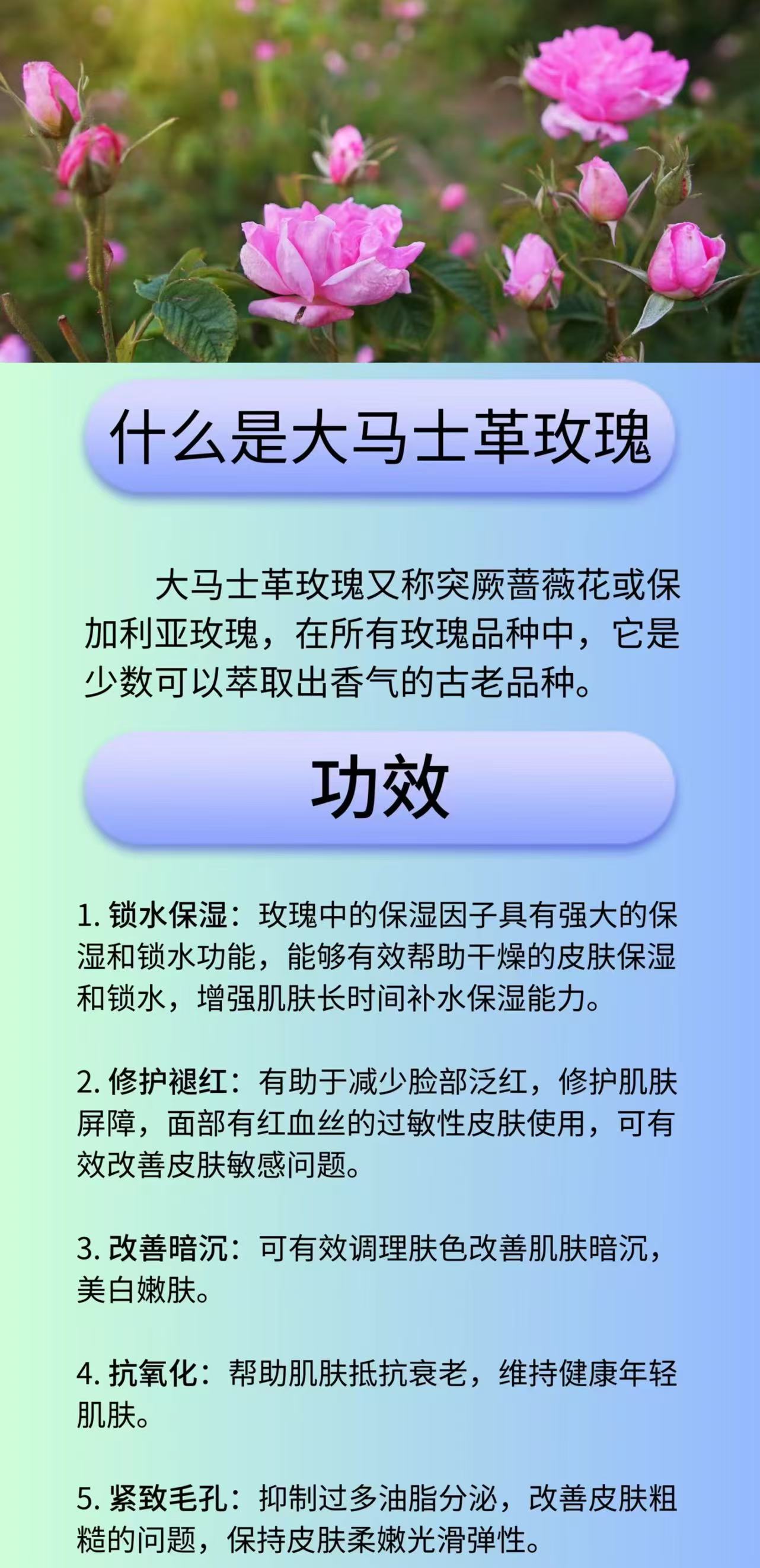 其他日化线产品无一例外的都是选择用“水”,而我们选择的是合作基地通过蒸馏出的高比例“大马士革玫瑰纯露”来替代水