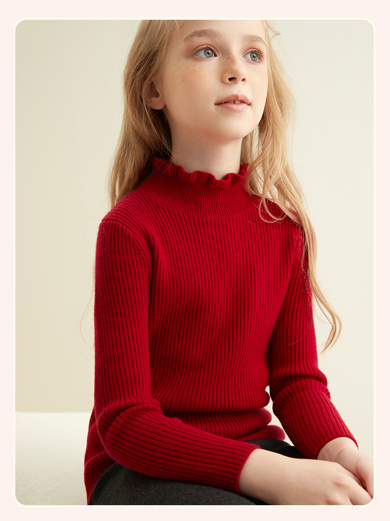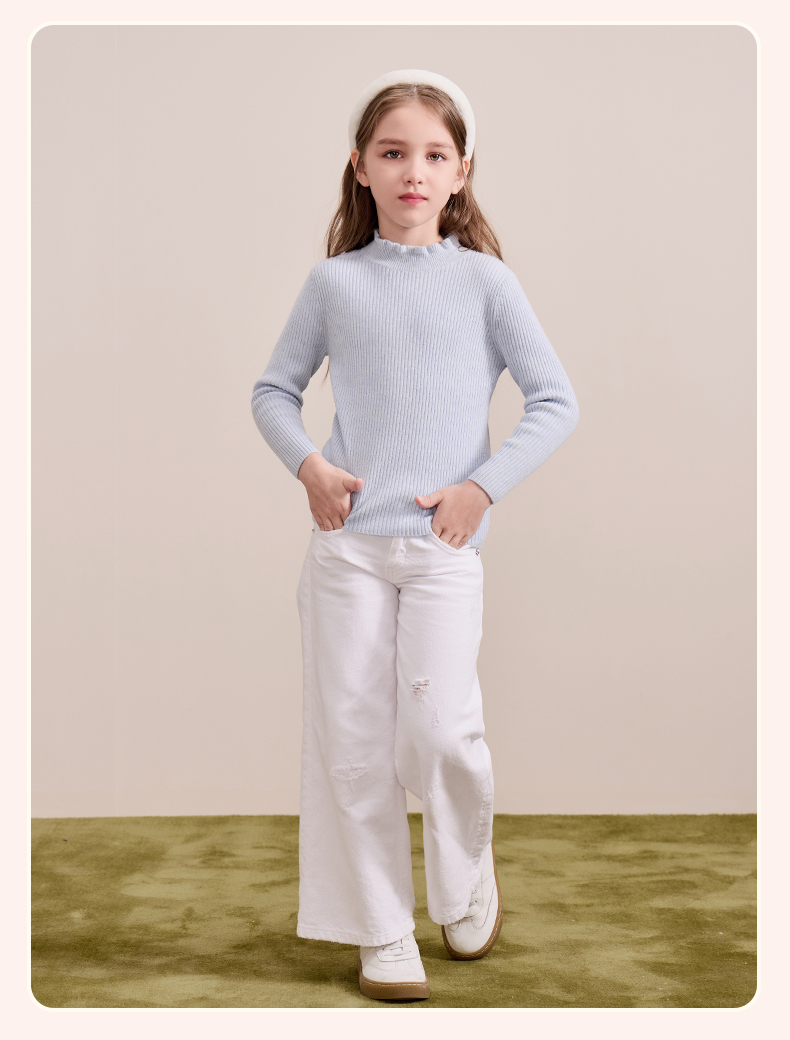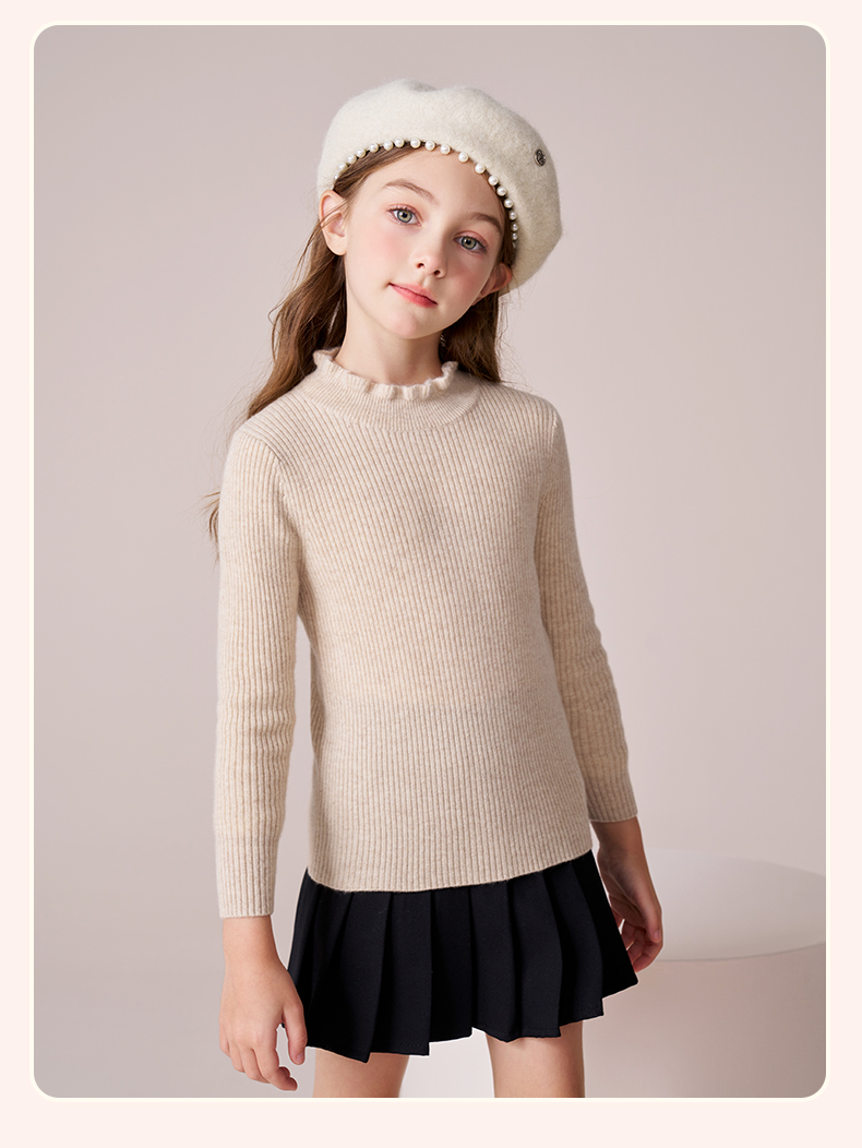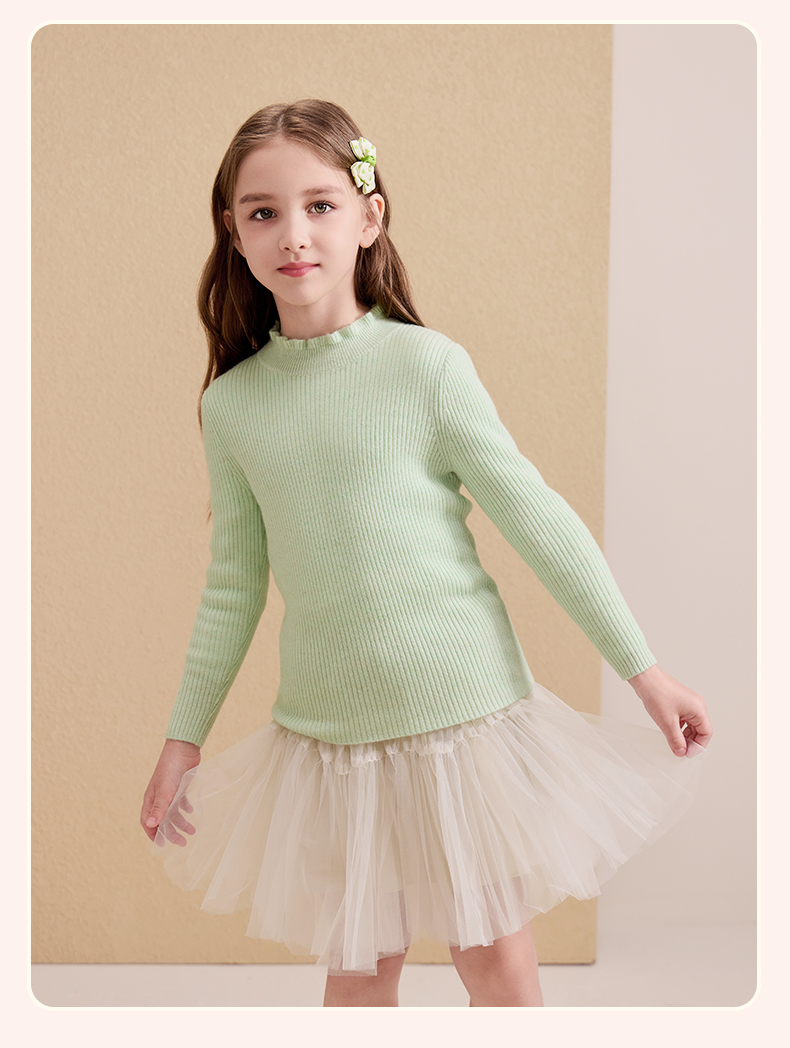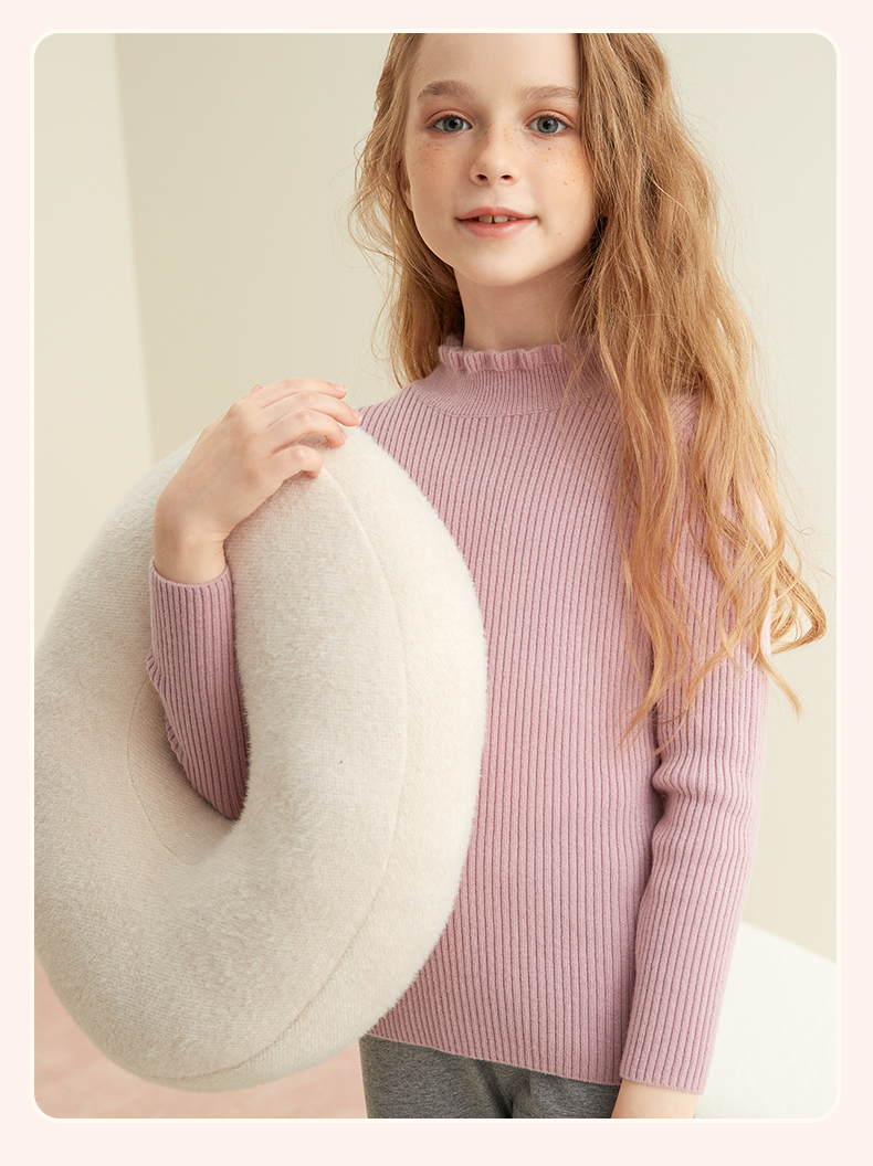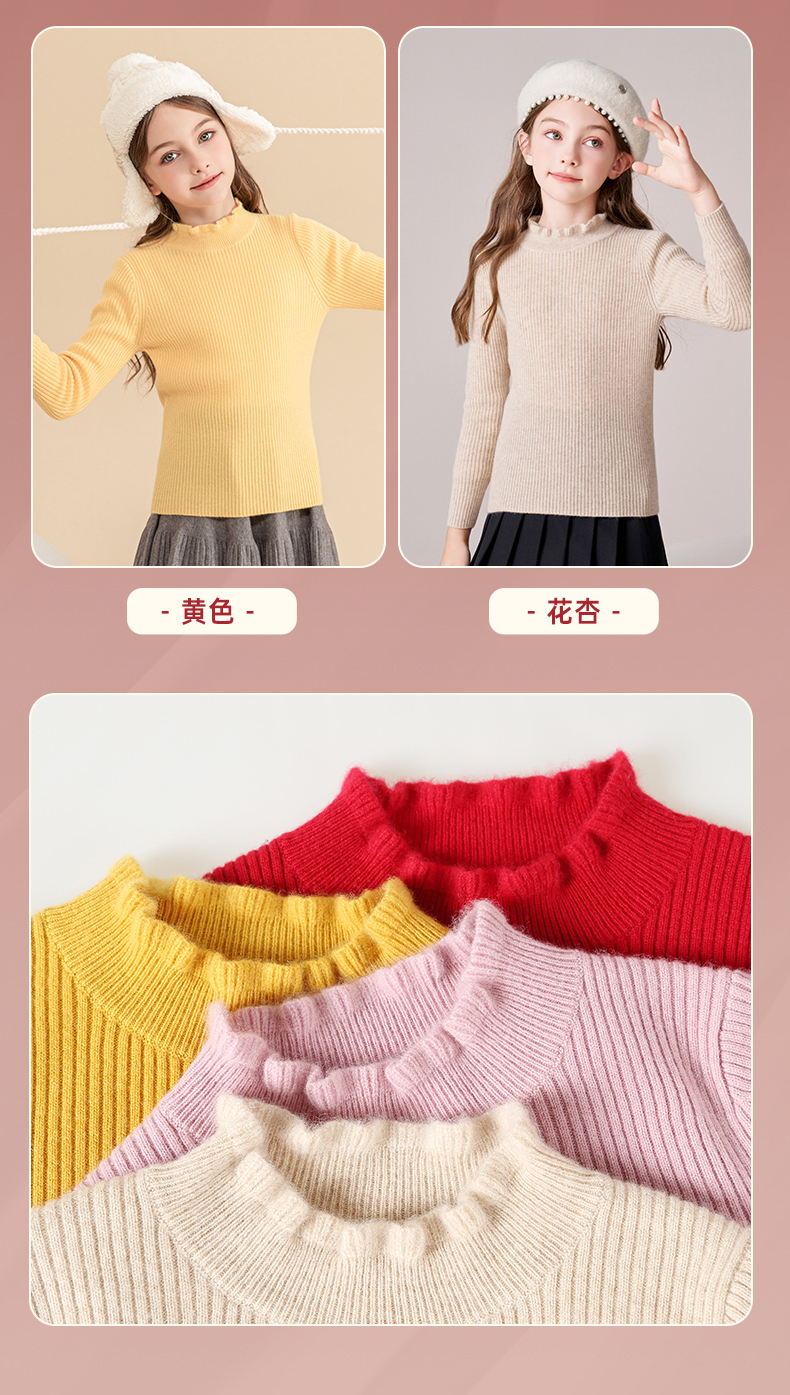 儿童100%羊绒衫女童毛衣粉色半高领秋冬花边领中大童打底衫针织衫